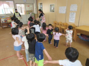 お部屋ではすみれ組の子どもたちと今週の金曜日に予定しているヴィラ光陽交流会にむけて歌やリトミックの練習をしました(^^♪交流会では「おじいちゃんおばあちゃんだいすき」とリトミックの「あまだれぽったん」を披露します♪