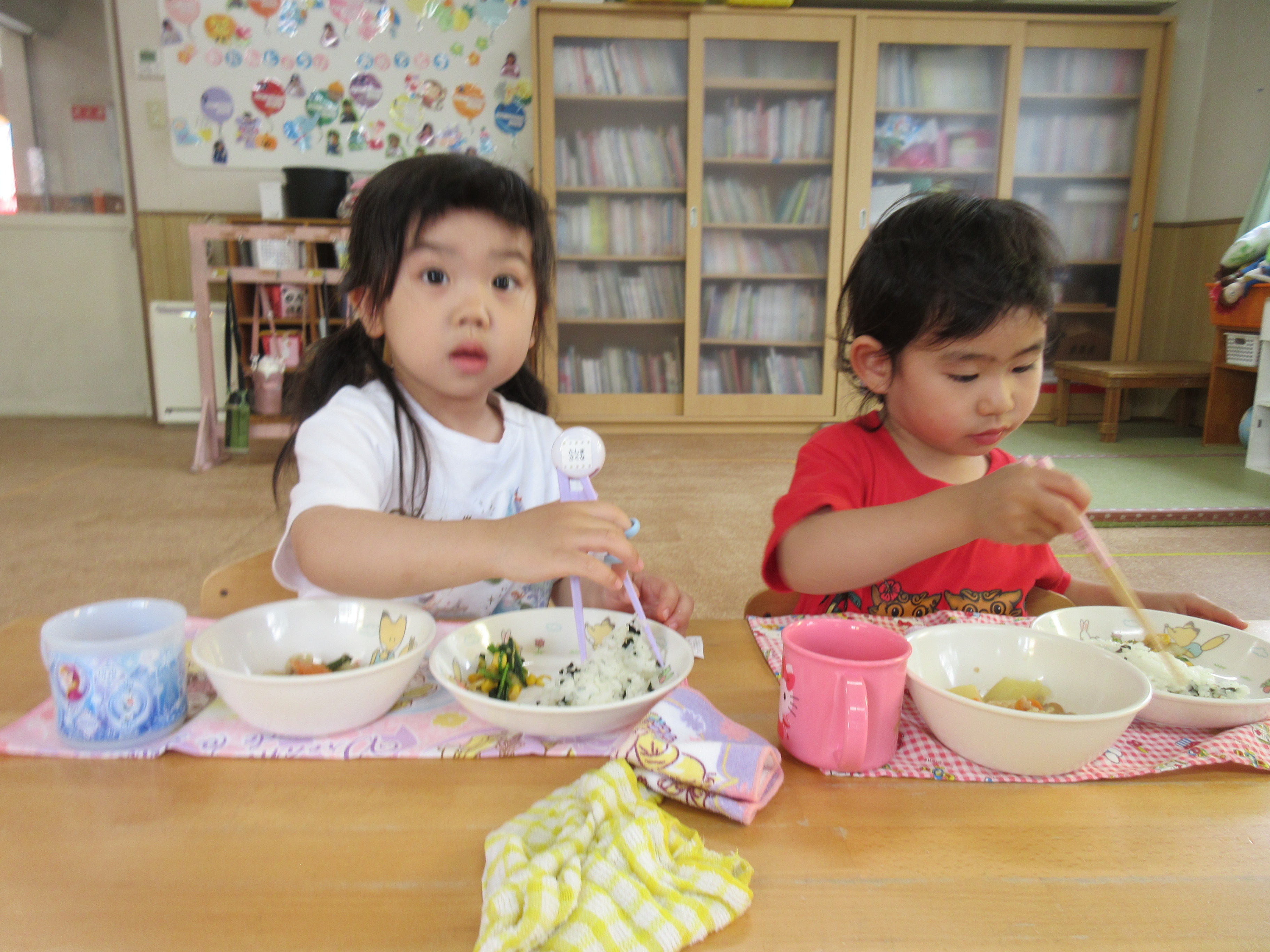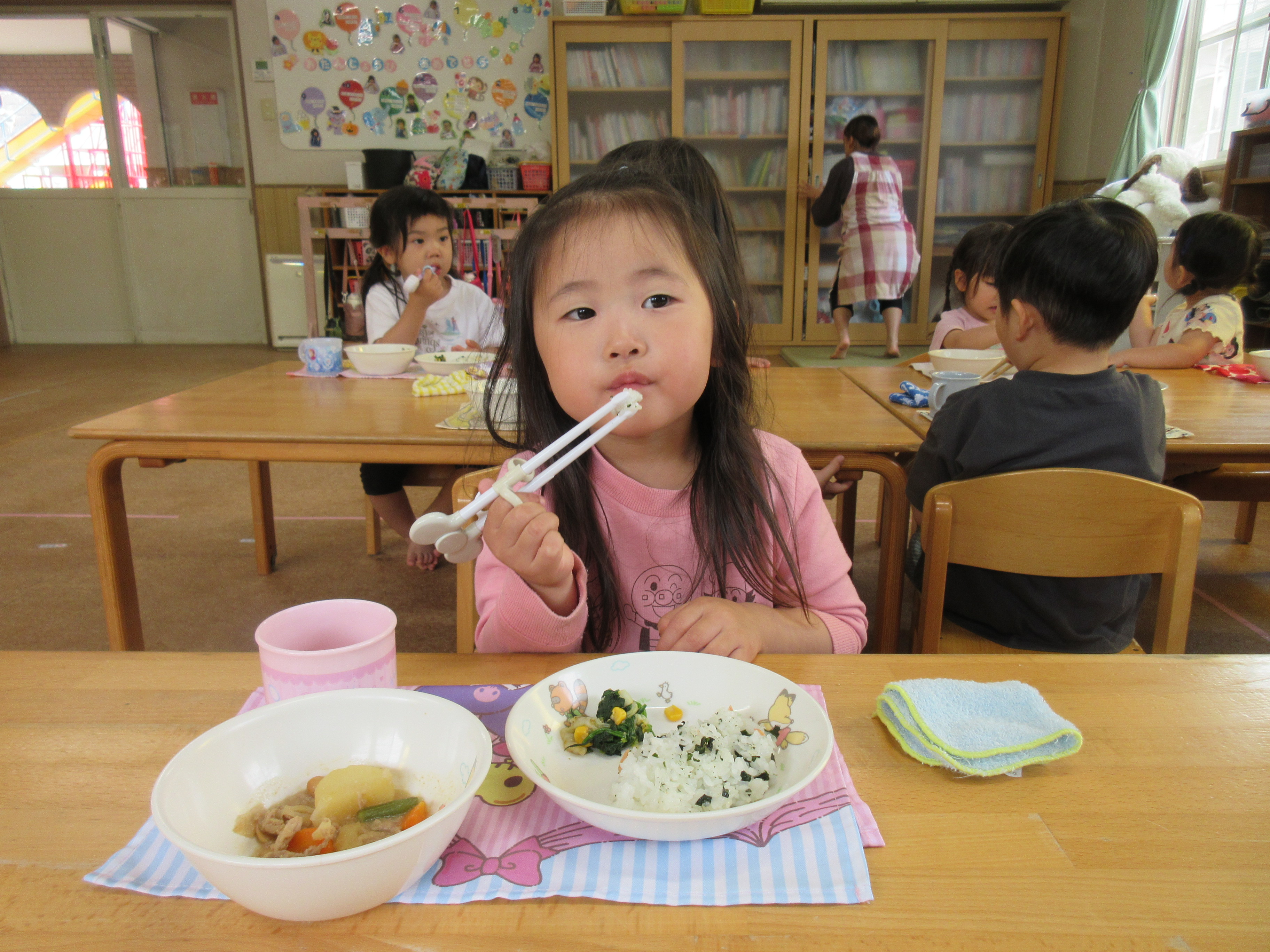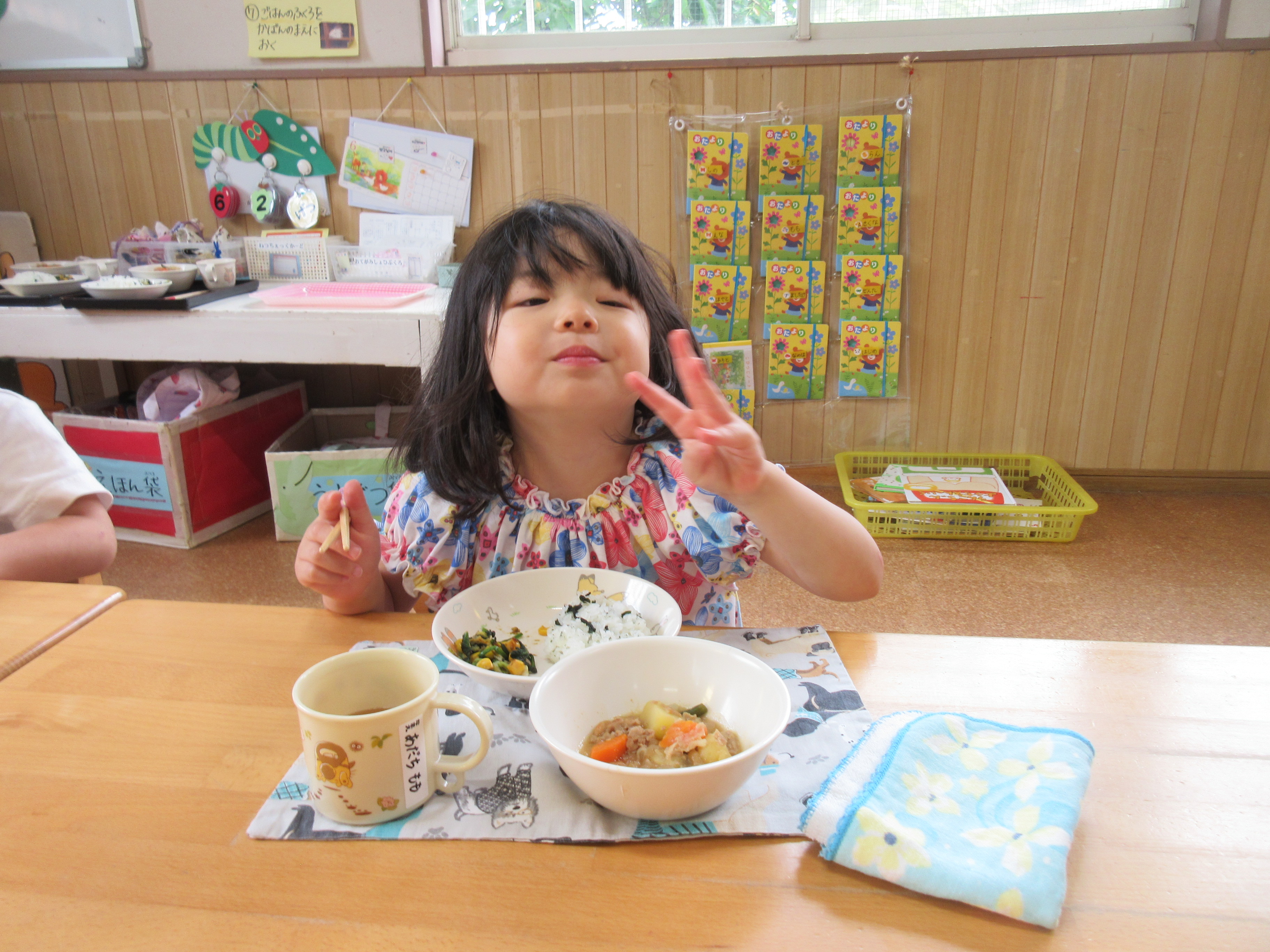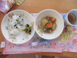今日の給食は肉じゃがとおひたしとごはんでした(^^)/多くお口で食べ進める子どもたちでした☆美味しかったね♪