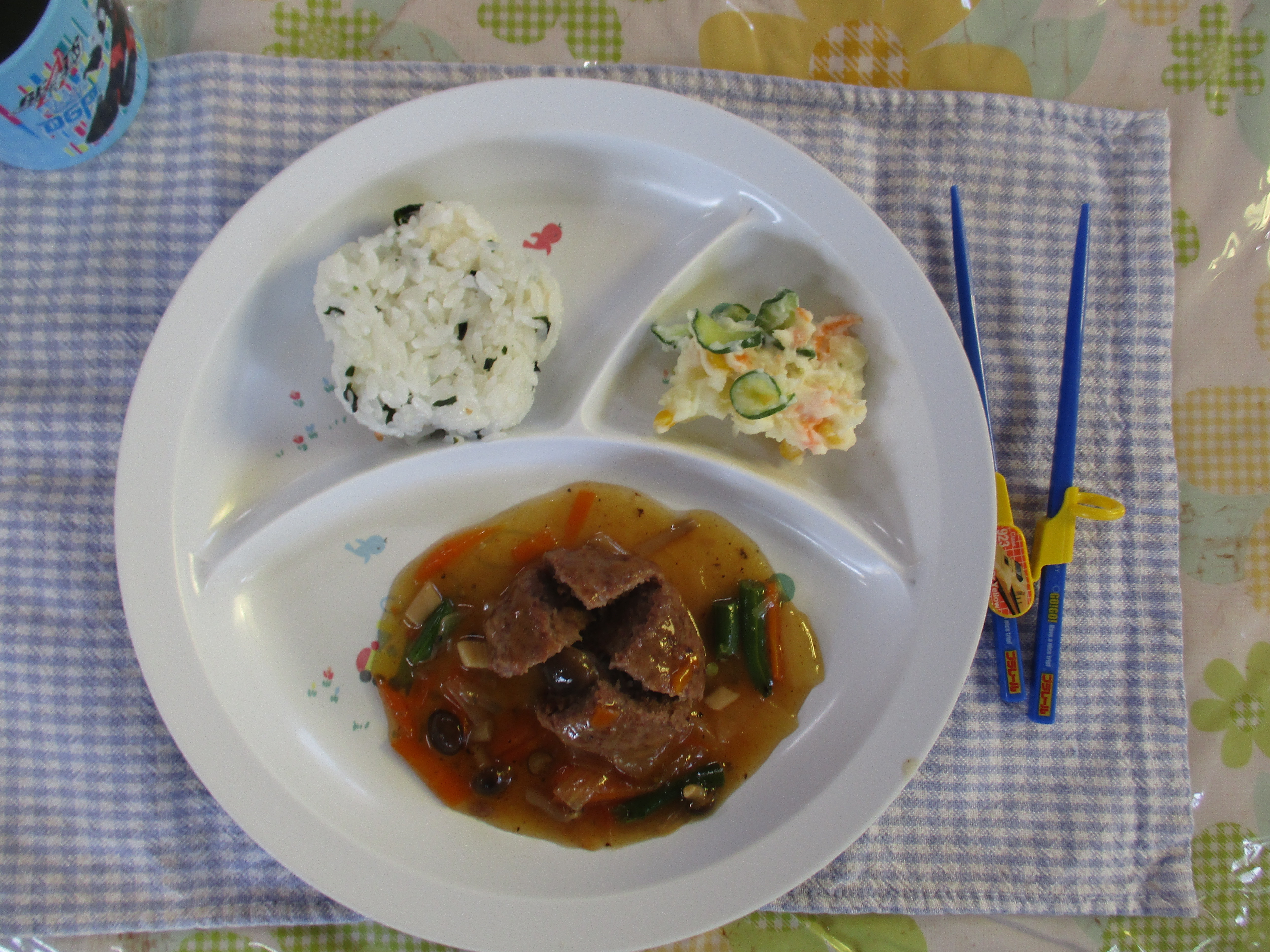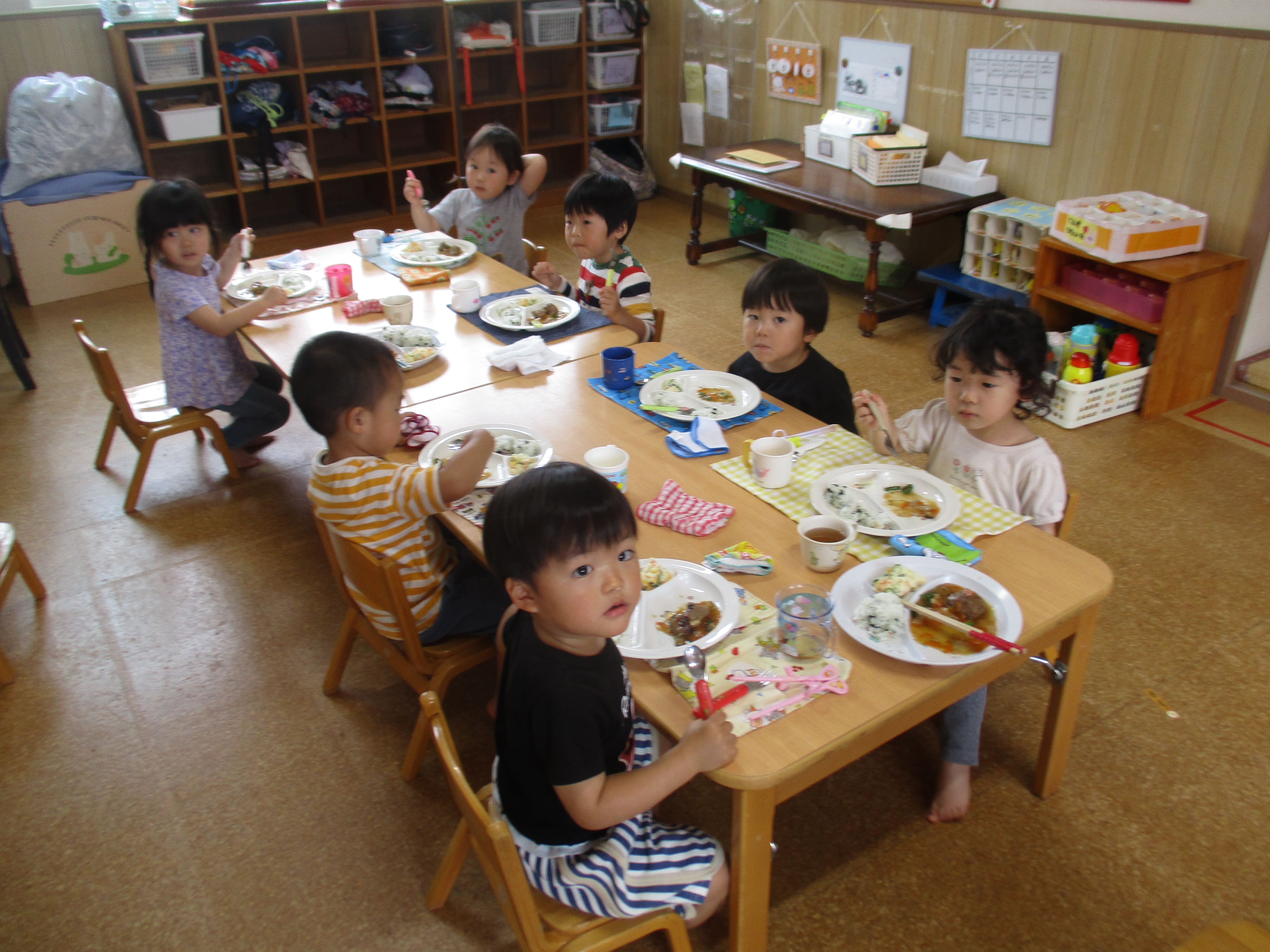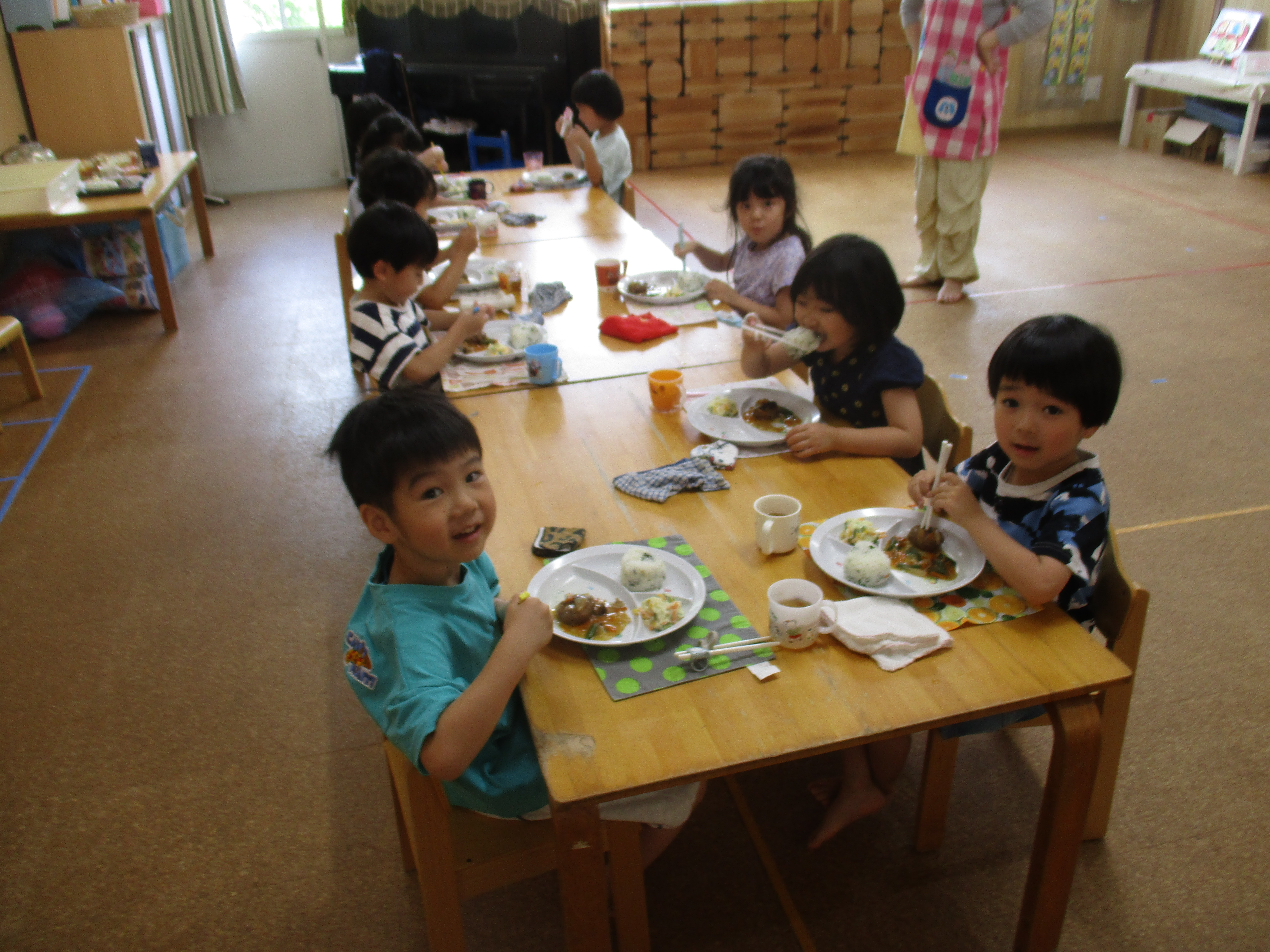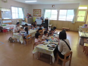今日の給食は誕生児の保護者様も一緒に食べました。保護者と一緒に給食を食べることが新鮮で楽しそうでした。