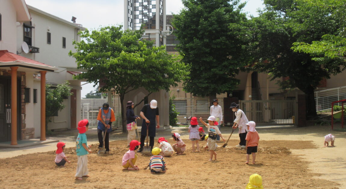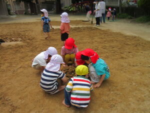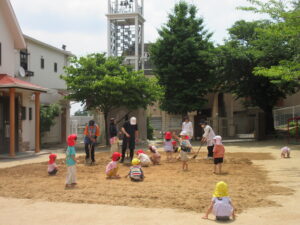 6月から裸足保育が始まりました。裸足で外あそびを楽しむ中で、土の感覚を楽しんでいたり、まだ土の感覚になれていないお友だちもいますが、少しずつ土に慣れようとしている姿が見れました。