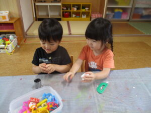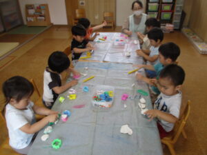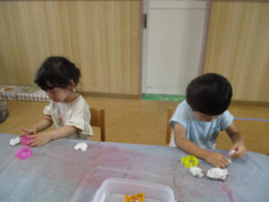 先週の水曜日は、みんなで粘土あそびをしました♪ 丸めてみたり、こねてみたり、型にはめてみたり・・・