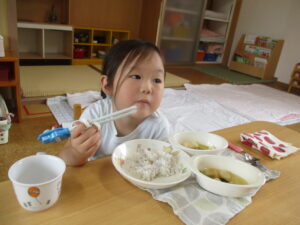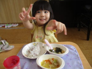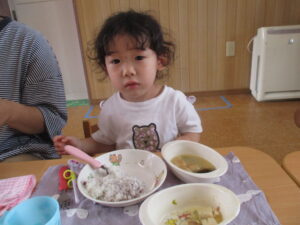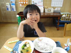 今日の給食は、ゆかりご飯、豆腐中華煮、みそ汁でした。みんな大きなお口を開け、モリモリ食べていました😊
