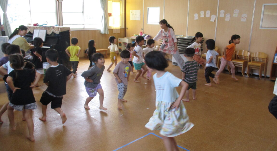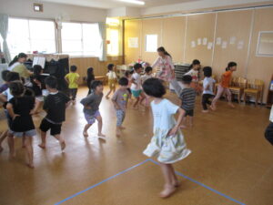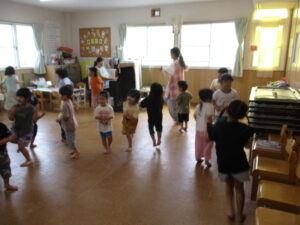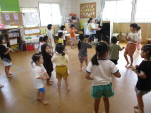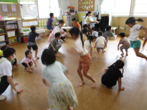 その後、リトミックをしました。ゆり組のお兄さんお姉さんの真似をしながら普段とは少し違う雰囲気を楽しんでいました。