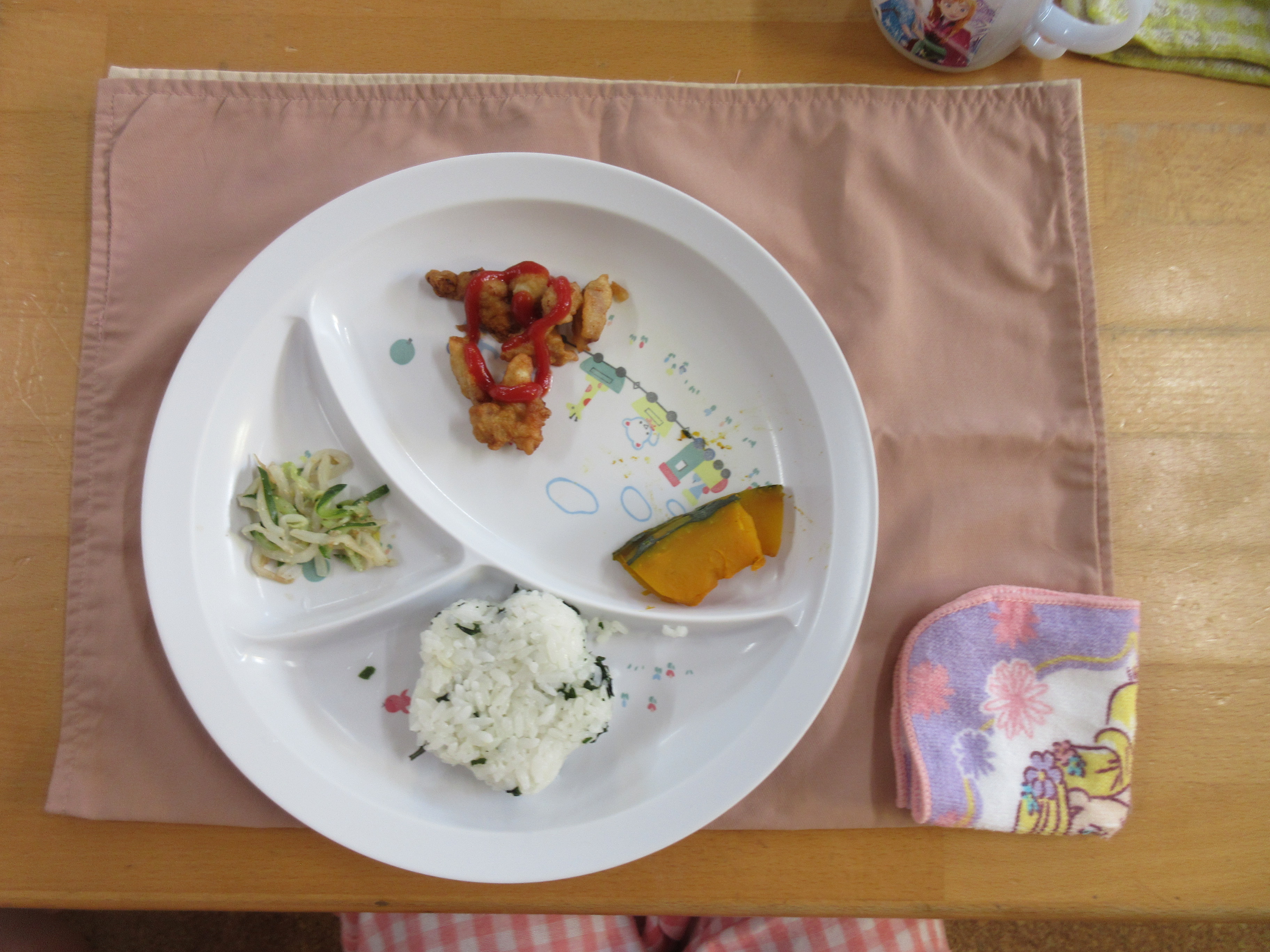 今日の給食は、おにぎり、豚天、南瓜煮、胡麻酢和えでした。