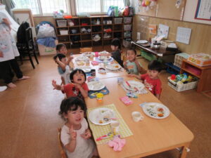 ひよこ・どんぐり組さんの給食の様子を見に行くと、大きなお口を開けて頑張って食べる姿が見れました。