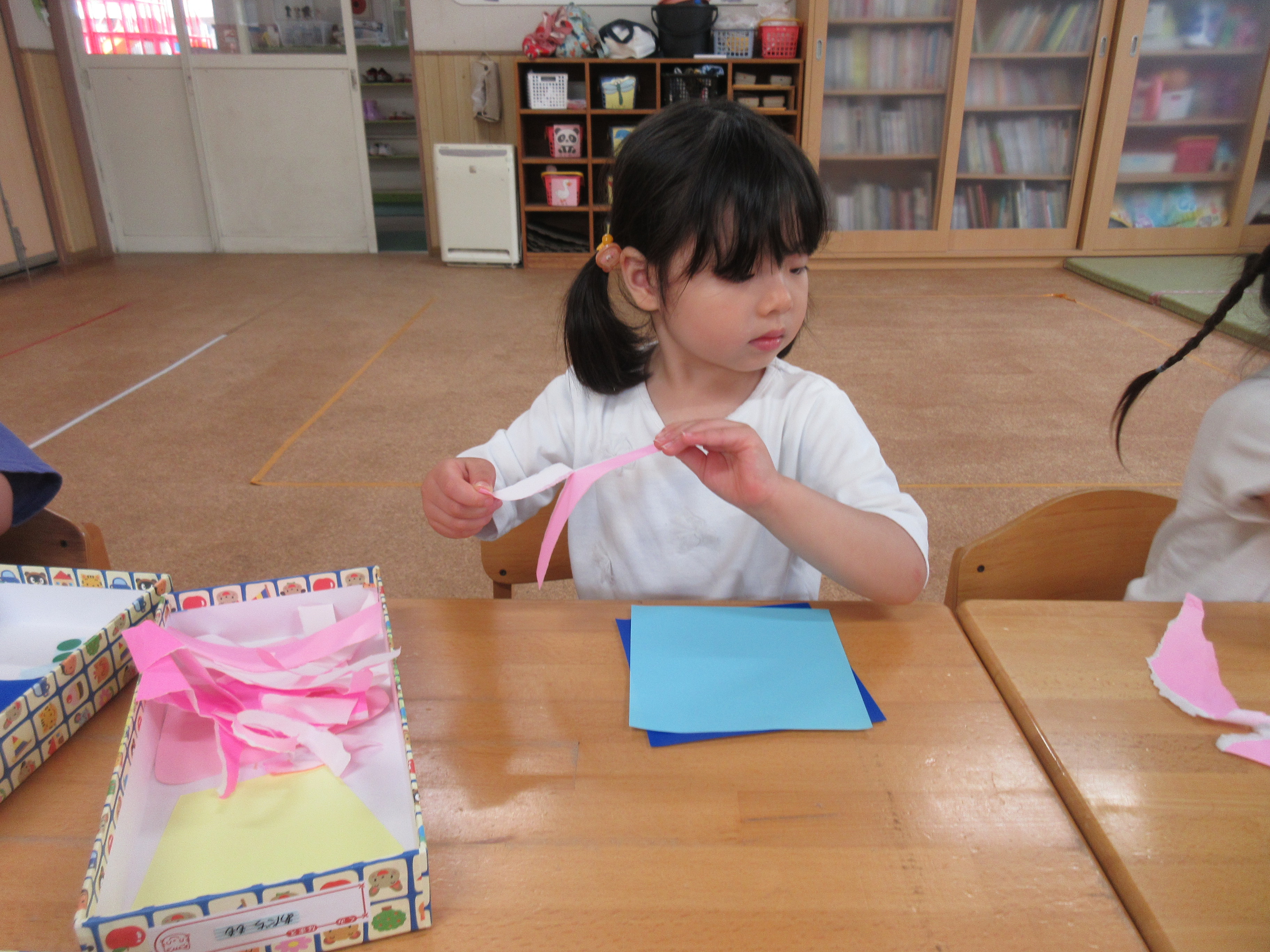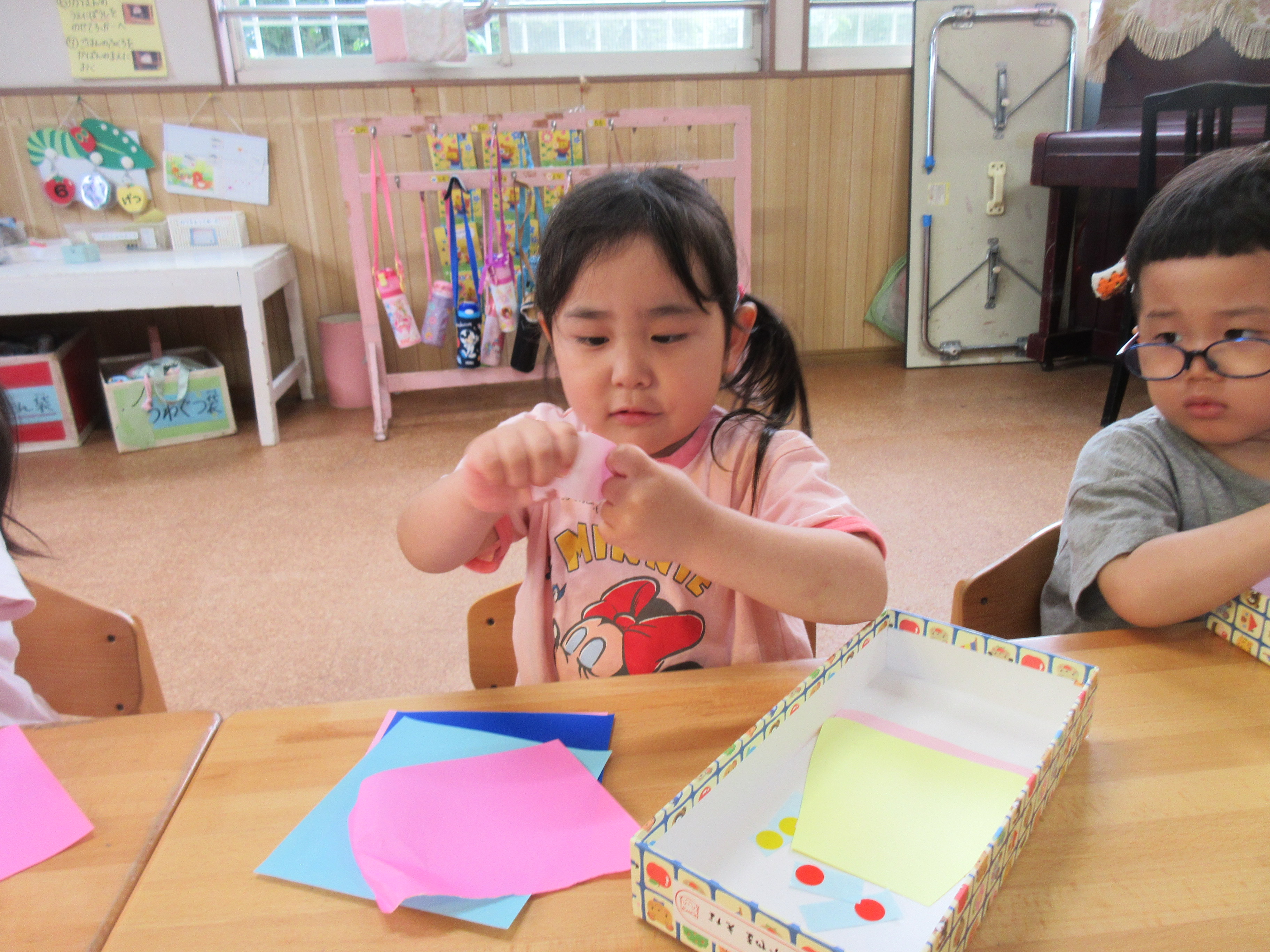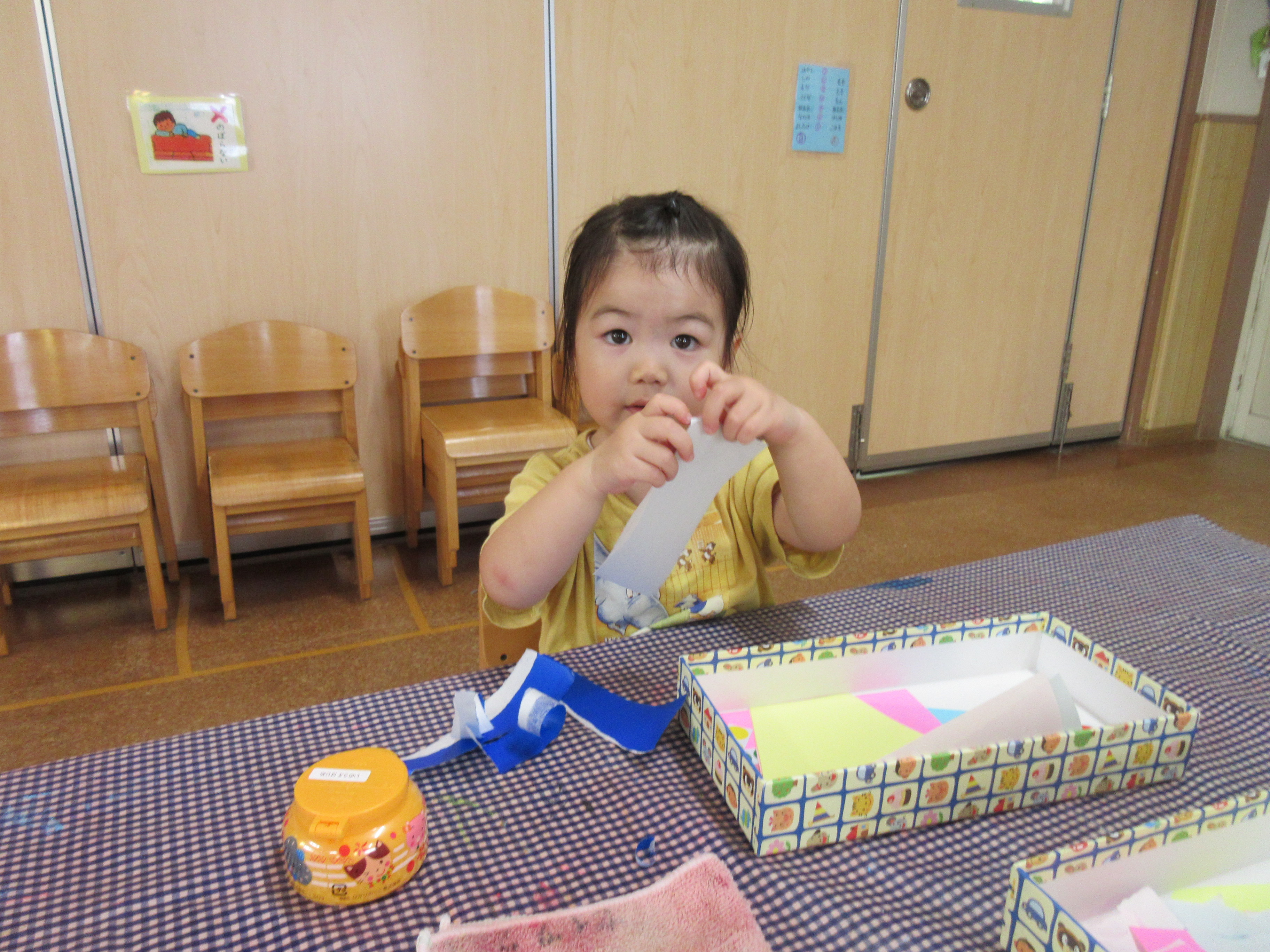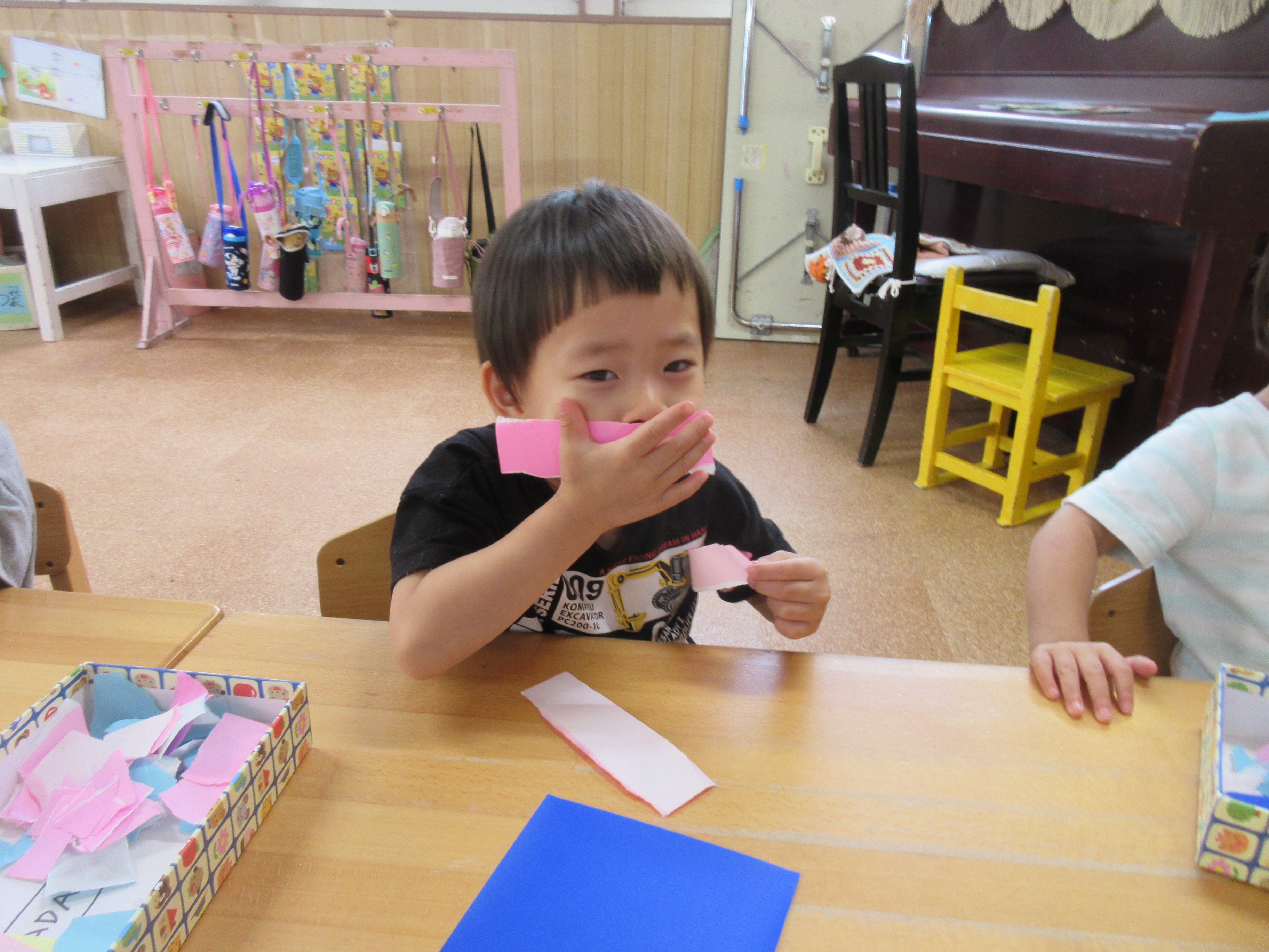 また、七夕にむけて織姫と彦星を作り、短冊にお願い事をかきました♡折り紙をちぎりお洋服に飾り付けをし、クレヨンでお顔をかいて完成させました♪お願い事も可愛いお願いが沢山でした(^_^)/~みんなのお願い事が叶いますように、、お休みのお友だちが完成出来たらお部屋に飾りたいと思います!
