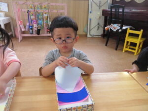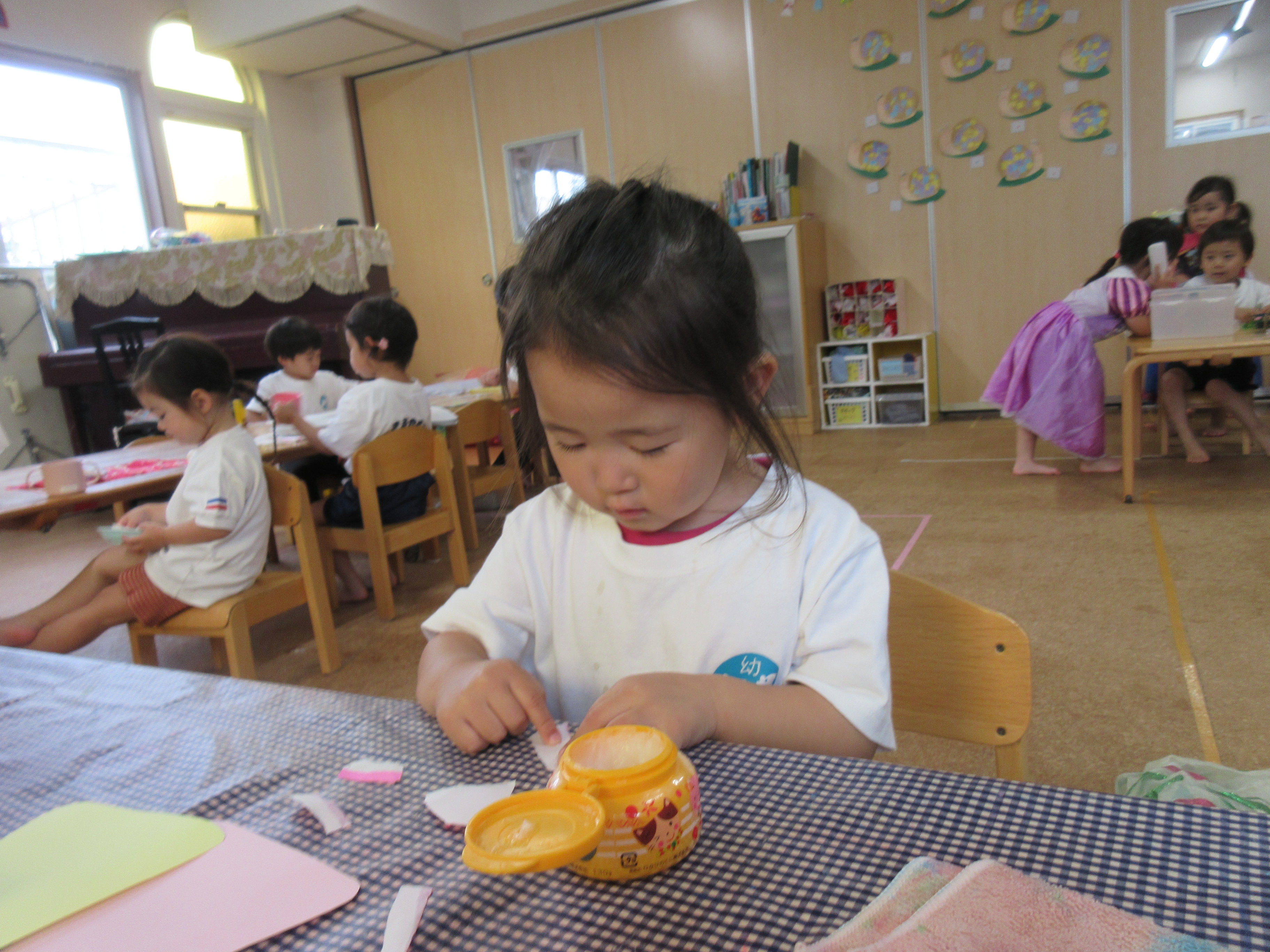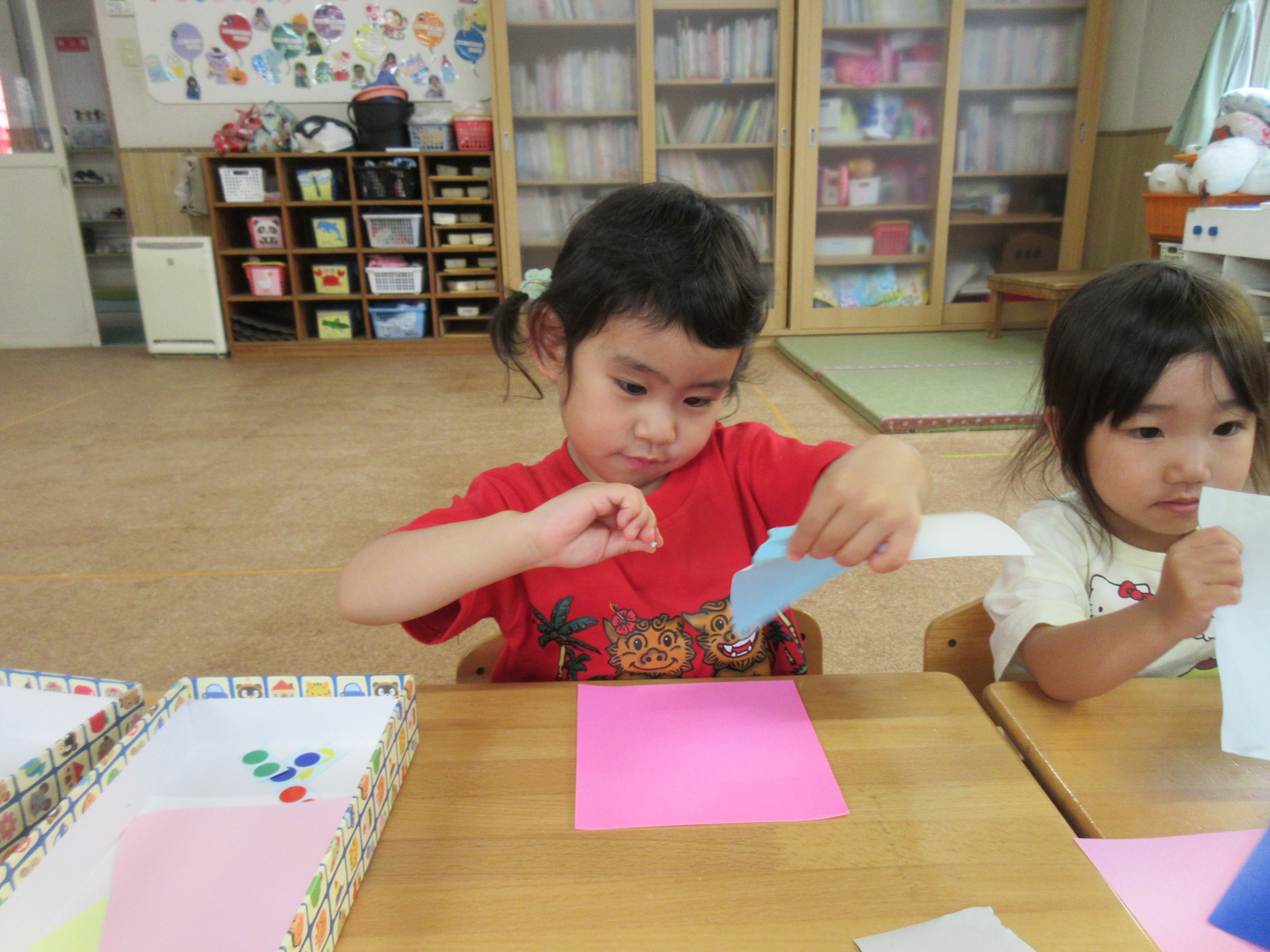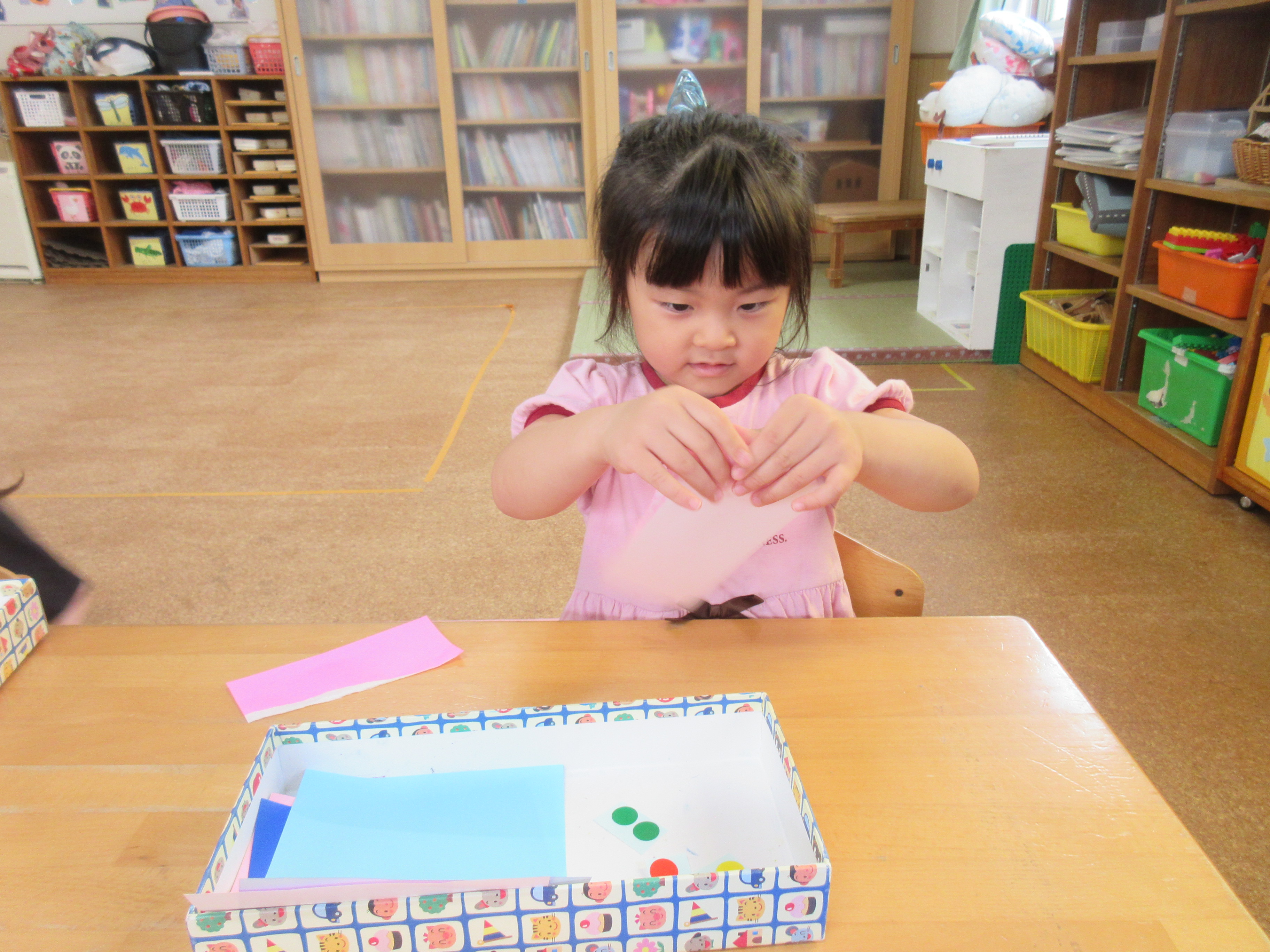 また、七夕にむけて織姫と彦星を作り、短冊にお願い事をかきました♡折り紙をちぎりお洋服に飾り付けをし、クレヨンでお顔をかいて完成させました♪お願い事も可愛いお願いが沢山でした(^_^)/~みんなのお願い事が叶いますように、、お休みのお友だちが完成出来たらお部屋に飾りたいと思います!