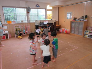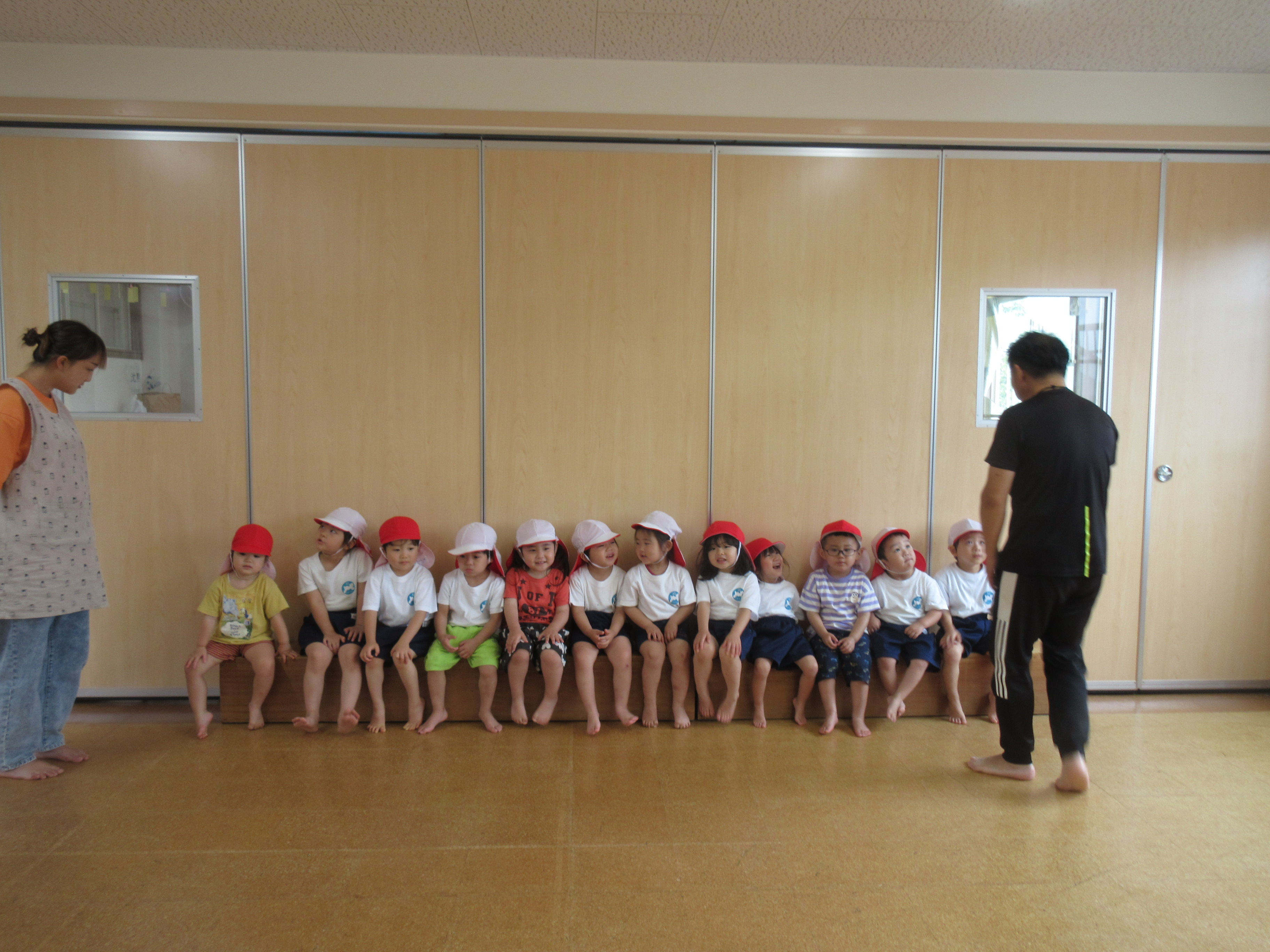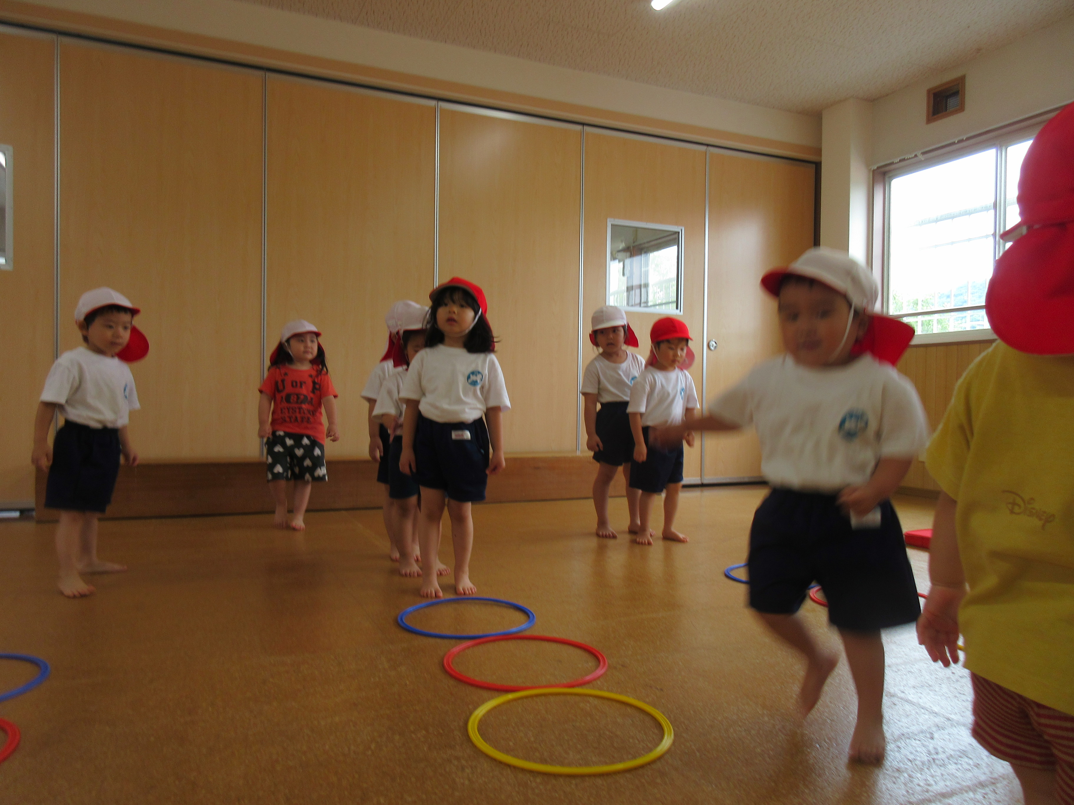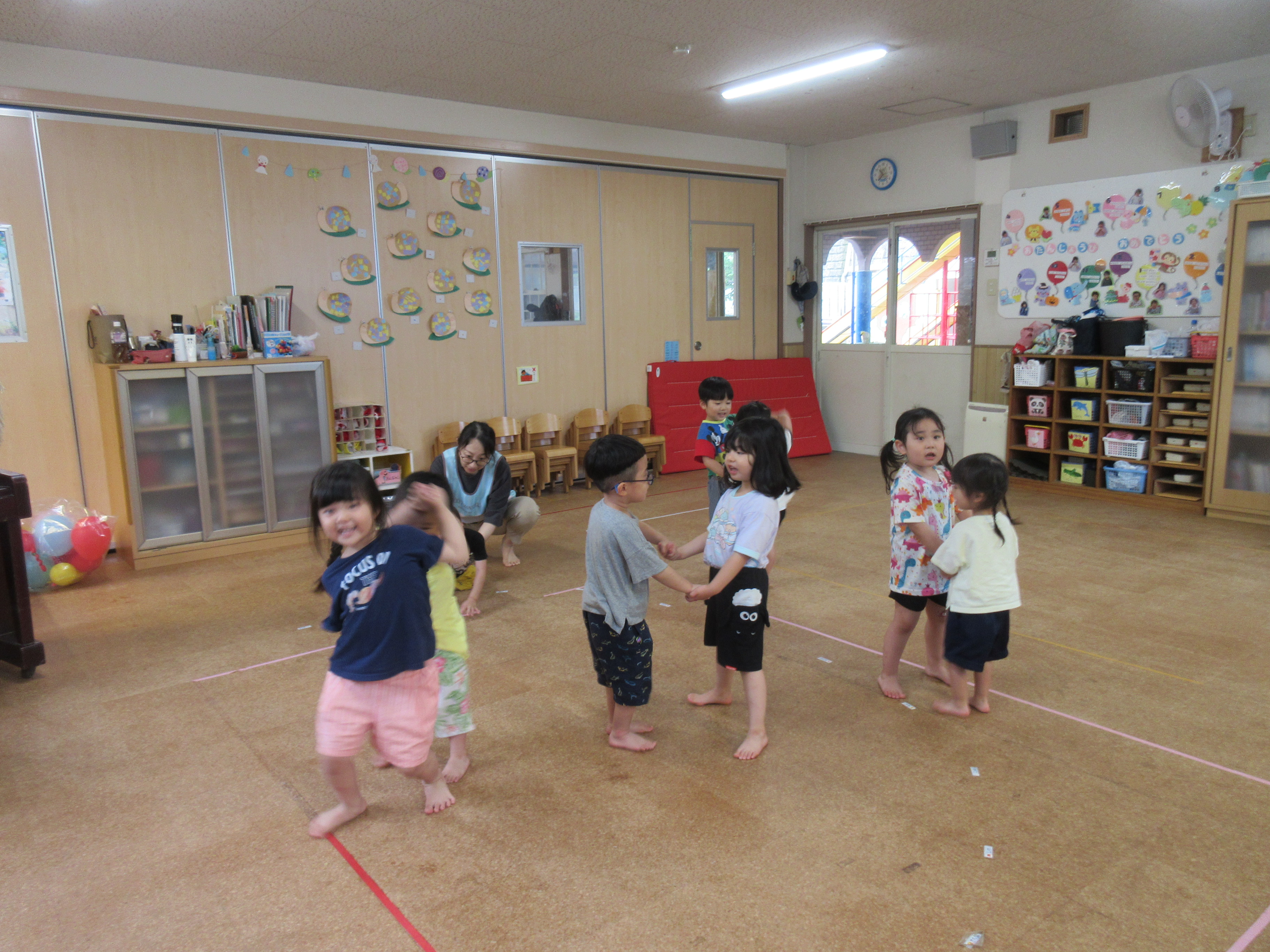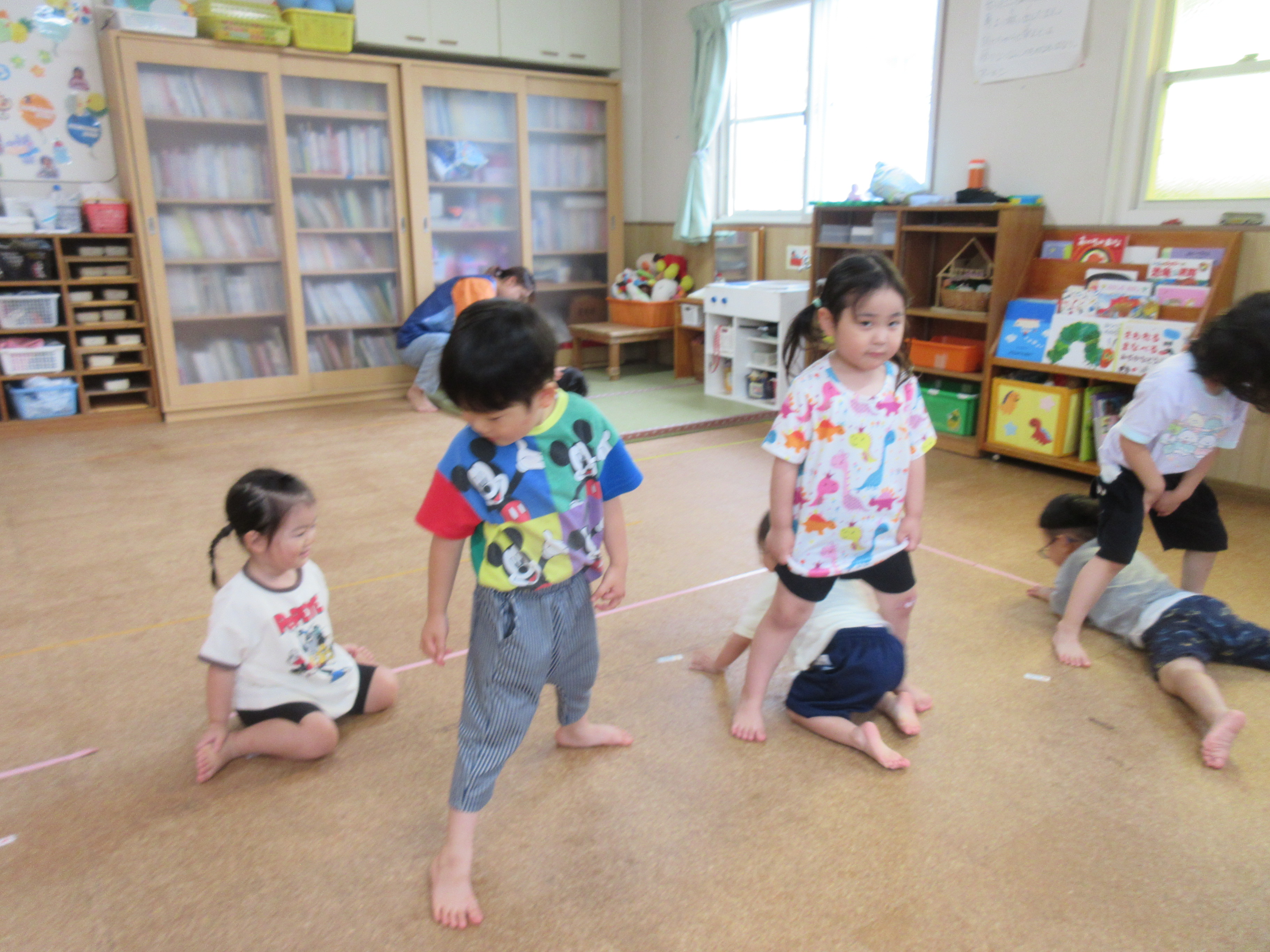 今週の体育あそびではプールの予定でしたが雨が降っていたので室内で体育あそびをしました(^^♪