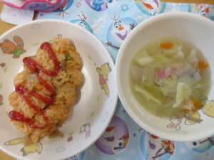 今日の給食はチキンライスと野菜スープでした。