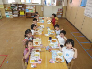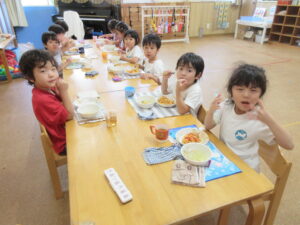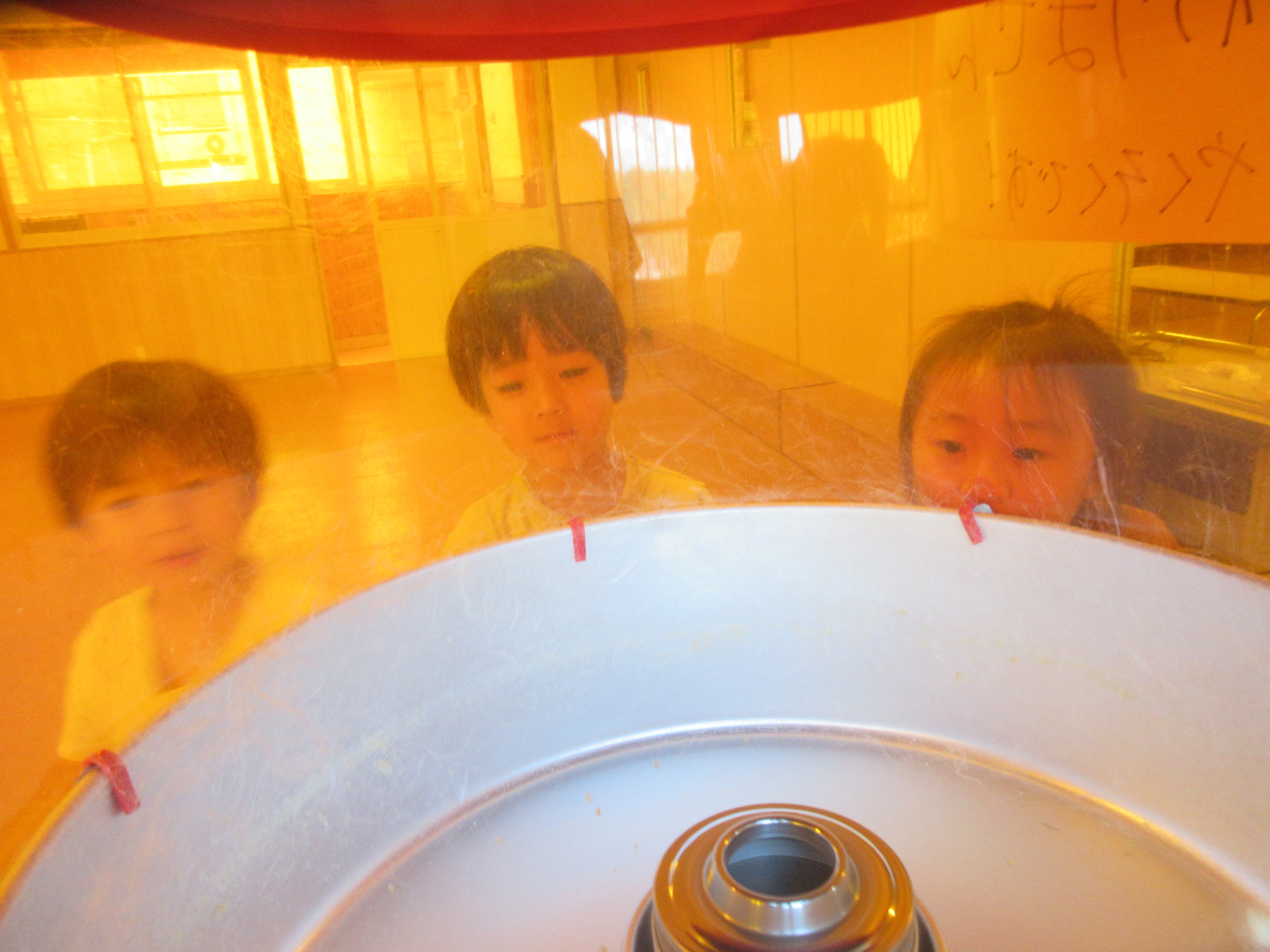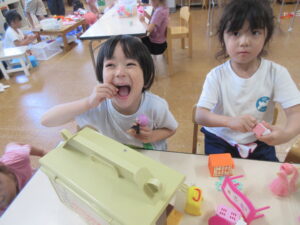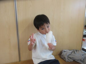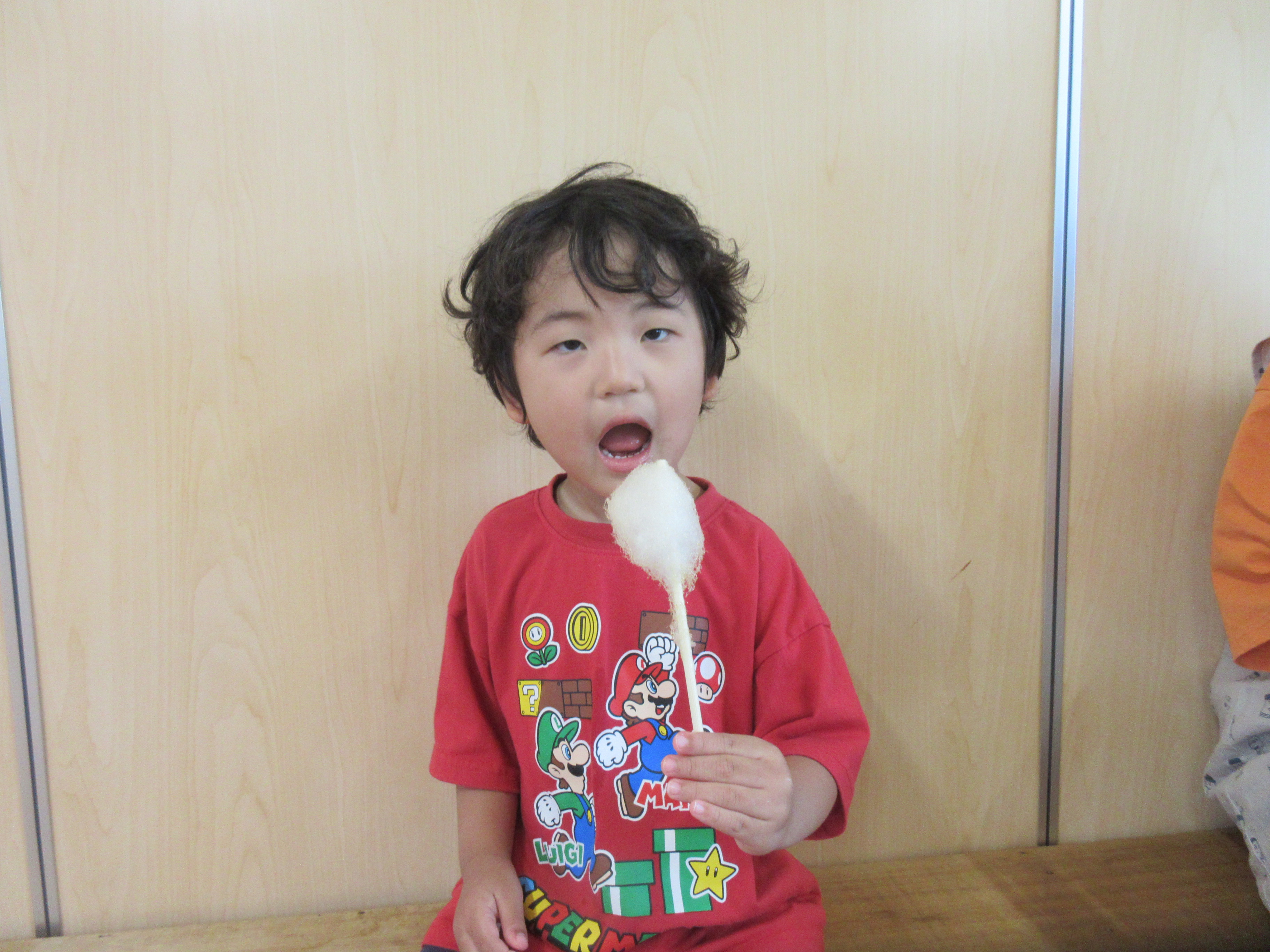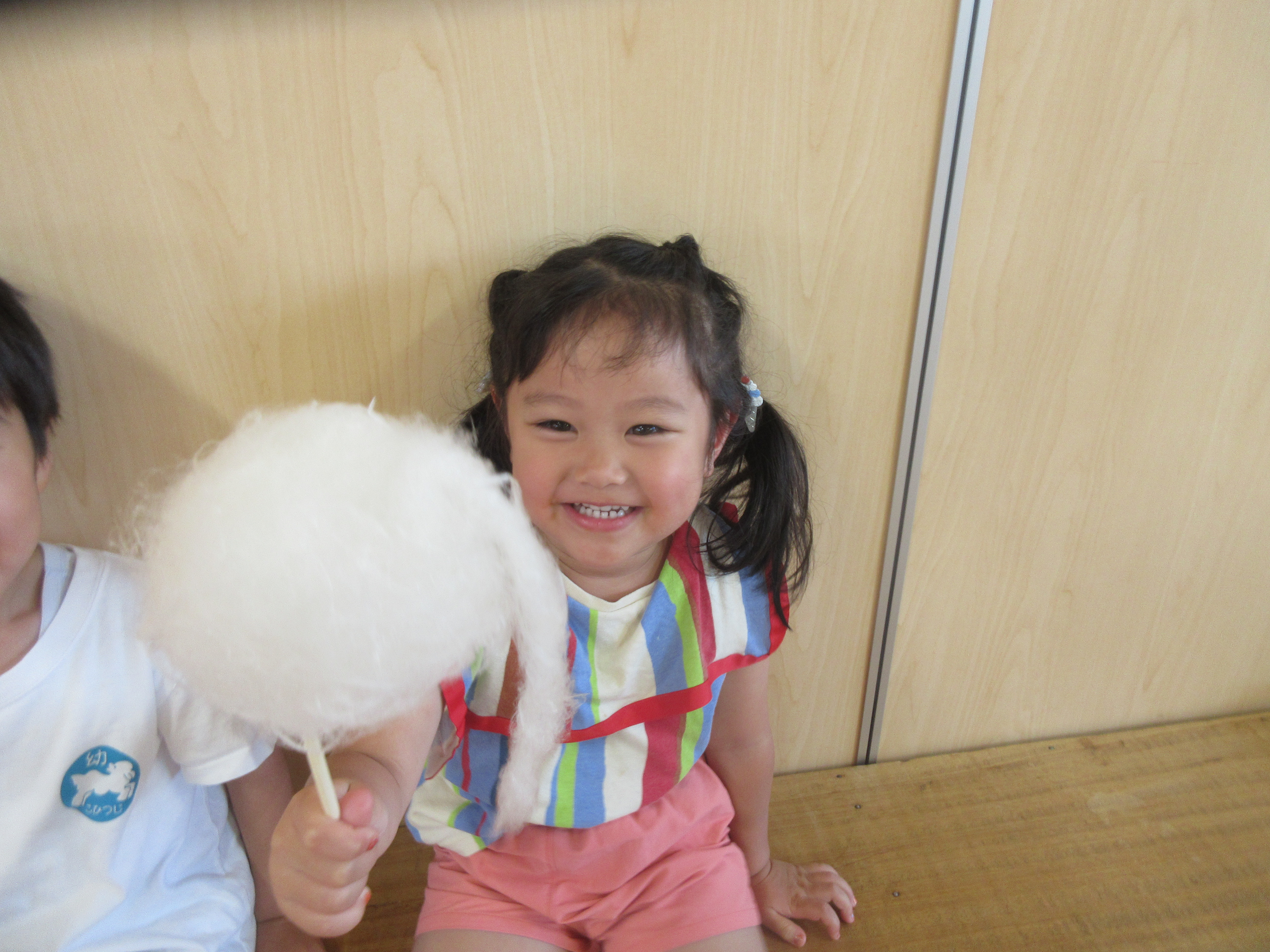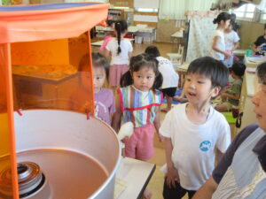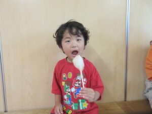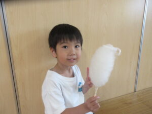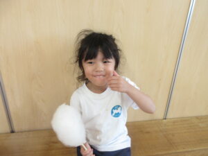 ごはんの後はゆり組さんで綿菓子屋が開店していたので食べに行きました!いつもより早くごはんを食べ終え、綿菓子を嬉しそうに食べる子どもたち💗食べた後はゆり組さんのお部屋で遊びました。