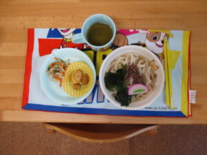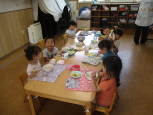 今日の給食は、肉うどん・胡麻酢和え・フライドポテトでした。フライドポテトはゆり組さんとすみれ組さんが一生懸命育てたじゃがいもで、できています。子どもたちみんなおいしそうに食べていましたよ😊