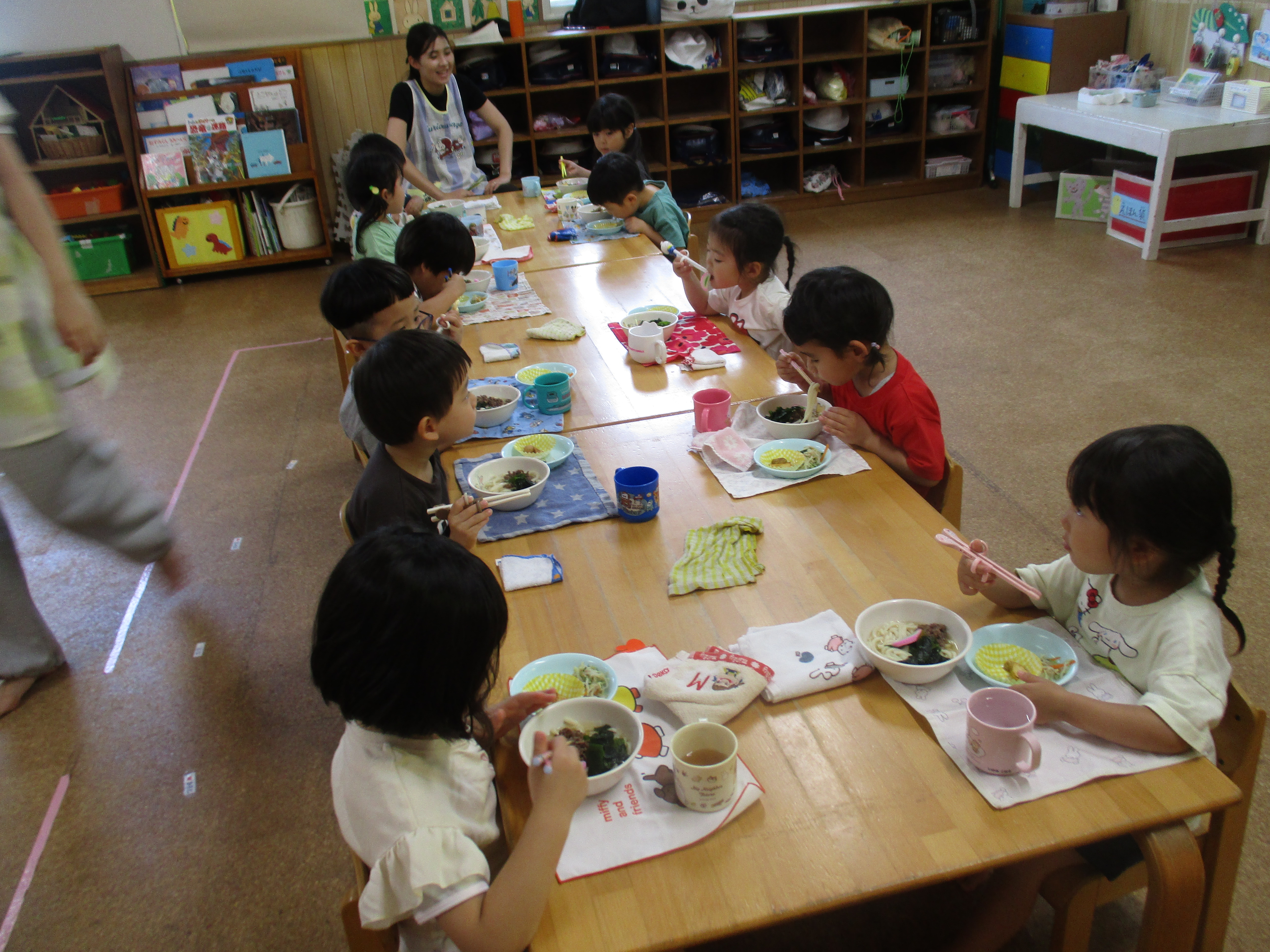 今日の給食は、肉うどん・胡麻酢和え・フライドポテトでした。フライドポテトはゆり組さんとすみれ組さんが一生懸命育てたじゃがいもで、できています。子どもたちみんなおいしそうに食べていましたよ😊