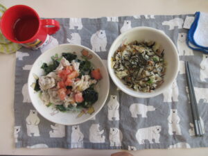 今日の給食です(^_^)/~冷しゃぶサラダに五目御飯でした!
