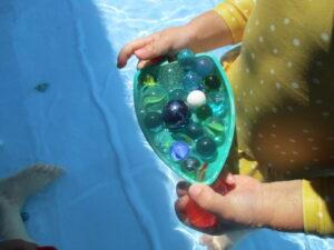 ワニさんやお馬さんになりきって泳いだり、お友だちと水鉄砲で水を掛け合ったり・・・