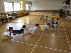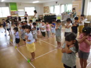 運動会に向けて、練習をしました。皆で朝のお集まりをした後、各クラスの演技を見せ合いっこしました。