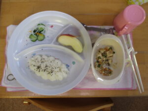 今日の給食は、ご飯・マーボー豆腐・酢の物・りんごてした(´~`)モグモグ