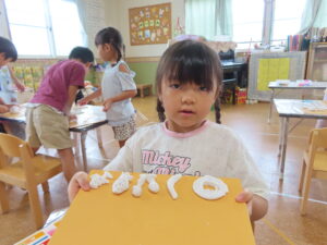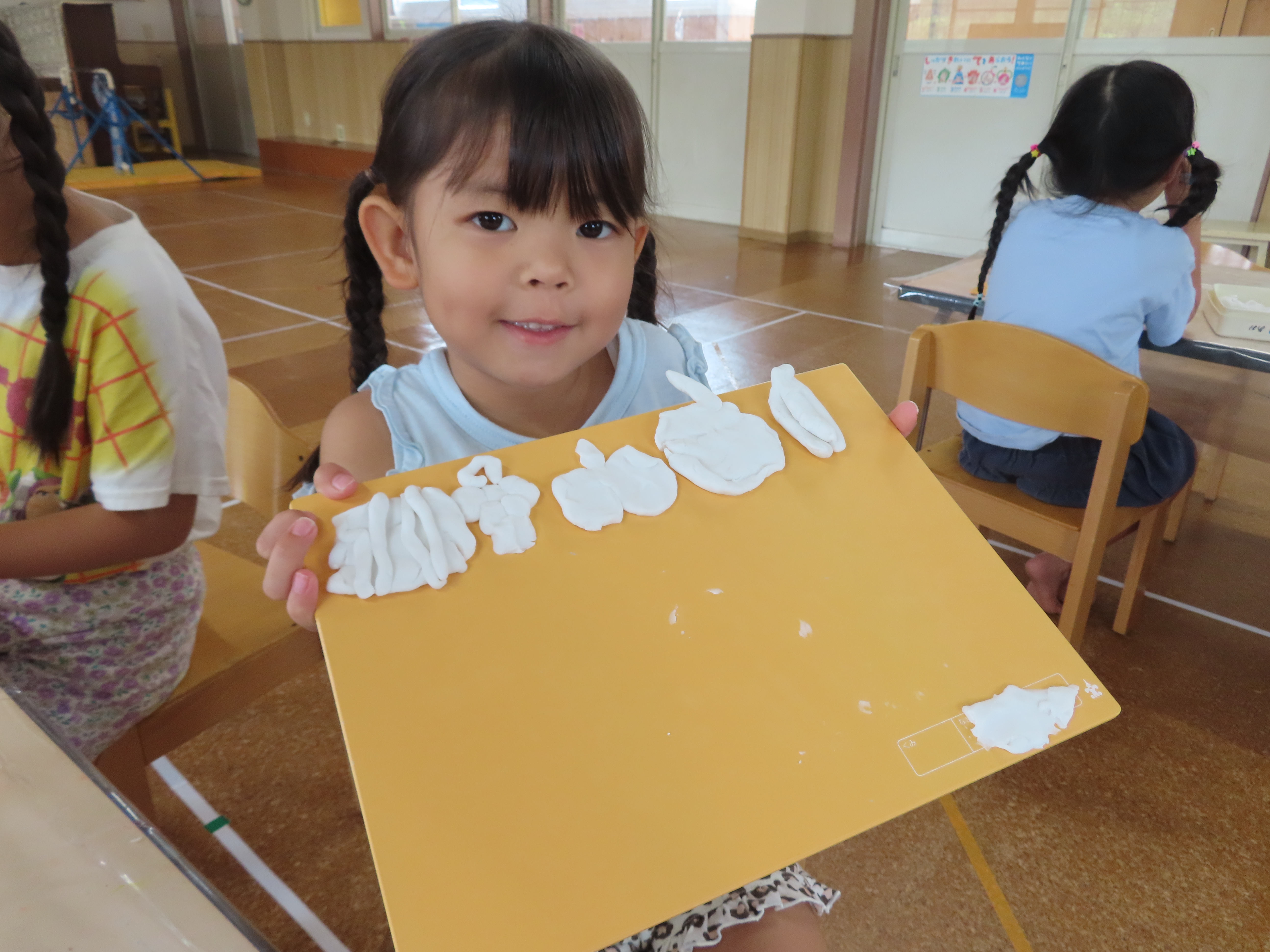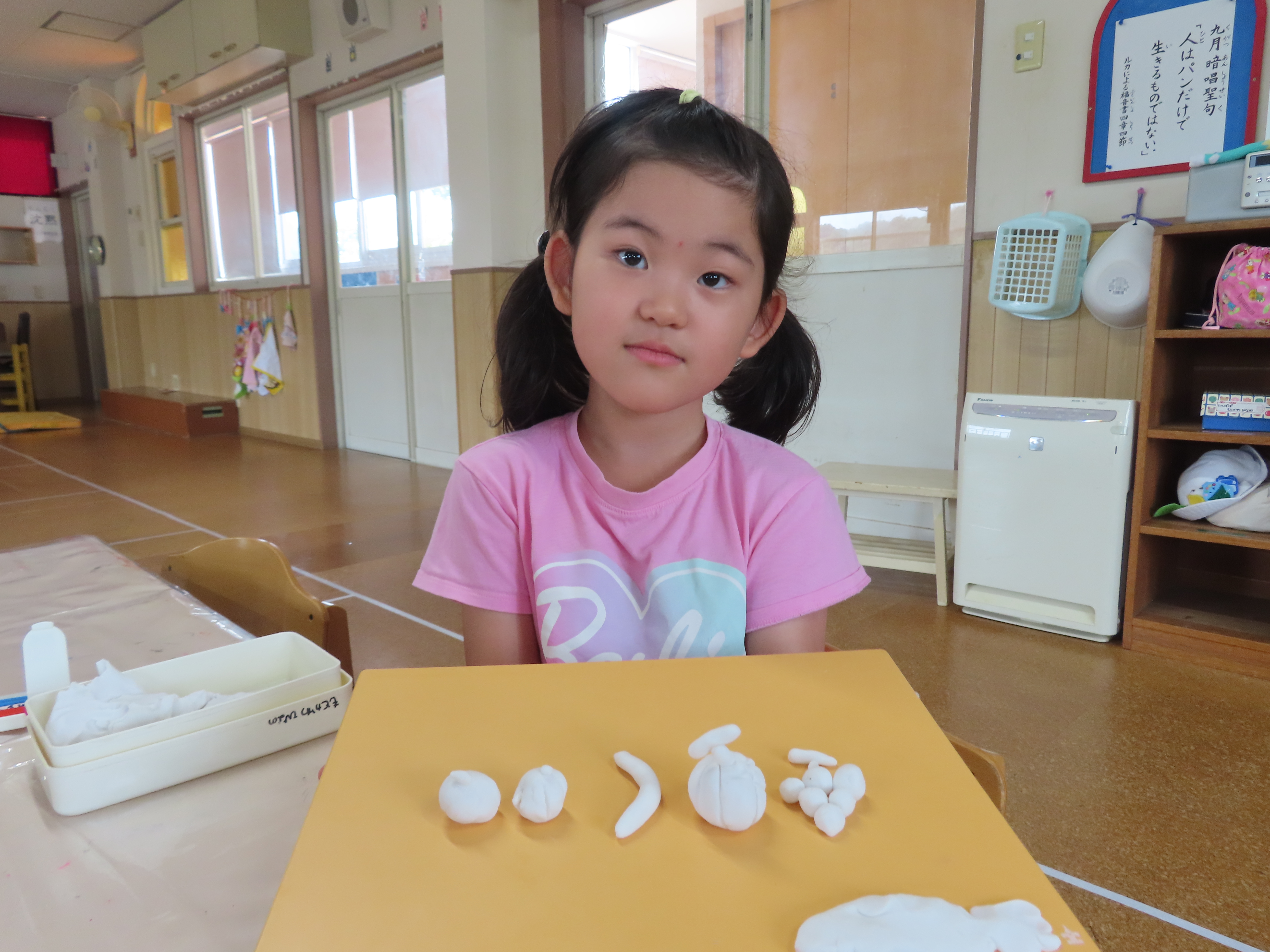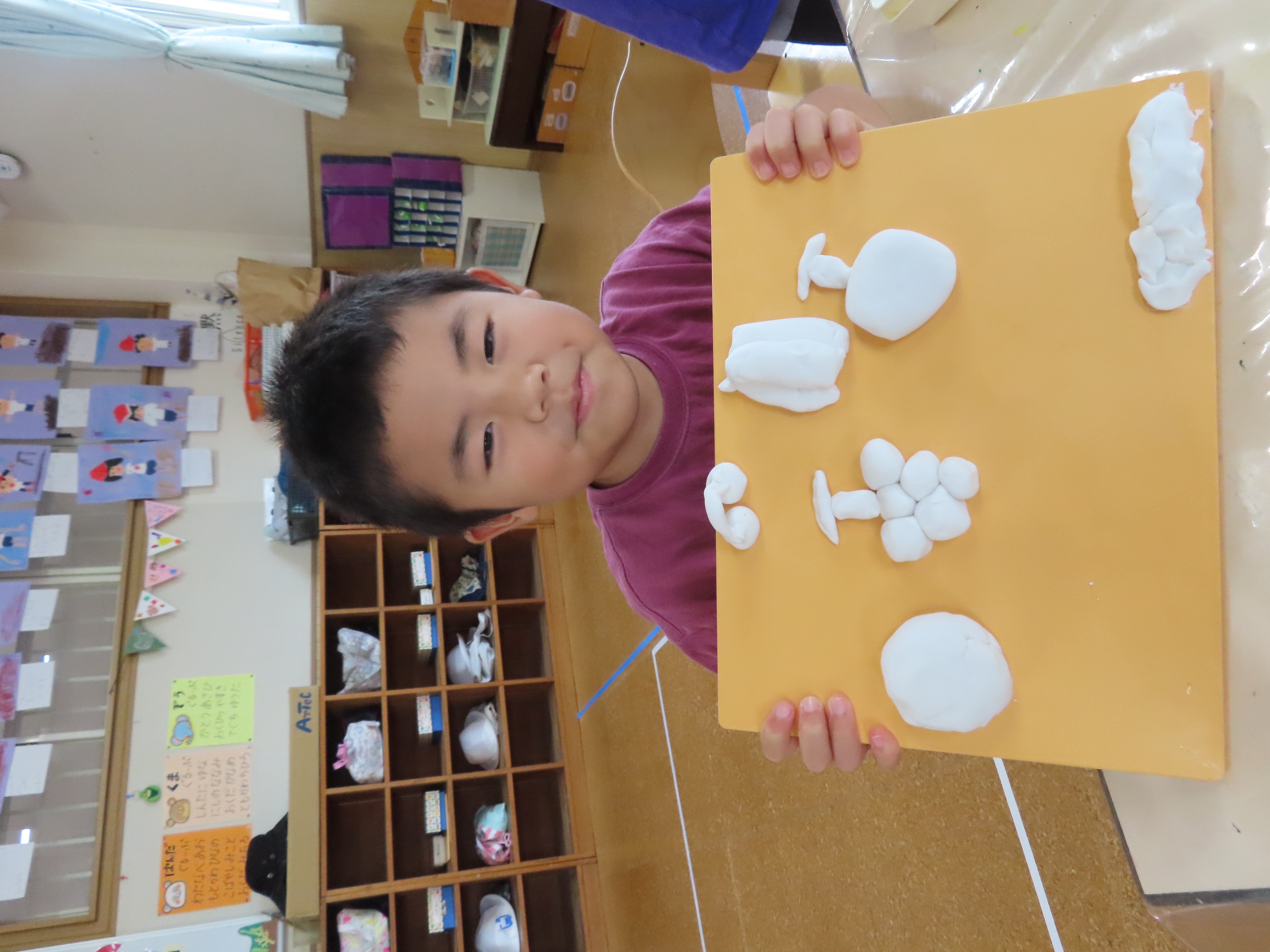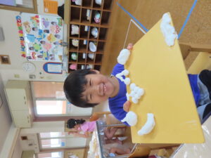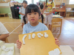 昨日は、久しぶりに粘土あそびをしました。果物を5つ作ってねというお題に・・・