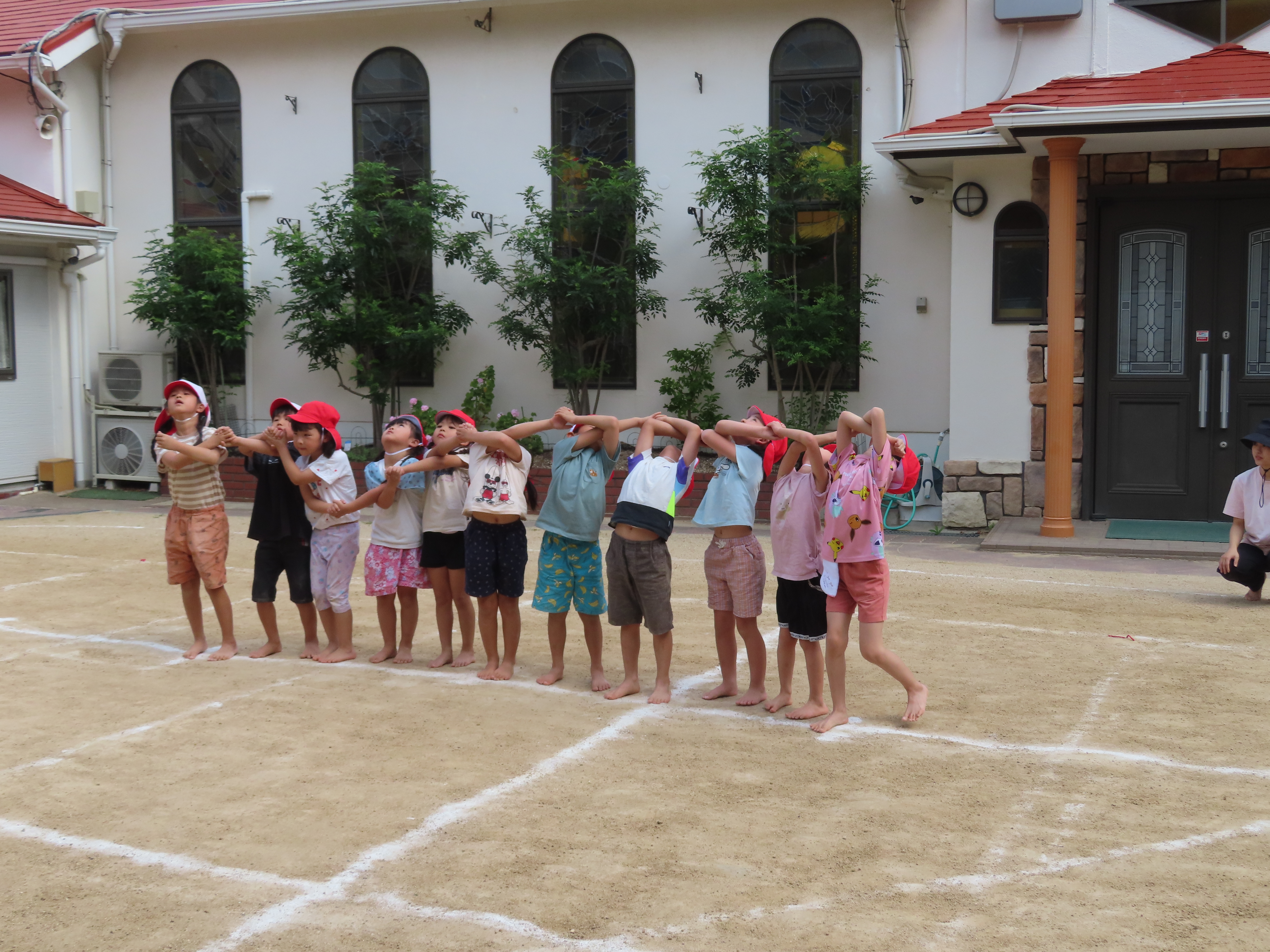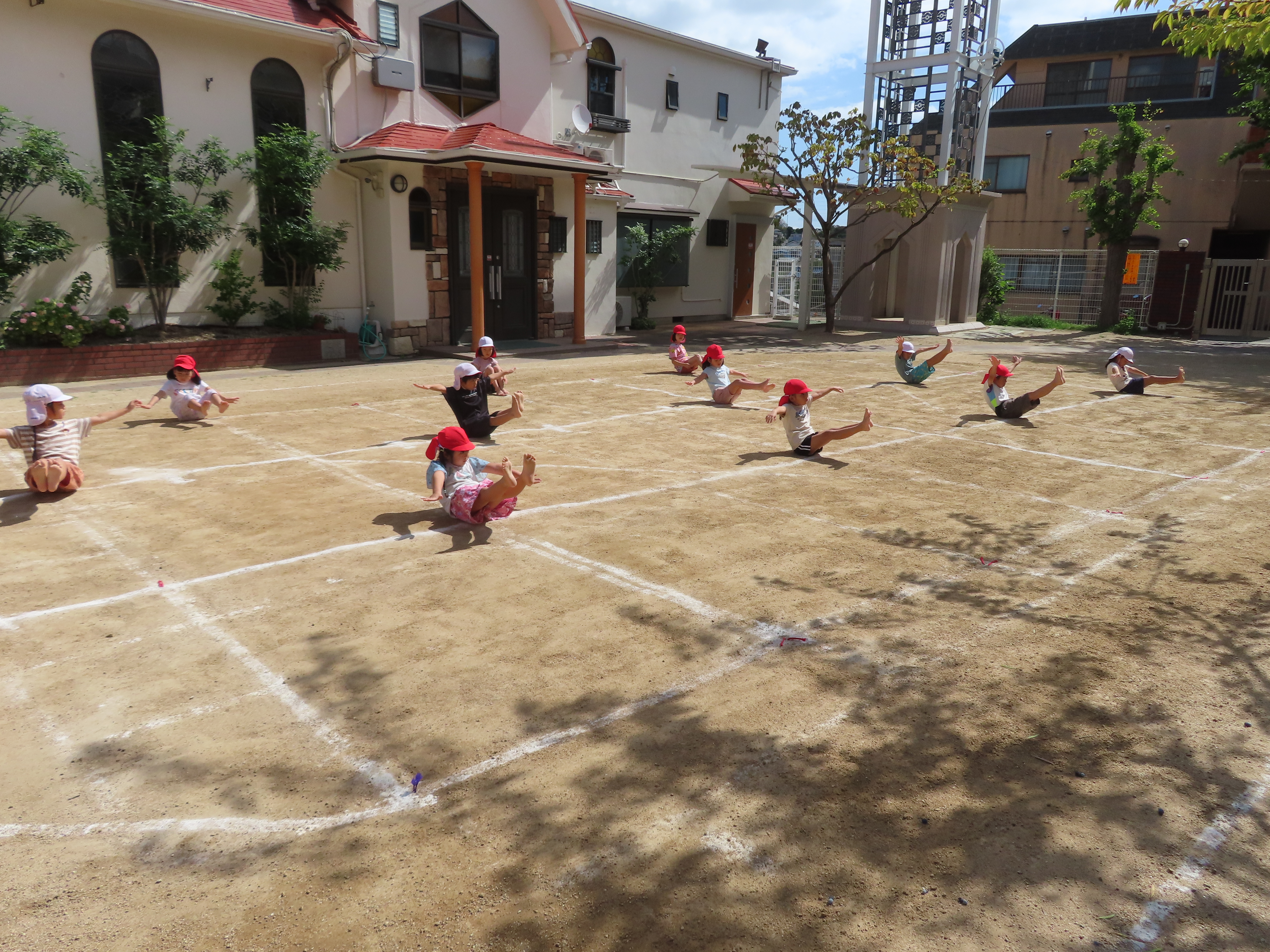 毎日練習に励んでいる子どもたちです。今日は、初めて園庭で組体操の練習をしました。