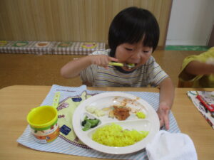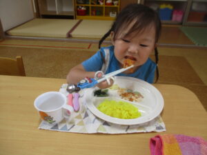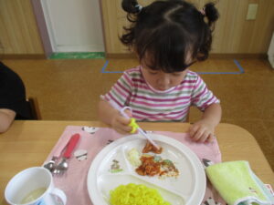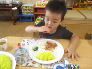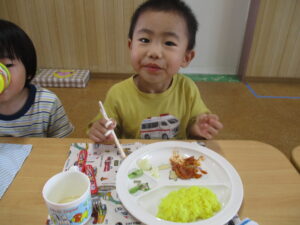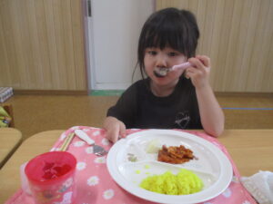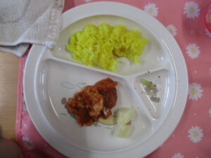 今日の給食は、ターメリックライスとポークチャップ、胡麻和えとフルーツカクテルでした! 今日のお楽しみをとても楽しみにしていたので、みんなすぐに完食していました😊
