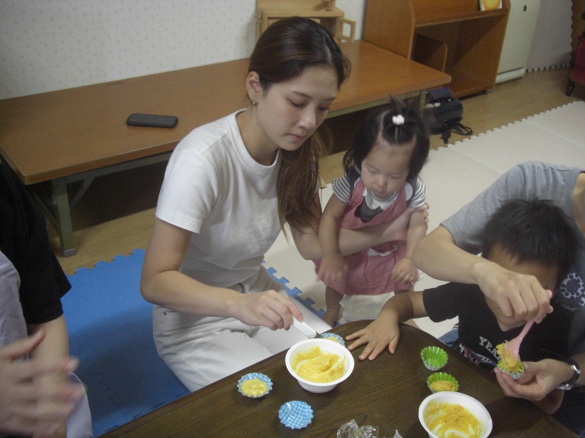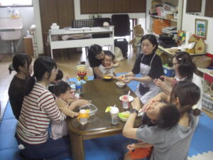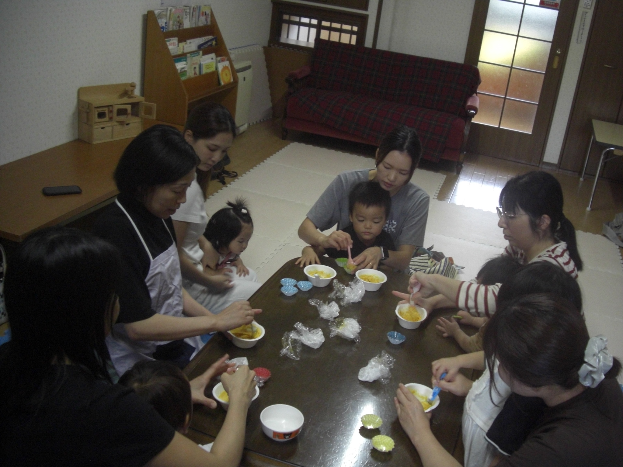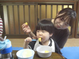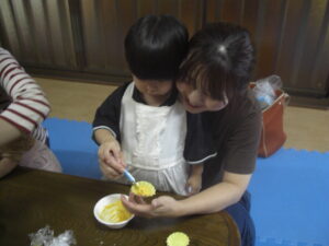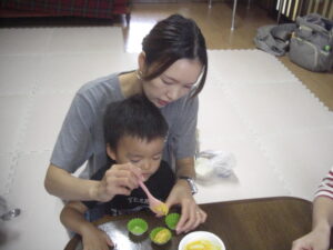 今日は、ハロウィンクッキング☆かぼちゃの蒸しパン☆を、作りました☆ペースト状にしたかぼちゃ&ホットケーキミックス&豆乳を入れてまぜまぜ☆カップに入れて、蒸して完成♡とっても美味しい優しいお味の蒸しパンが、完成しました♡エプロン姿のみんなが、可愛すぎて♡癒されました♡蒸している間も、おいしそう~♫と、楽しみに待ち、みんなで、幸せいっぱいに、いただきます♡ができました♡とっても美味しかったね♡また、お家では、レンジ対応シリコンカッだと、レンジでも作れるので、お芋を入れてアレンジしたり♡作ってみてくださいね♡