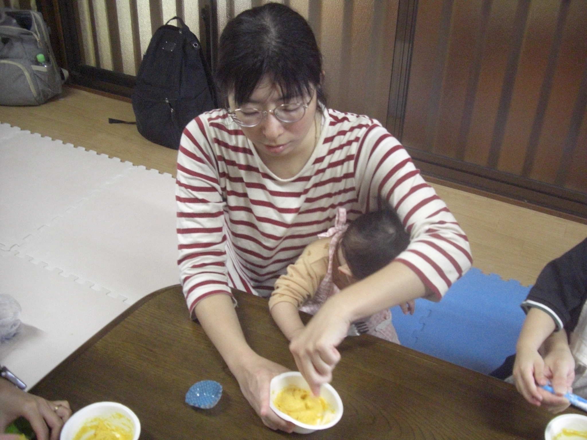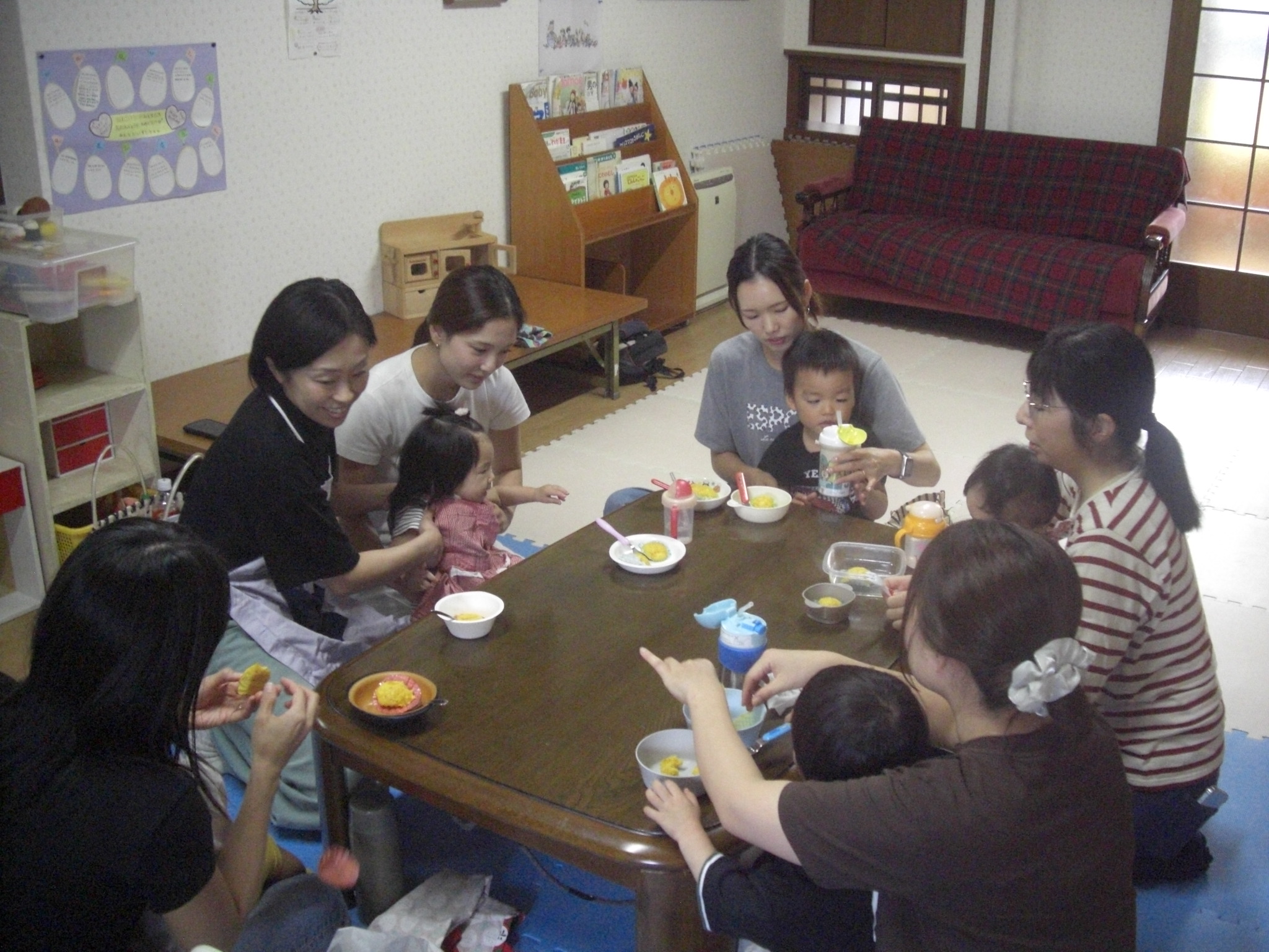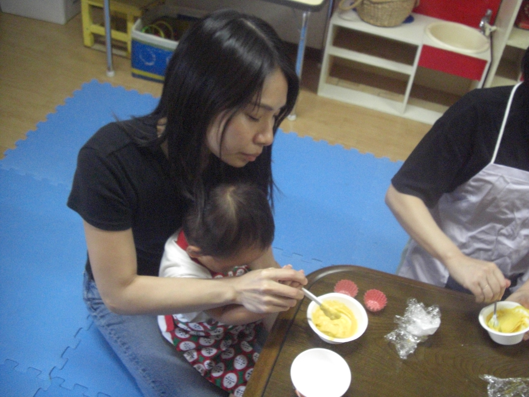 今日は、ハロウィンクッキング☆かぼちゃの蒸しパン☆を、作りました☆ペースト状にしたかぼちゃ&ホットケーキミックス&豆乳を入れてまぜまぜ☆カップに入れて、蒸して完成♡とっても美味しい優しいお味の蒸しパンが、完成しました♡エプロン姿のみんなが、可愛すぎて♡癒されました♡蒸している間も、おいしそう~♫と、楽しみに待ち、みんなで、幸せいっぱいに、いただきます♡ができました♡とっても美味しかったね♡また、お家では、レンジ対応シリコンカッだと、レンジでも作れるので、お芋を入れてアレンジしたり♡作ってみてくださいね♡
