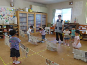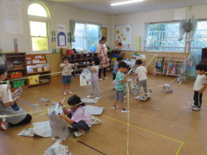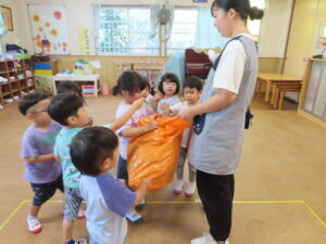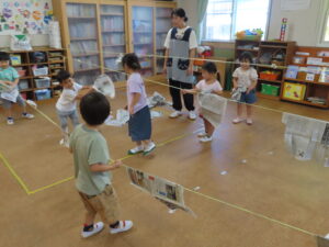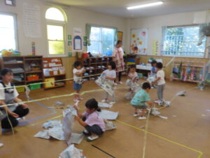 今日は実習に来ている学生の先生と新聞紙で遊びました♪新聞紙運びをしたり、新聞紙のトンネルをくぐったり、最後はびりびりに破り、とっても楽しそうな子どもたちでした♡お片付けまで楽しんで取り組んでいました(^_^)/~