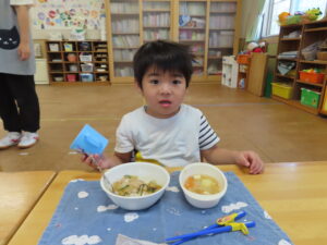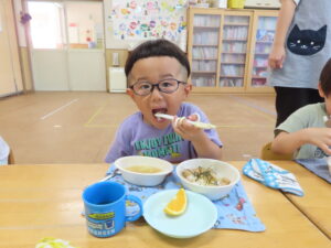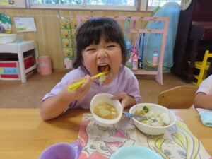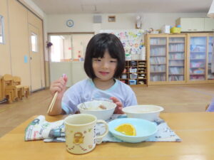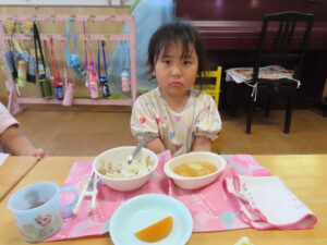 今日の給食は焼き鳥丼、お味噌汁、オレンジでした!「お野菜食べれるよ~」と大きなお口を開けて食べ進める子どもたち、とっても美味しかったね!♫