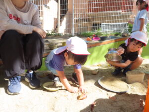 ご飯を食べた後は、戸外で遊びました♡かくれんぼをしたり、追いかけっこをしたり、お砂で遊んだりと、好きな遊びを見つけて、遊ぶ子どもたちでした!