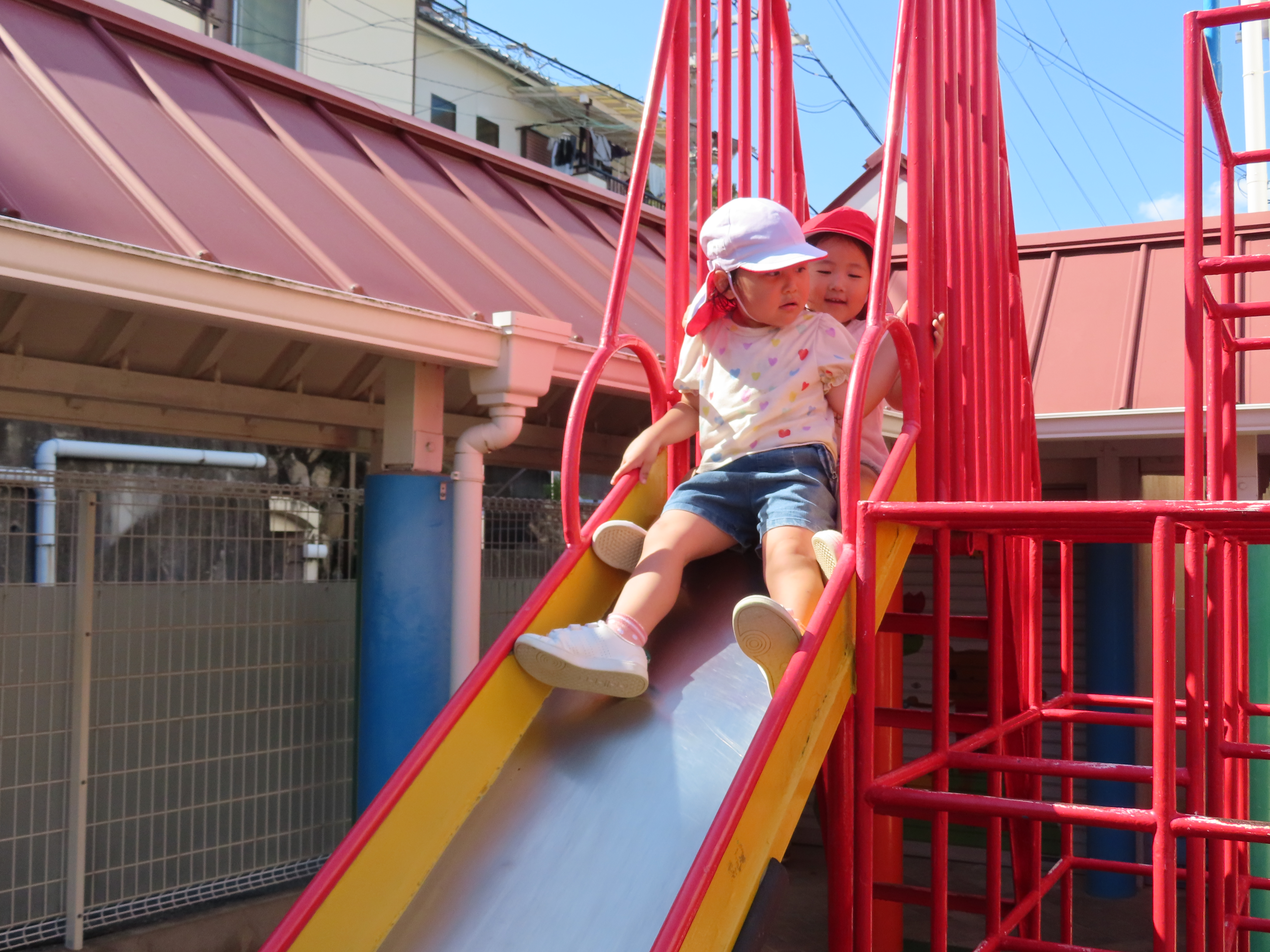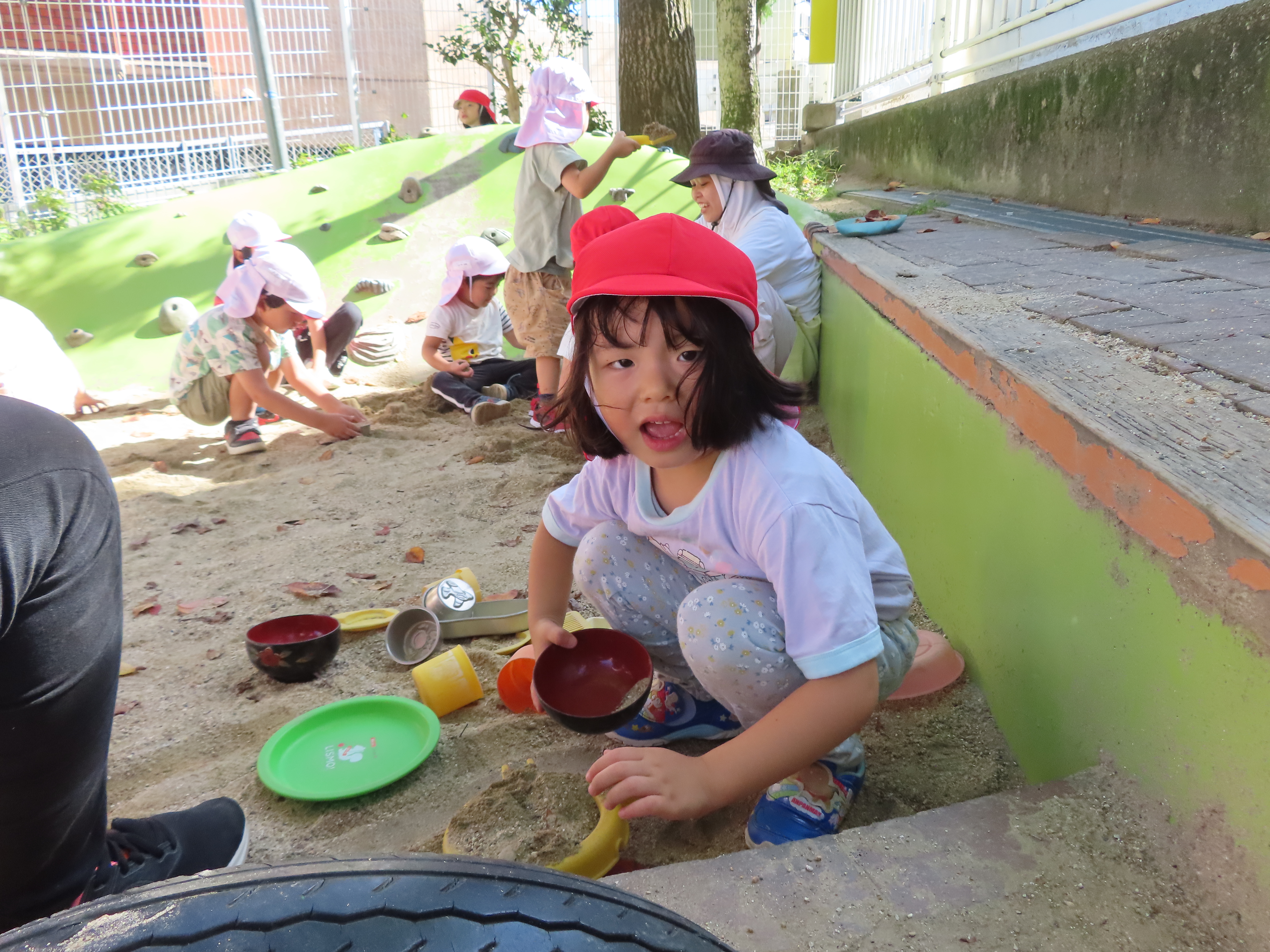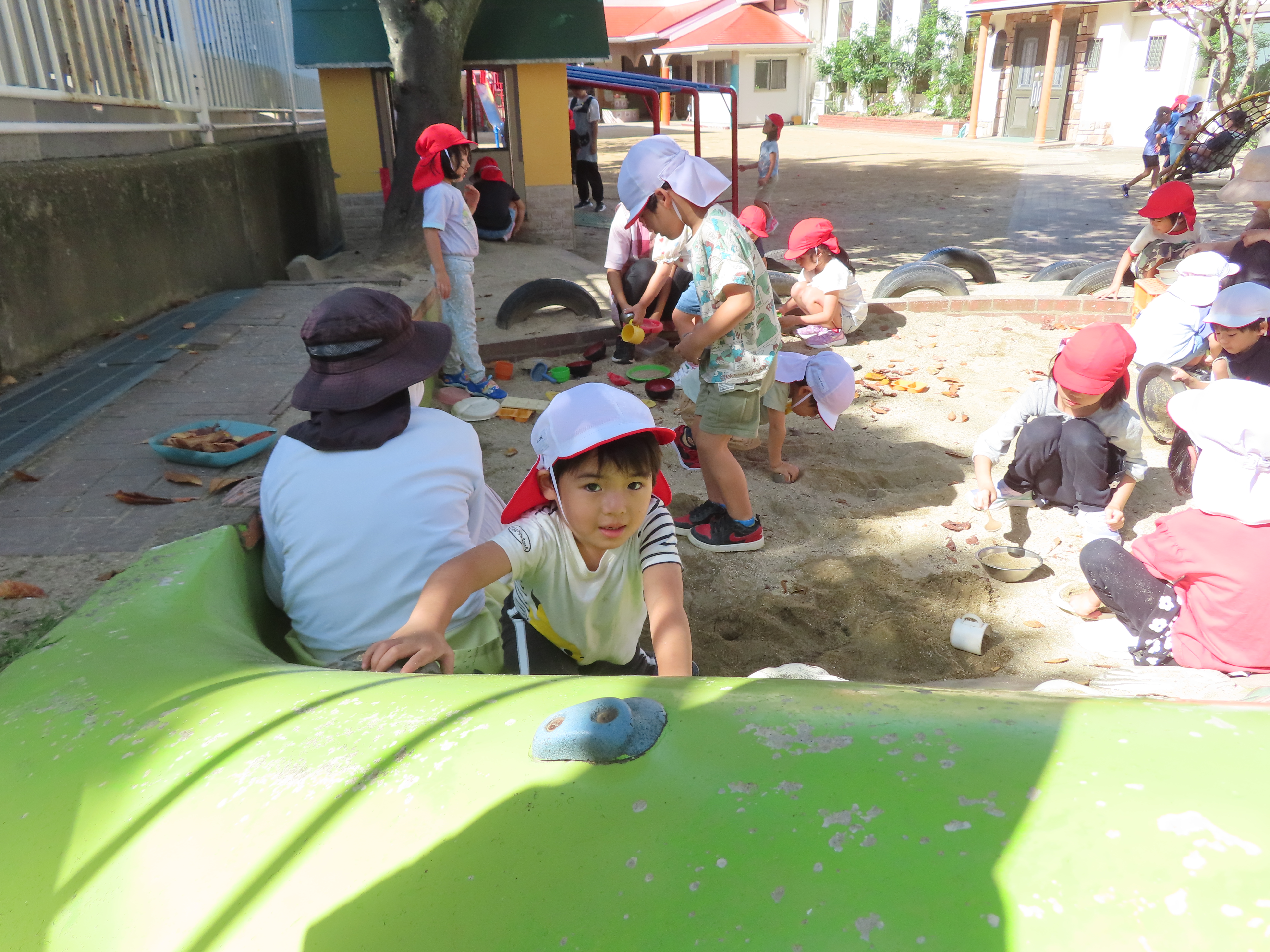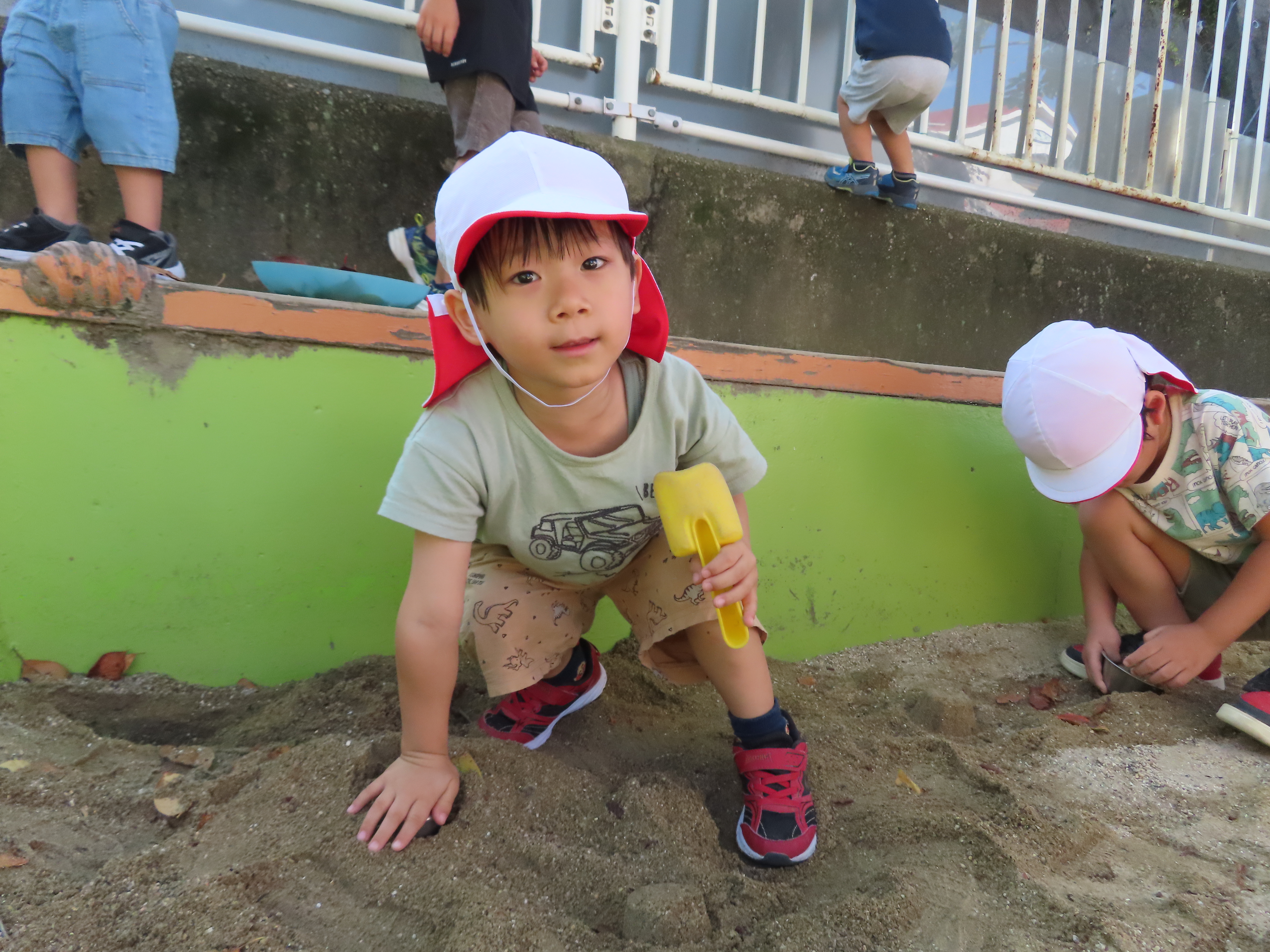 ご飯を食べた後は、戸外で遊びました♡かくれんぼをしたり、追いかけっこをしたり、お砂で遊んだりと、好きな遊びを見つけて、遊ぶ子どもたちでした!