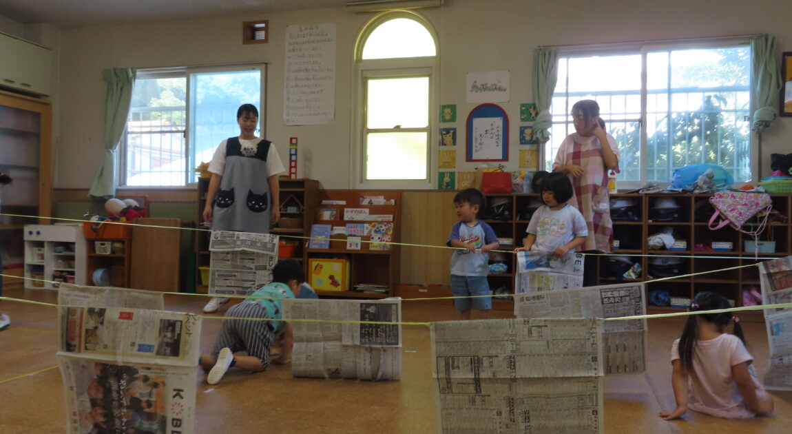 今日は実習に来ている学生の先生と新聞紙で遊びました♪新聞紙運びをしたり、新聞紙のトンネルをくぐったり、最後はびりびりに破り、とっても楽しそうな子どもたちでした♡お片付けまで楽しんで取り組んでいました(^_^)/~