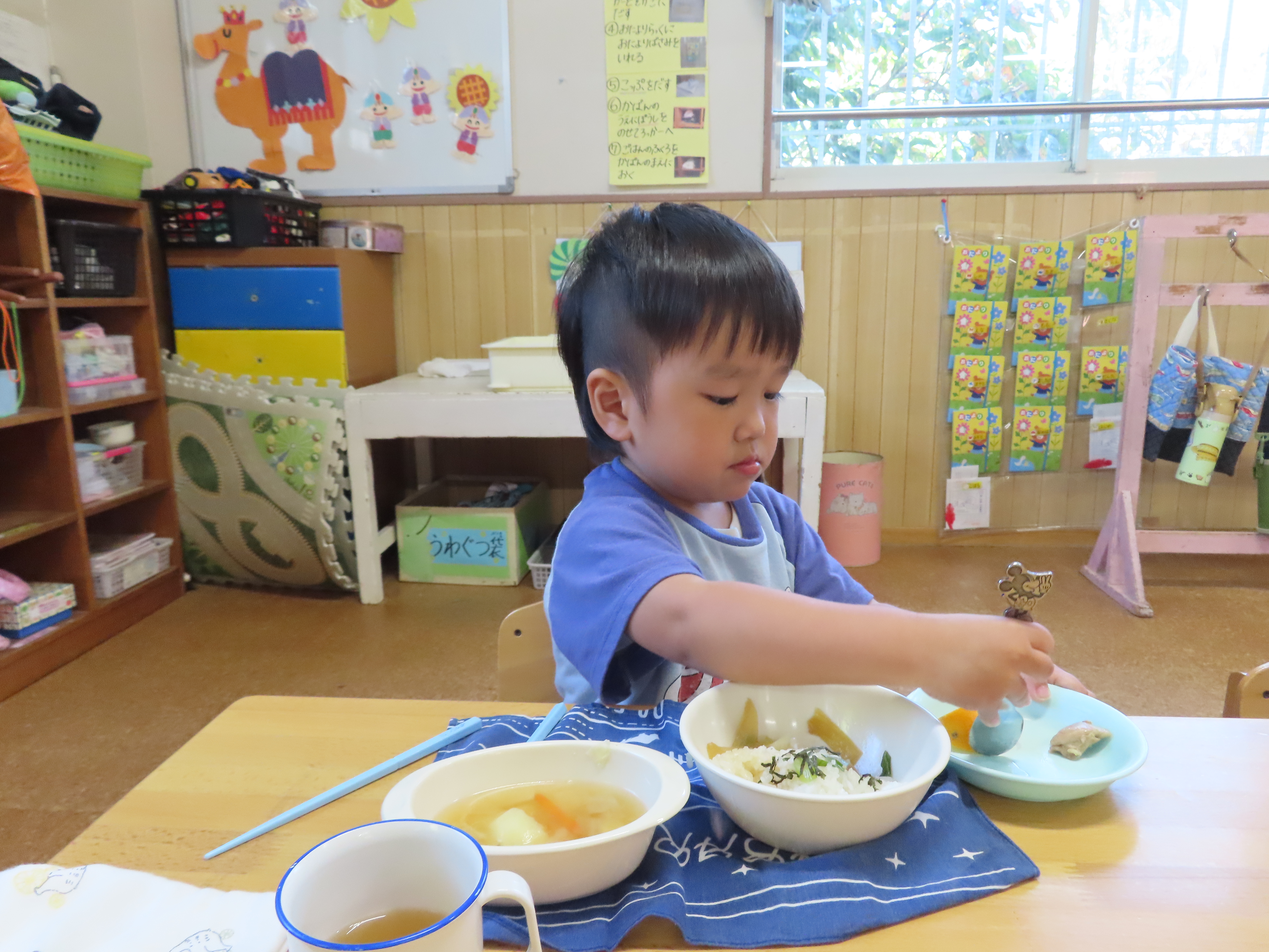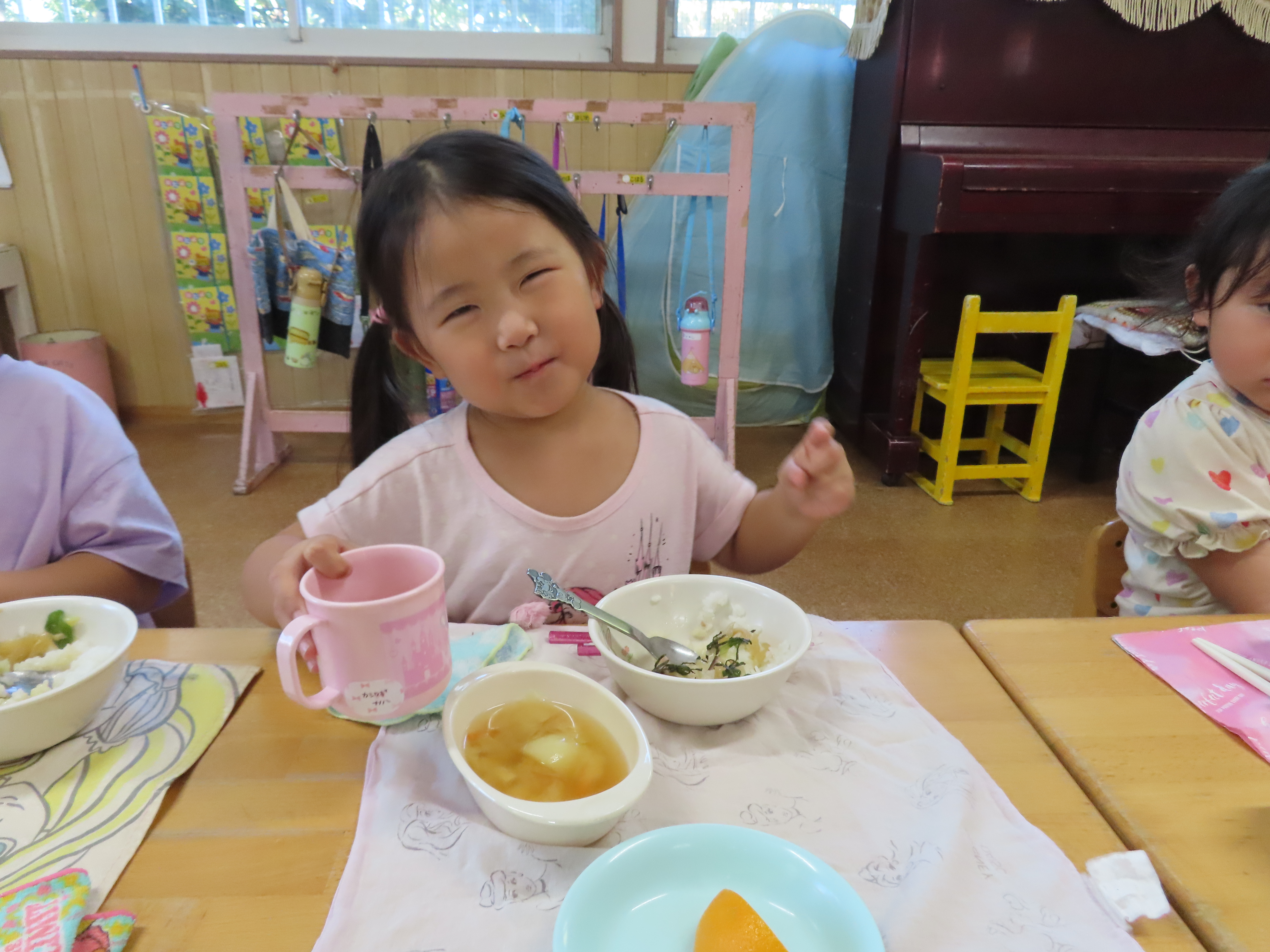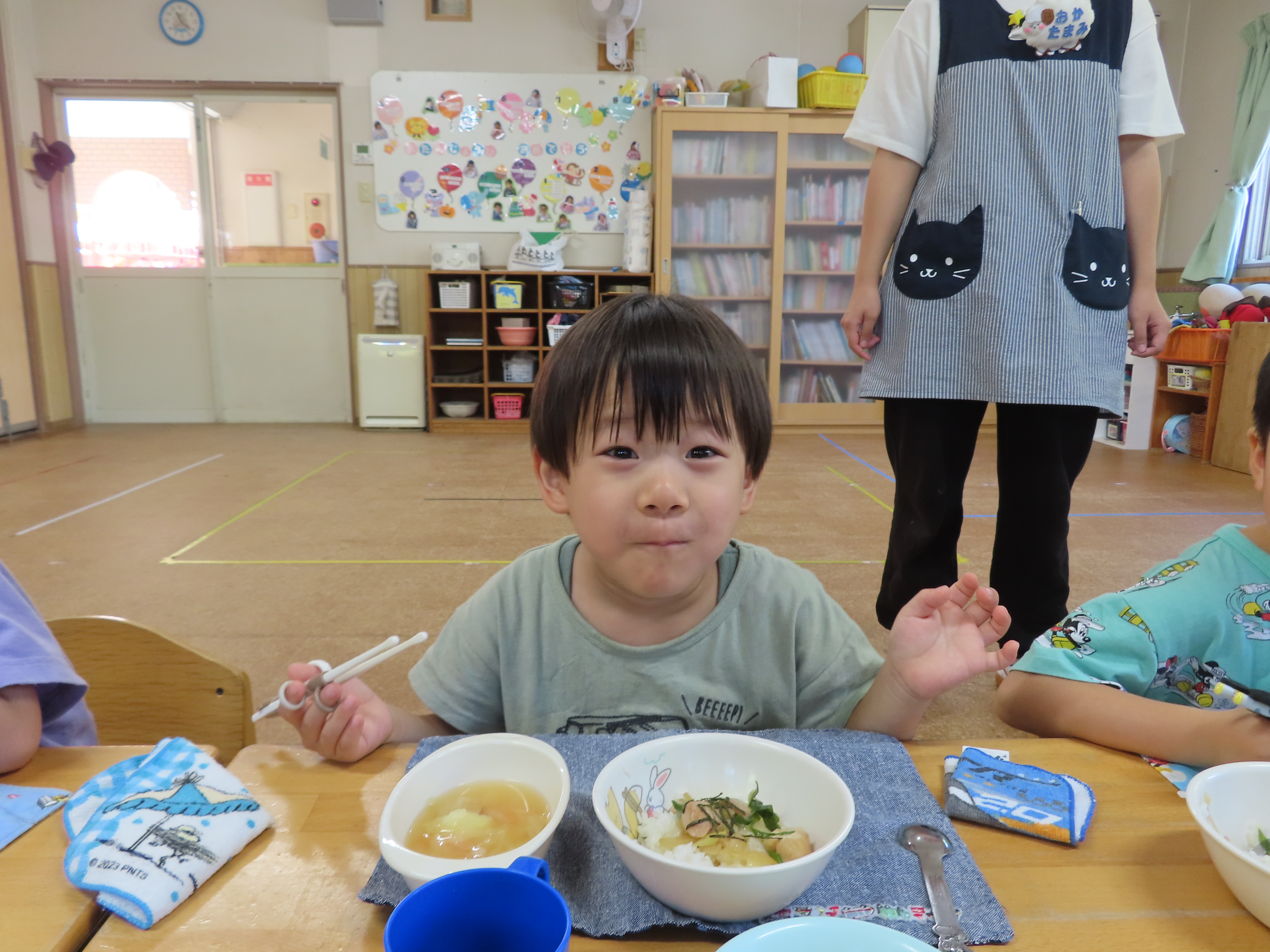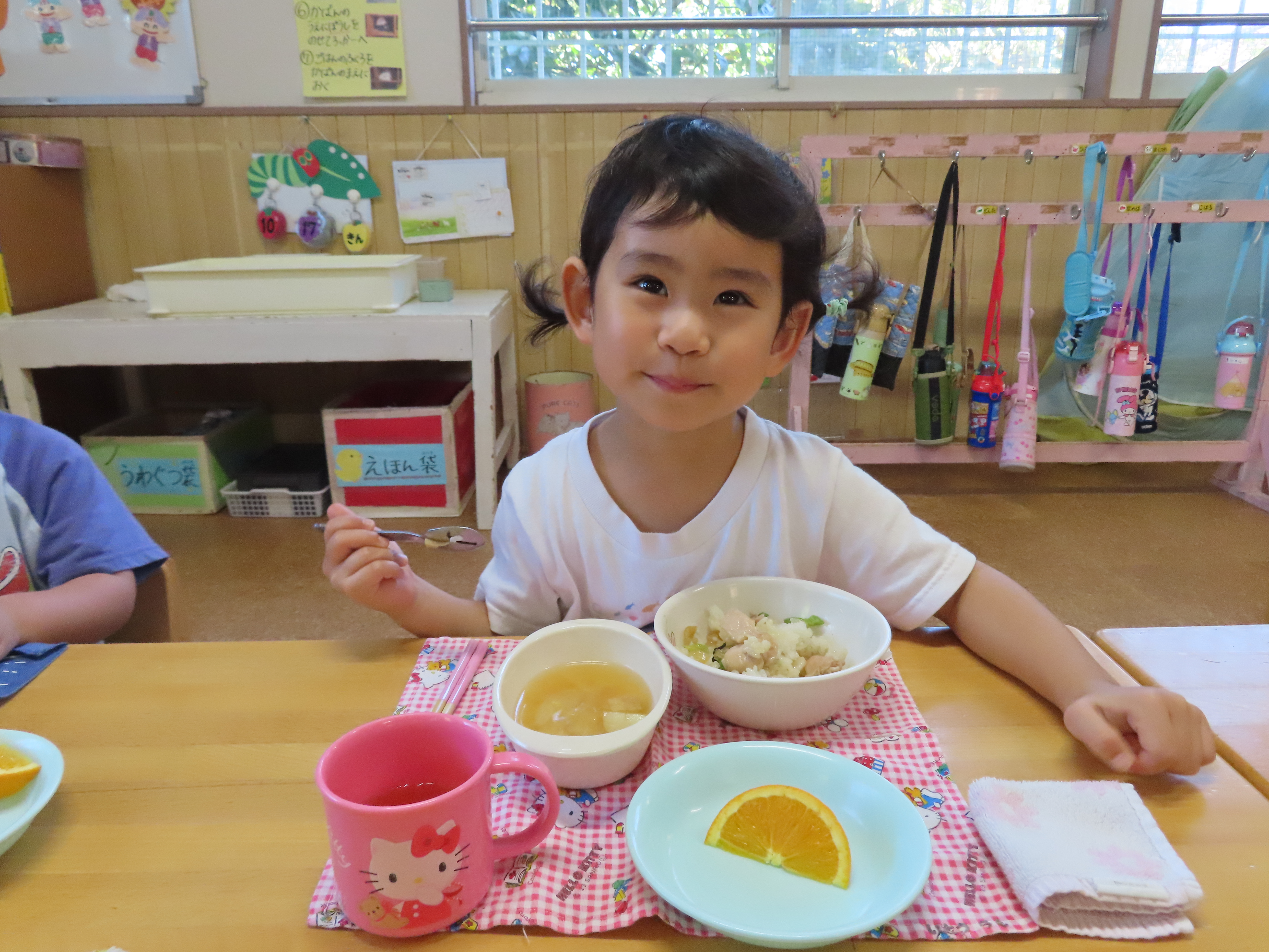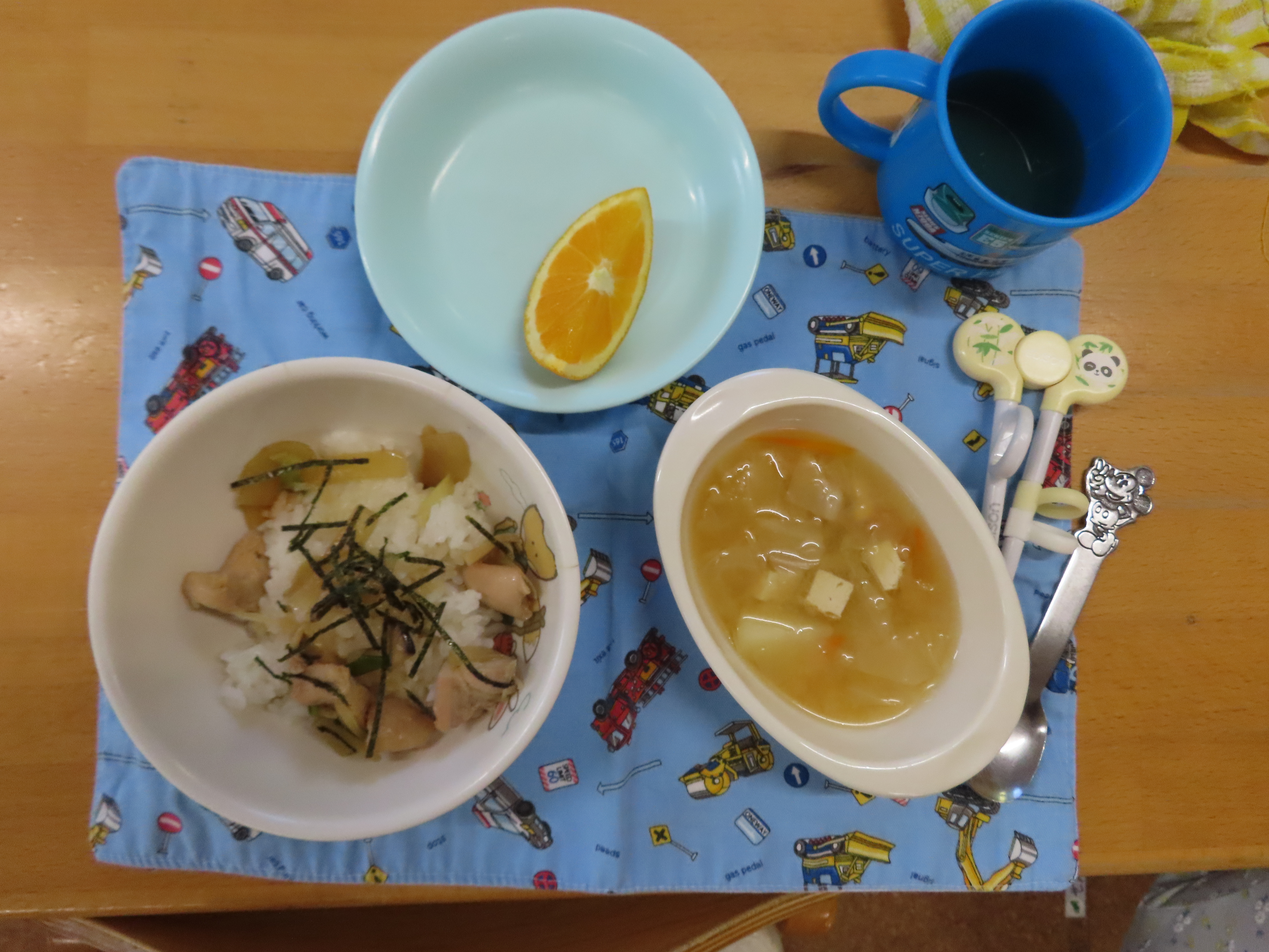 今日の給食は焼き鳥丼、お味噌汁、オレンジでした!「お野菜食べれるよ~」と大きなお口を開けて食べ進める子どもたち、とっても美味しかったね!♫