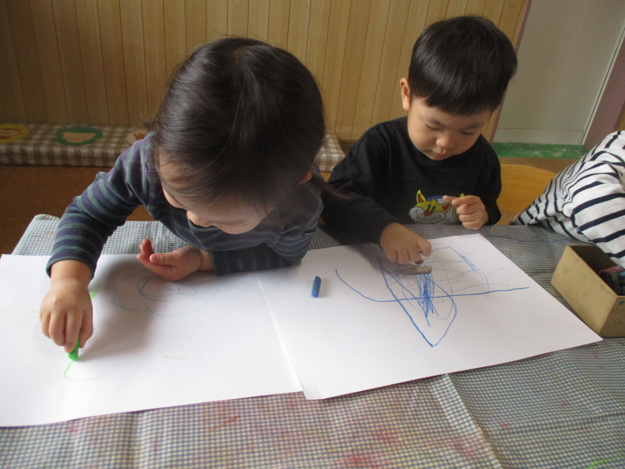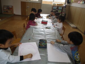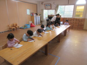 すみれ組さんは、ひらがな遊びをしました。とても真剣な表情をしながら頑張っていました🎵また、講師の方が折り紙をプレゼントしてくださいました😊✨ひよこどんぐり組さんは、お絵描きをしました。ばいきんまんを描いていたり、ママを描いていたりしていました😊
