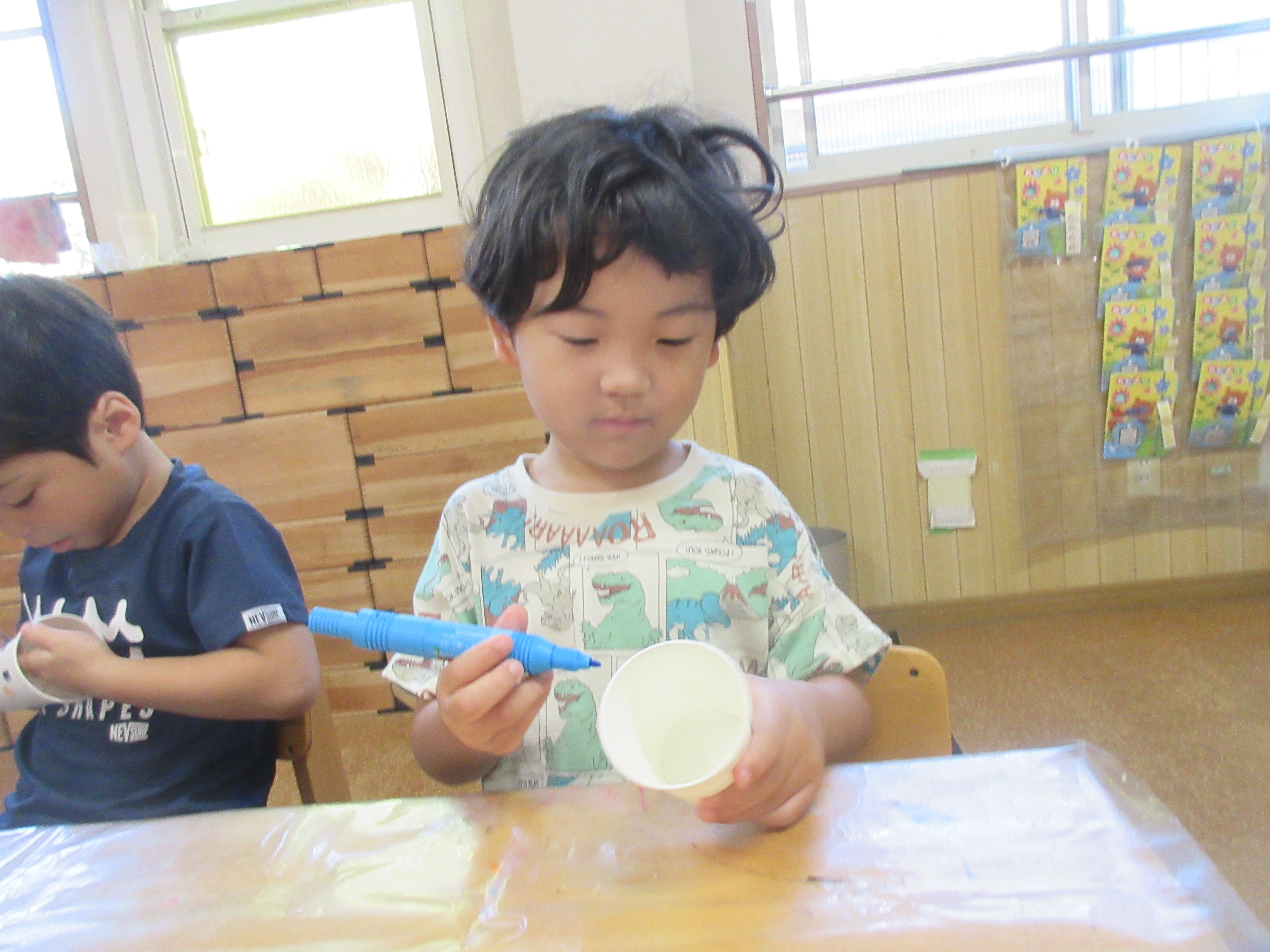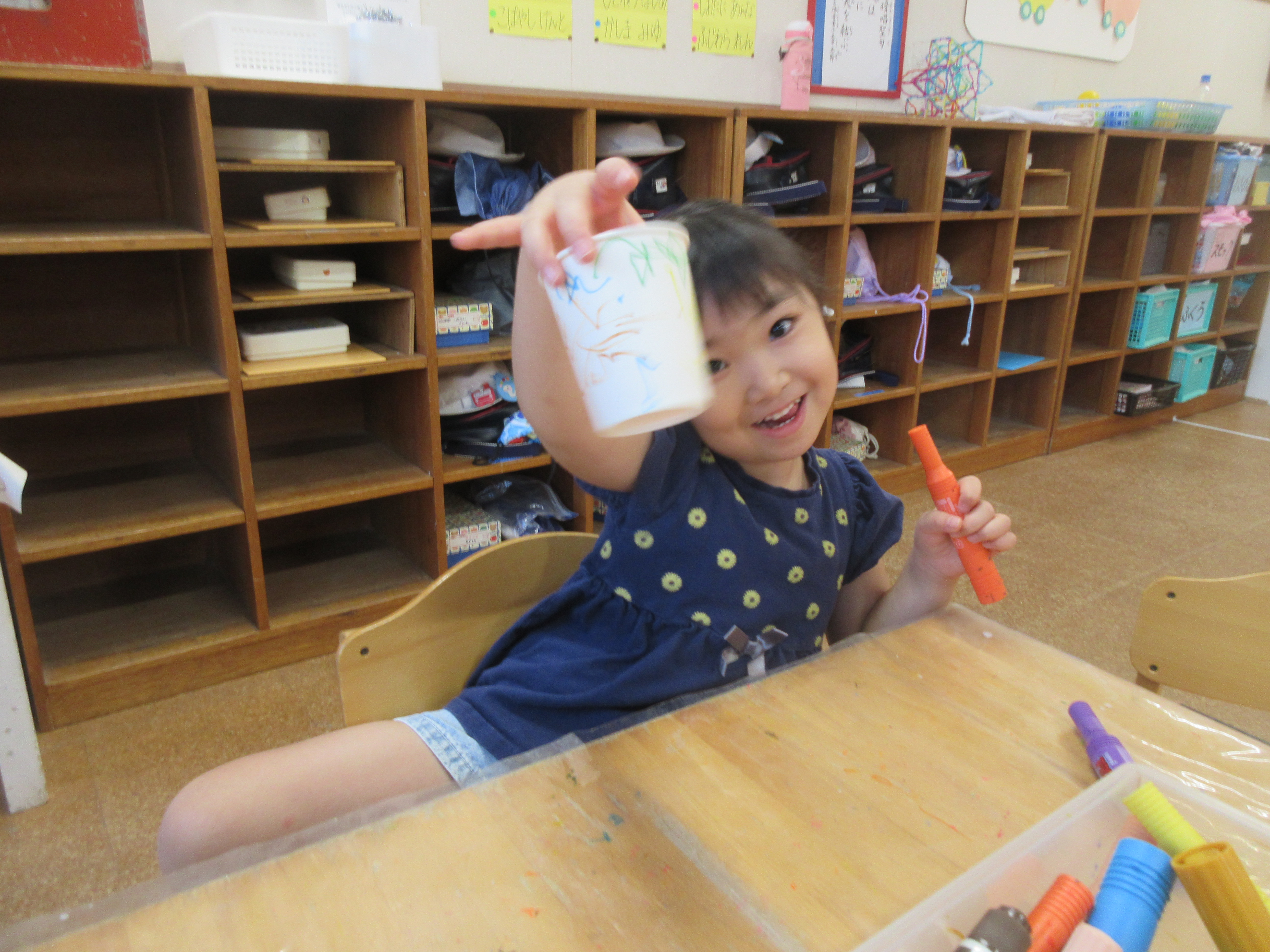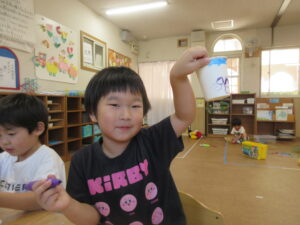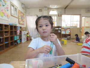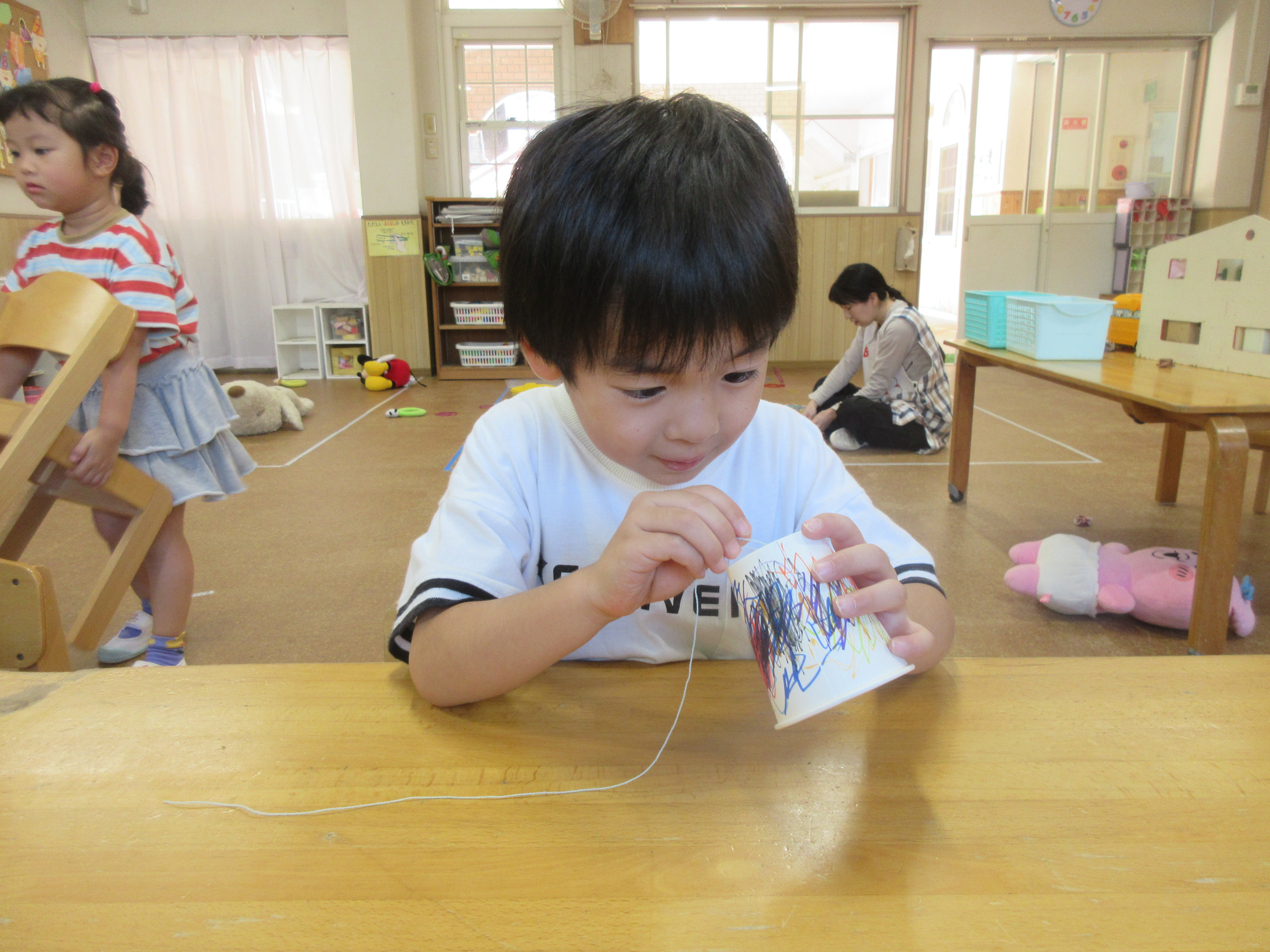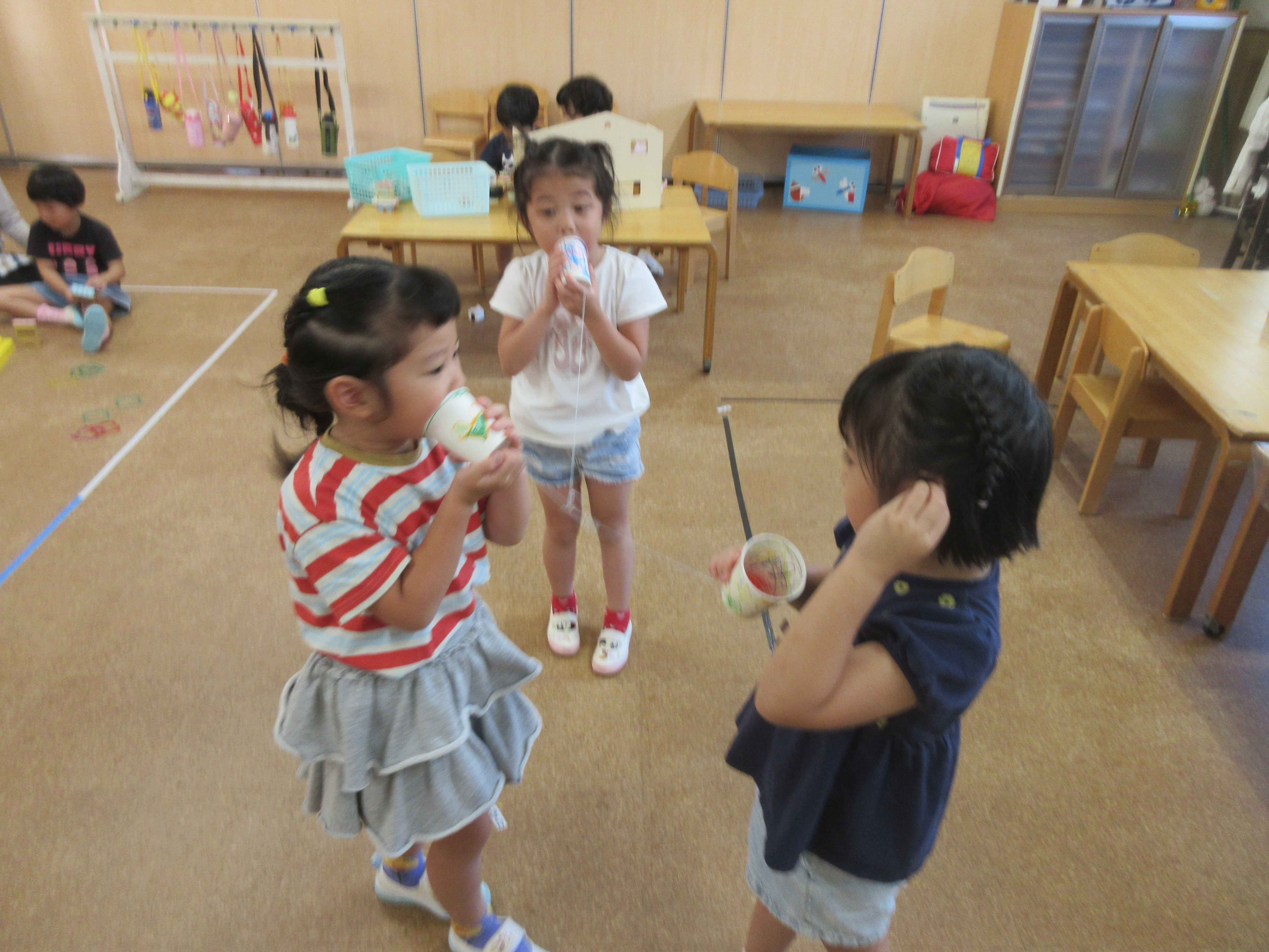 子どもたちと製作で糸電話を作りました。みんなでコップに好きな絵を描いて糸を通し完成させました!!みんなで繋げられる糸電話を楽しみました😊