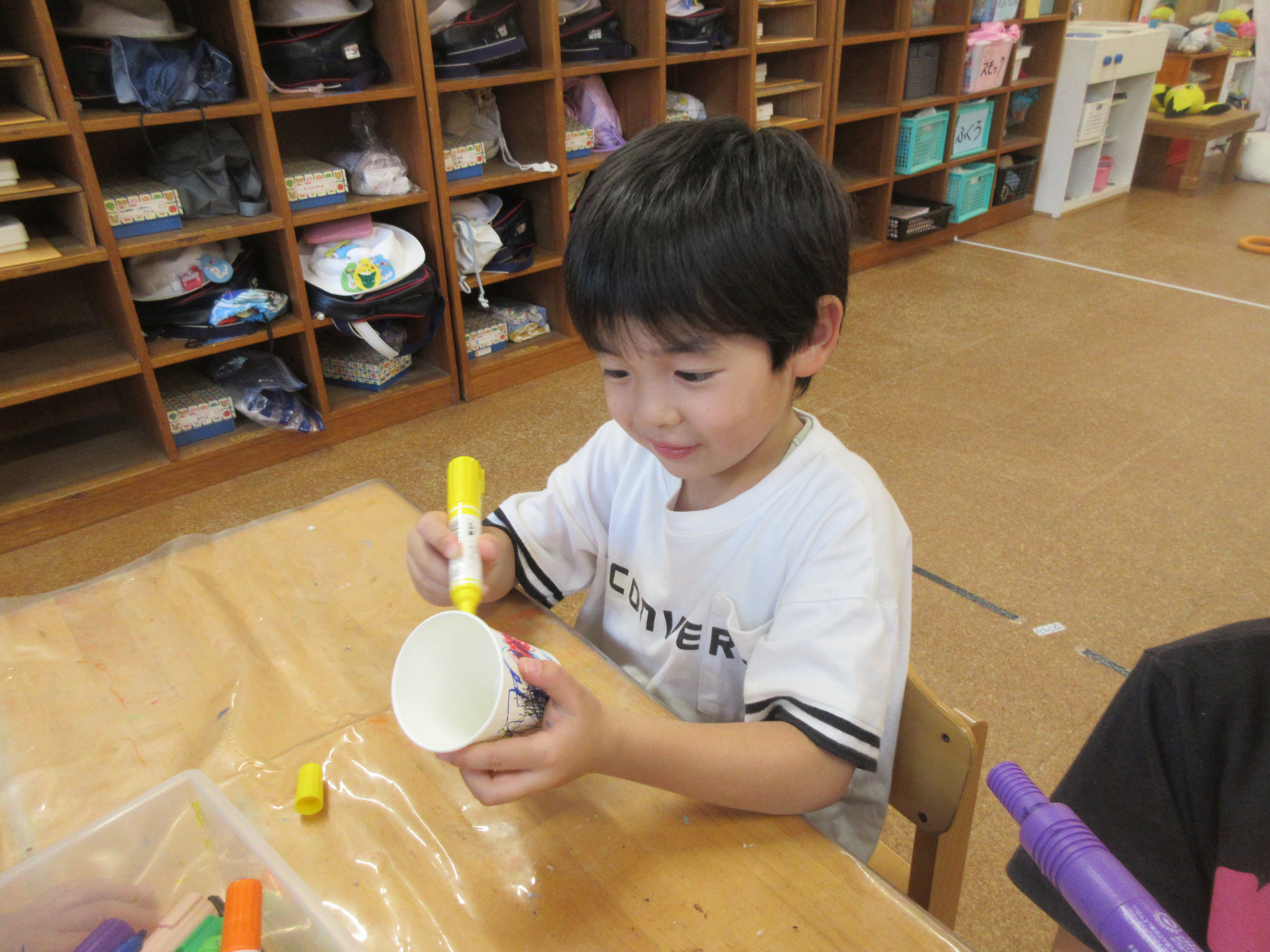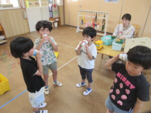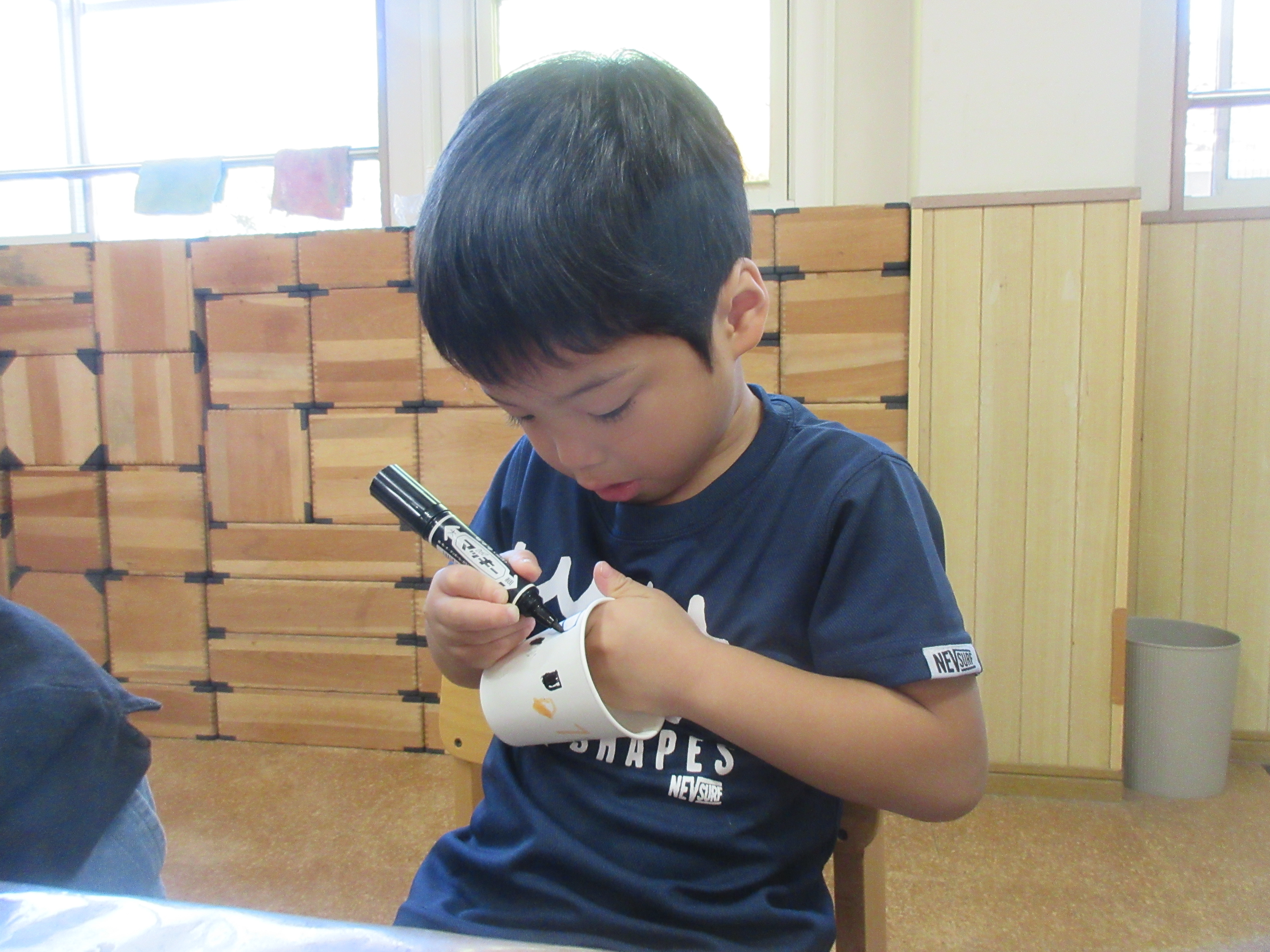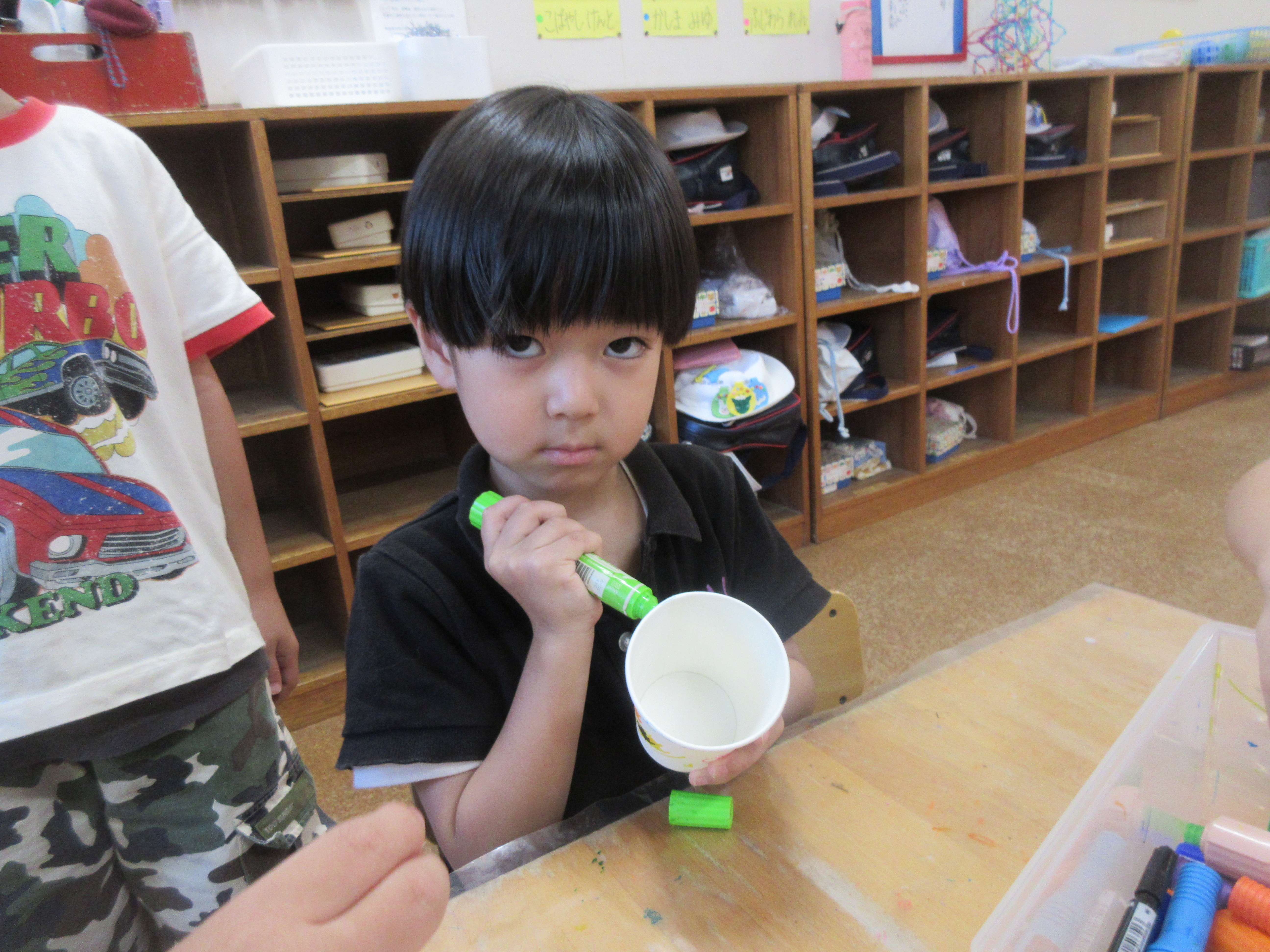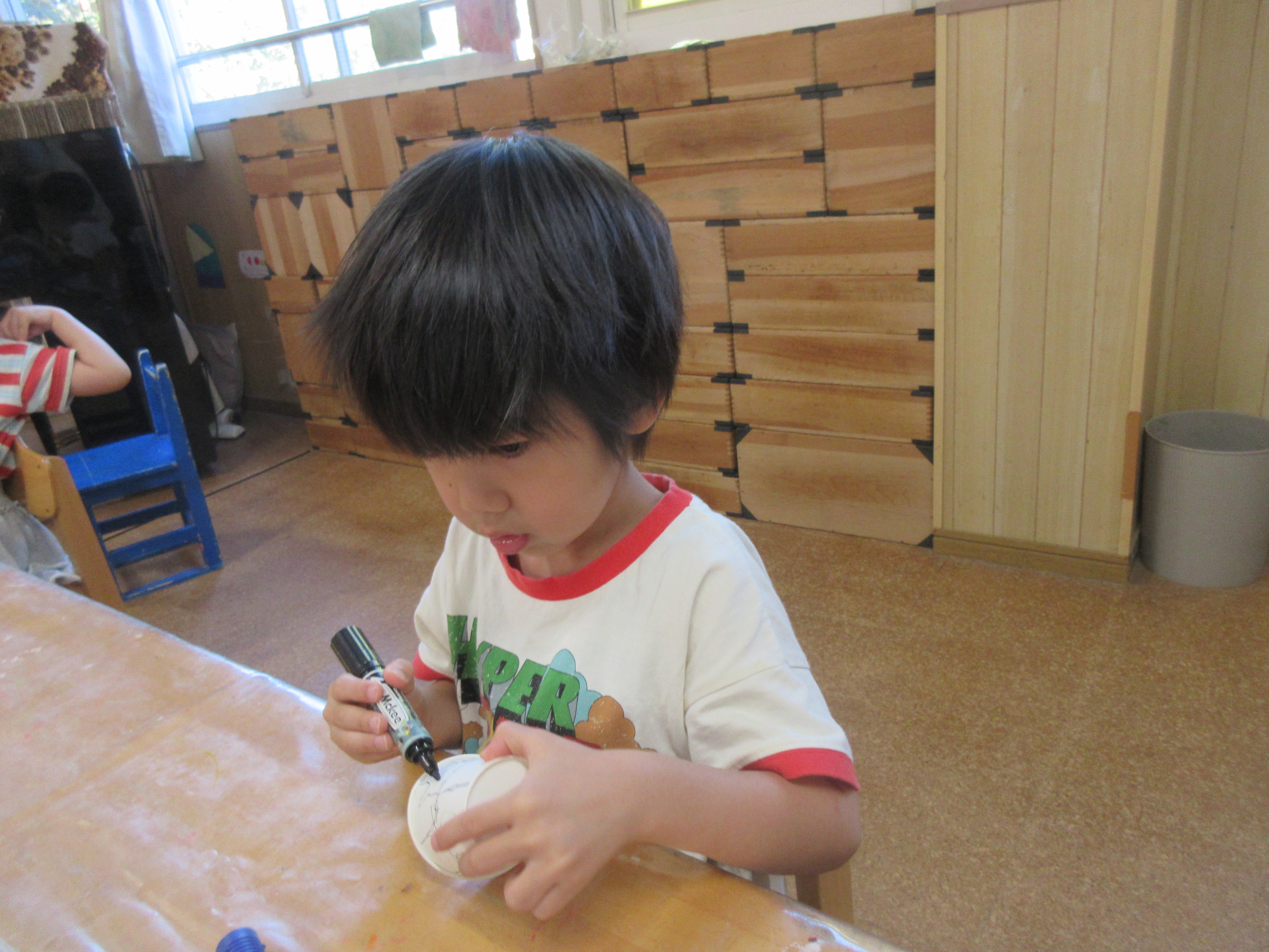 子どもたちと製作で糸電話を作りました。みんなでコップに好きな絵を描いて糸を通し完成させました!!みんなで繋げられる糸電話を楽しみました😊