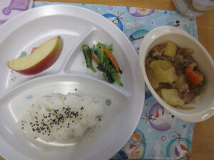今日の給食は(2号)ごはん・肉じゃが・お浸し・リンゴでした。