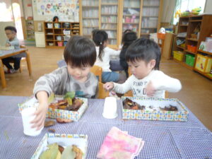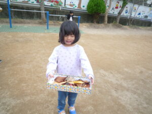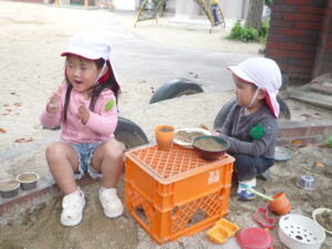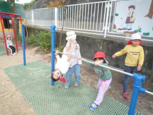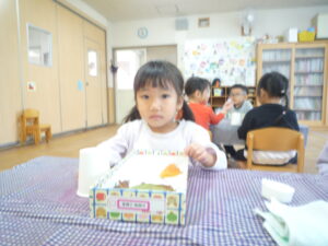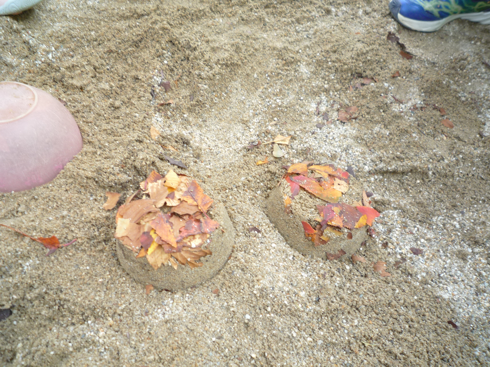 お外ではボールや鉄棒、お砂遊びとお友だちとお話をしながら楽しそうな姿が見られます(^^♪落ち葉でケーキを作ってみんなでお誕生日のパーティーをしました♡