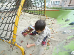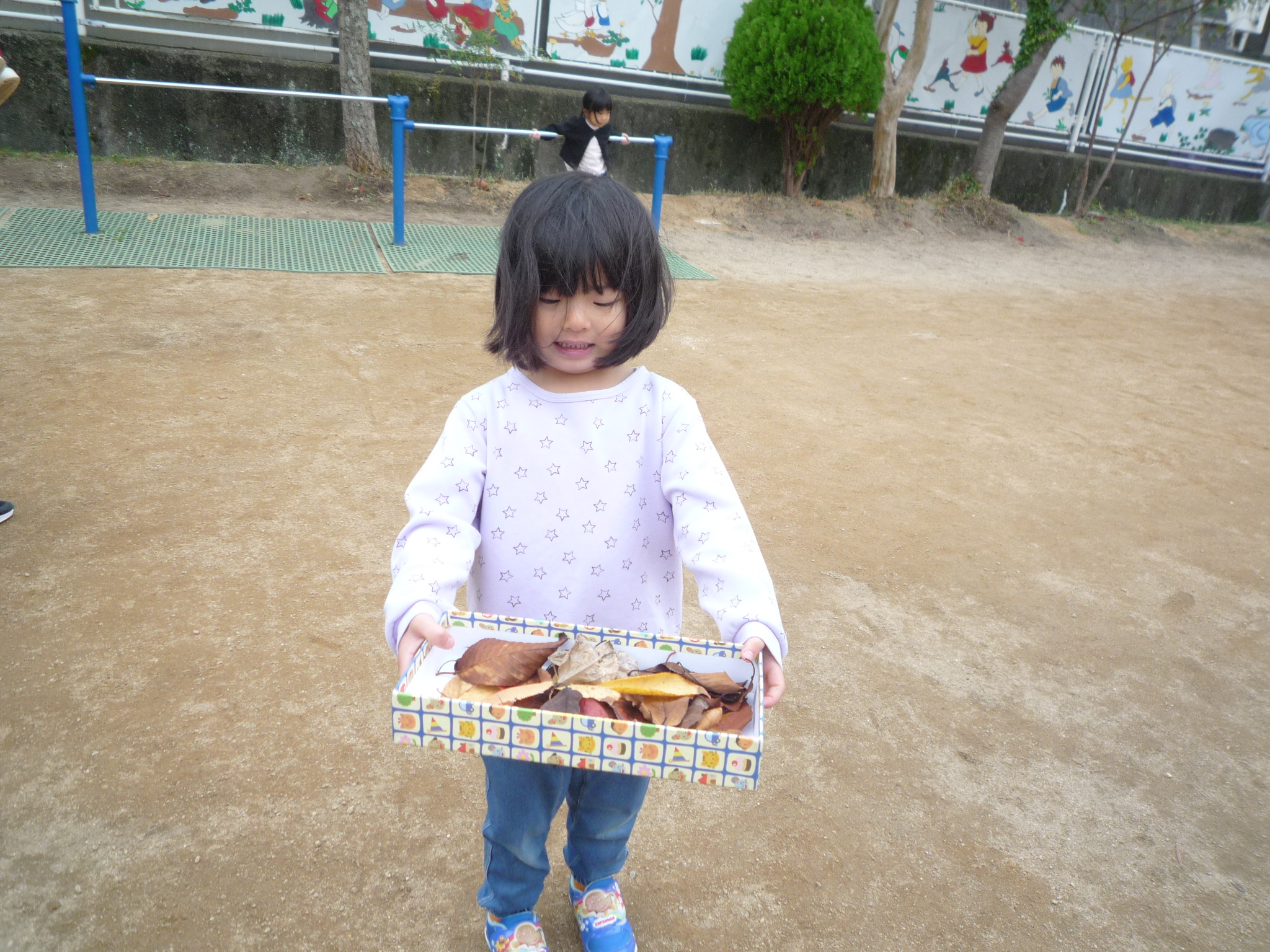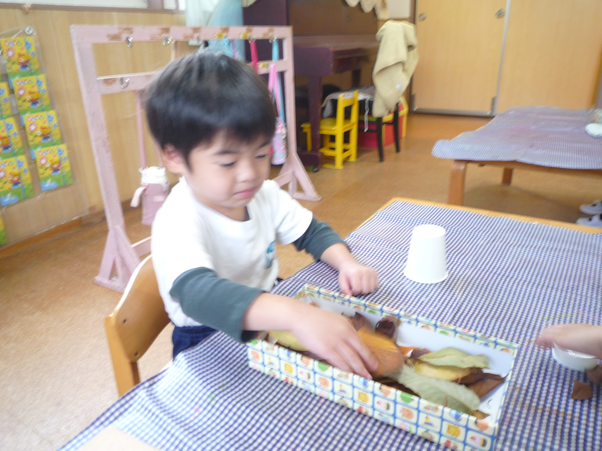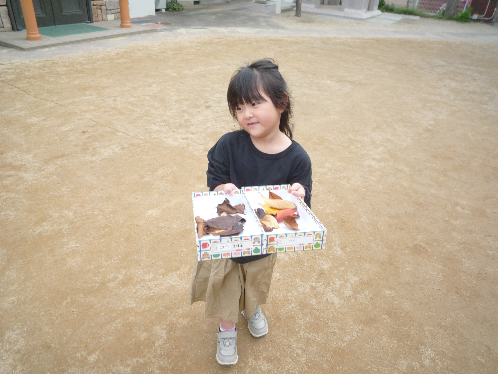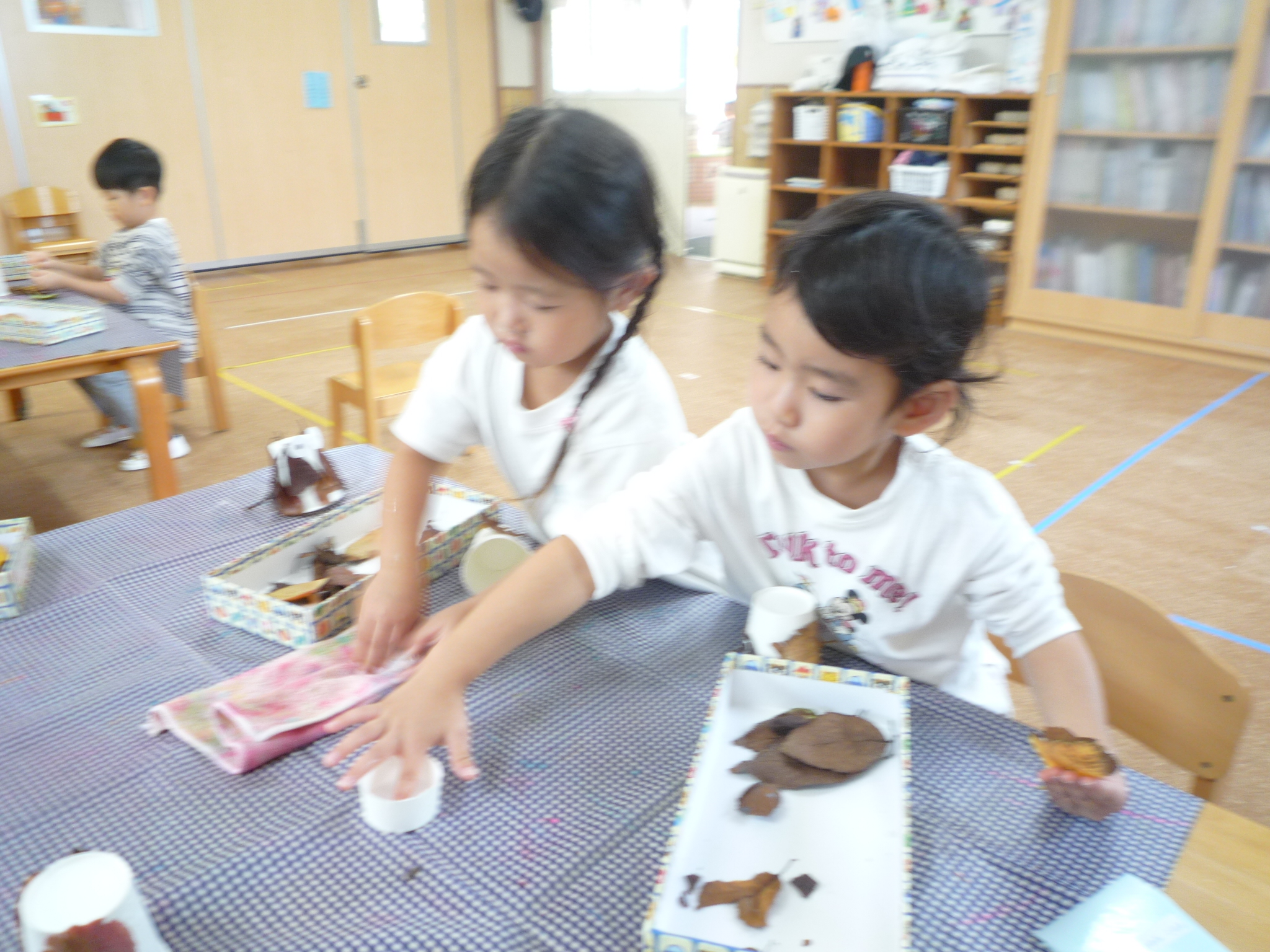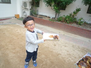 また、先日の製作の様子です!まずは、落ちている葉っぱを集めます!いろんな形、色に興味津々な子どもたち!