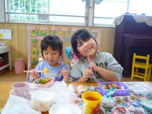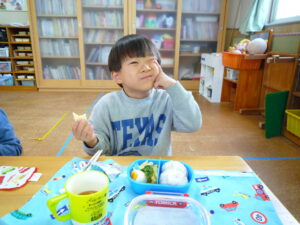 今日の昼食です!お弁当の日は、いつもより早く「お腹がすいたよ♡」と教えてくれる子どもたちです(^^)/今日もとっても美味しかったね!