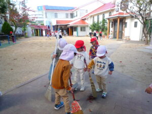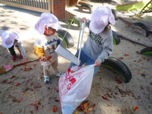 戸外遊び中に落ち葉のお掃除をしていると子どもたちも手伝ってくれてピカピカになりました🍂