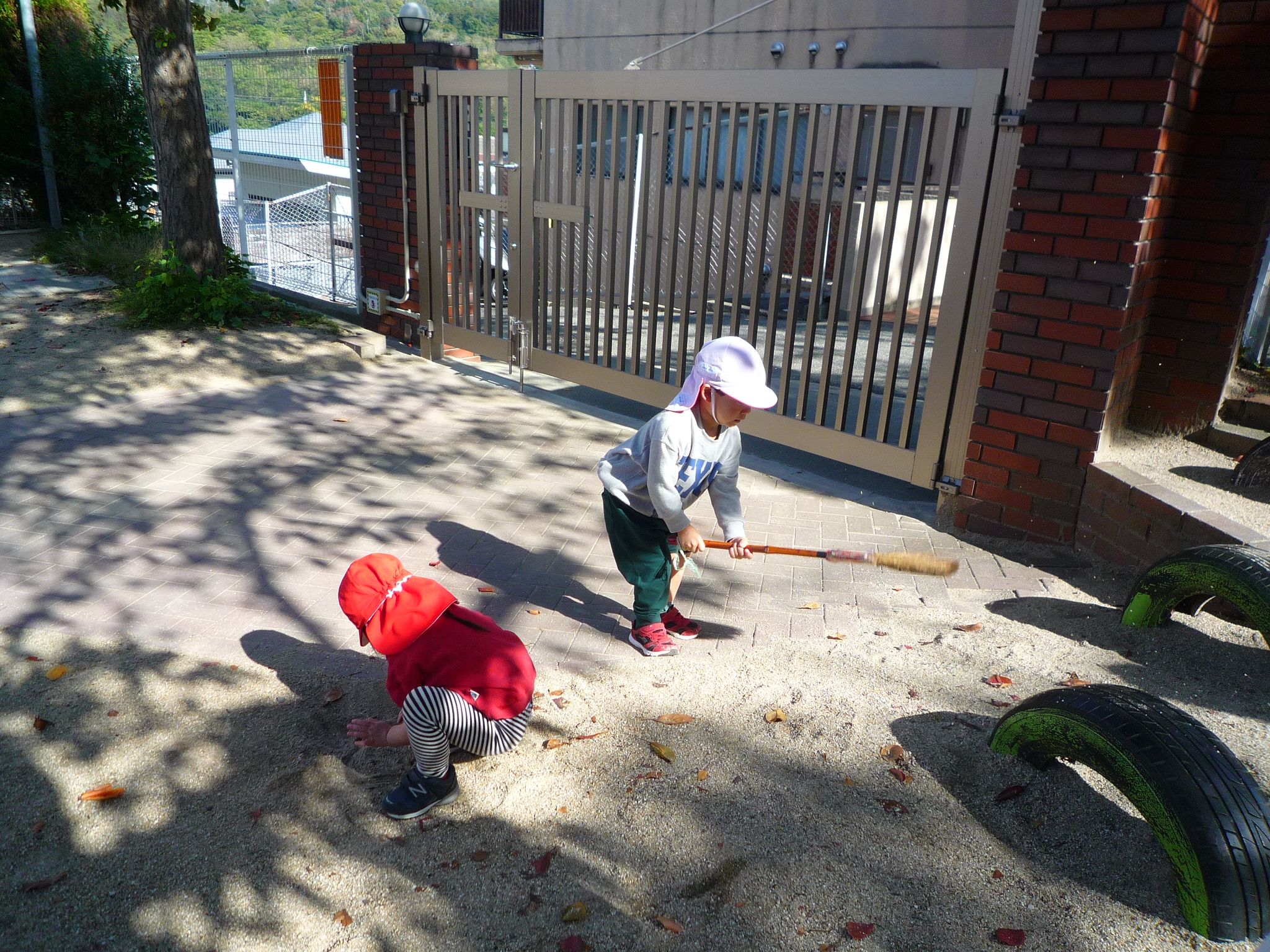 戸外遊び中に落ち葉のお掃除をしていると子どもたちも手伝ってくれてピカピカになりました🍂