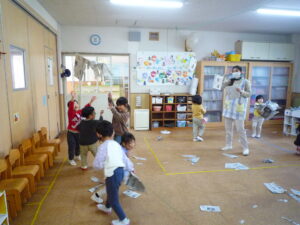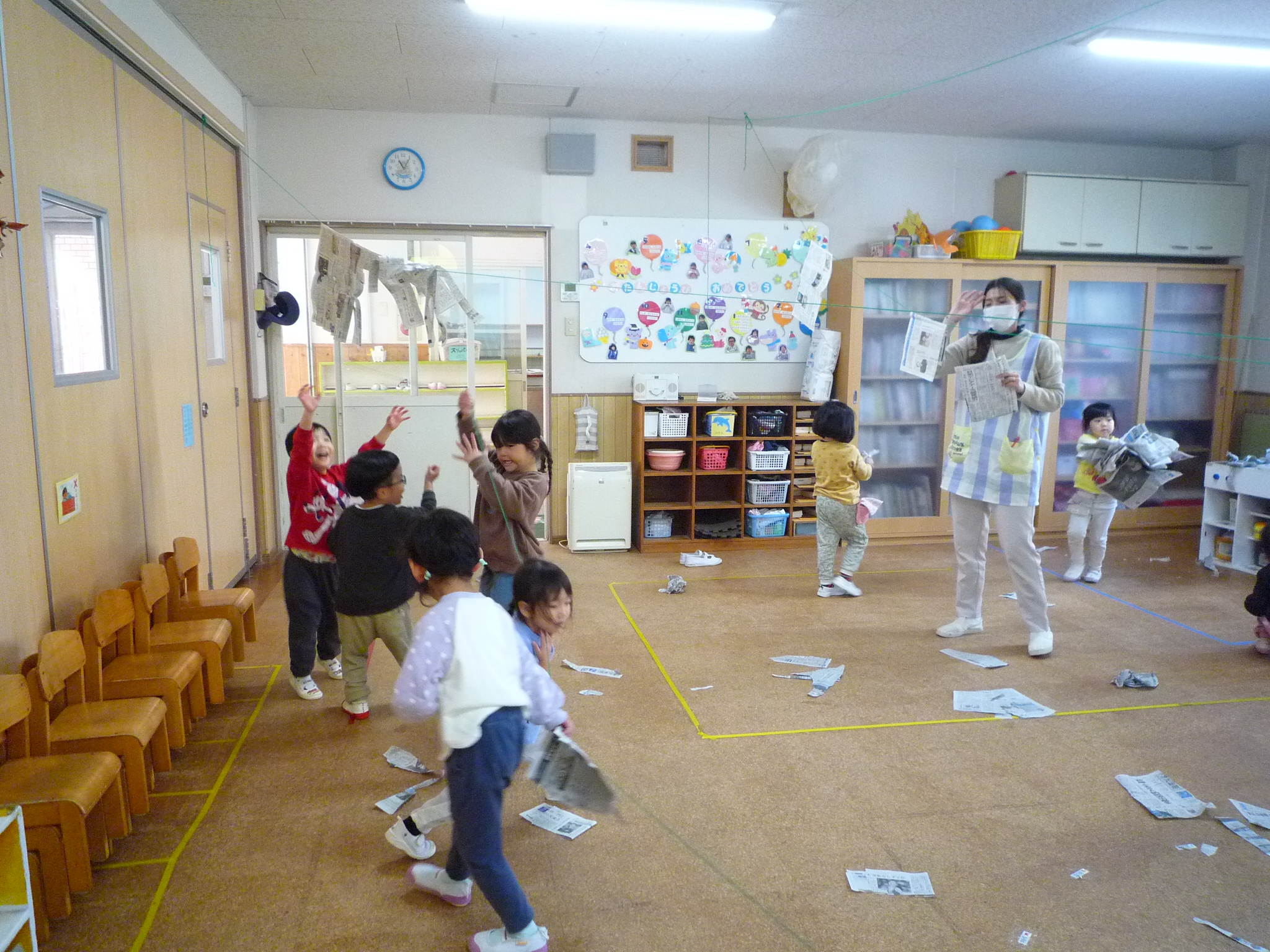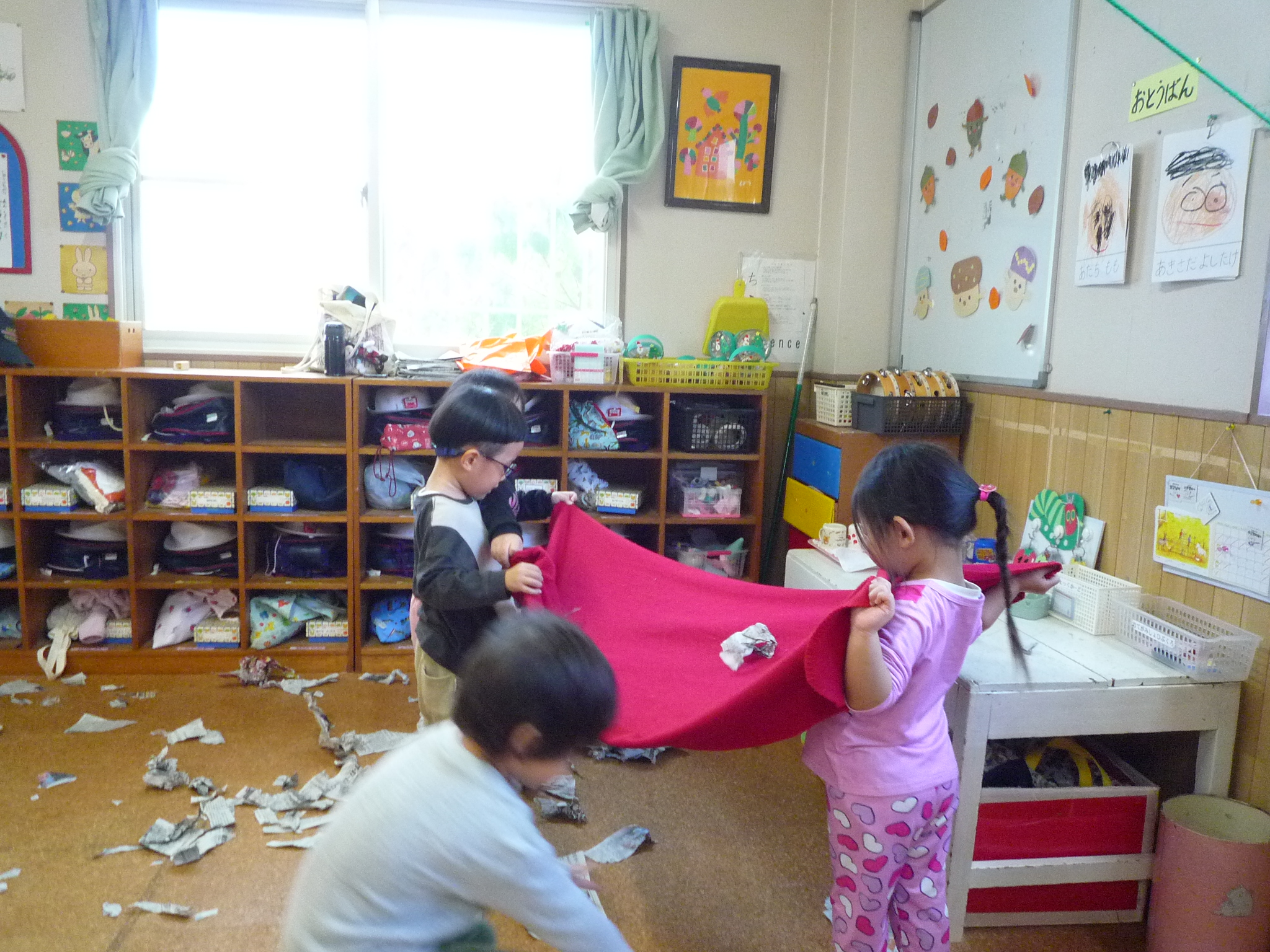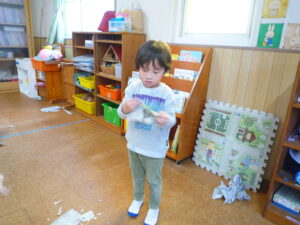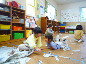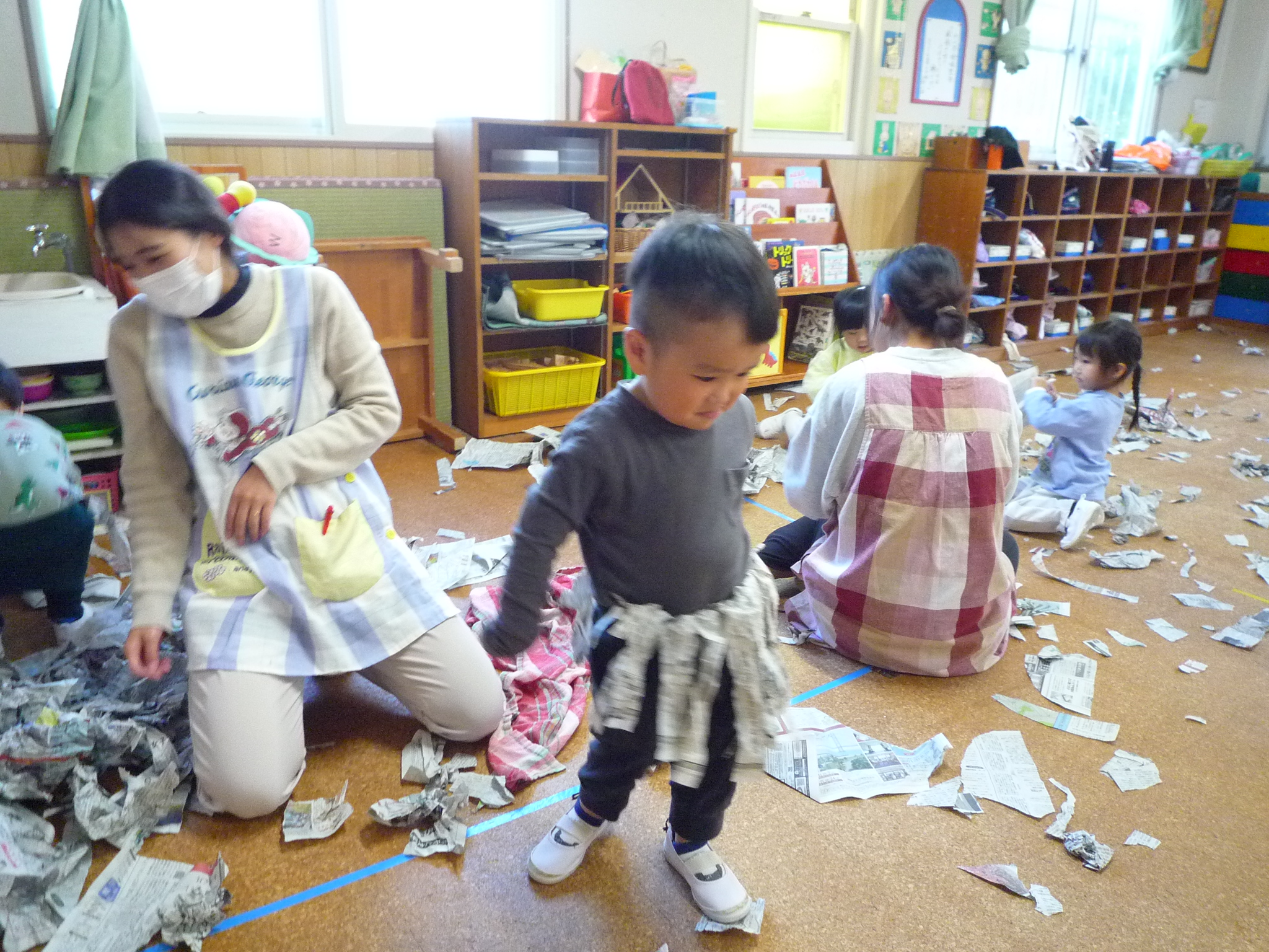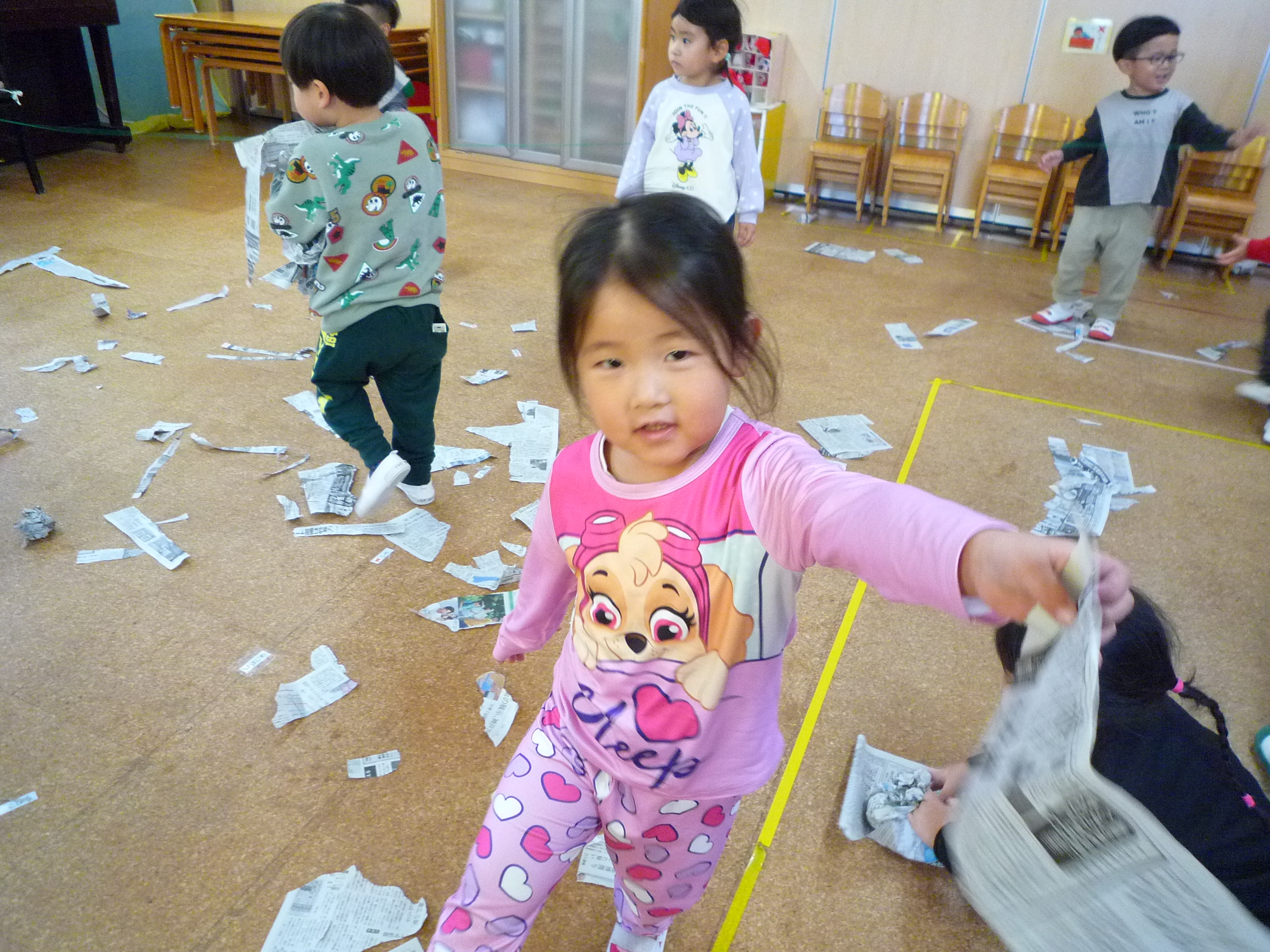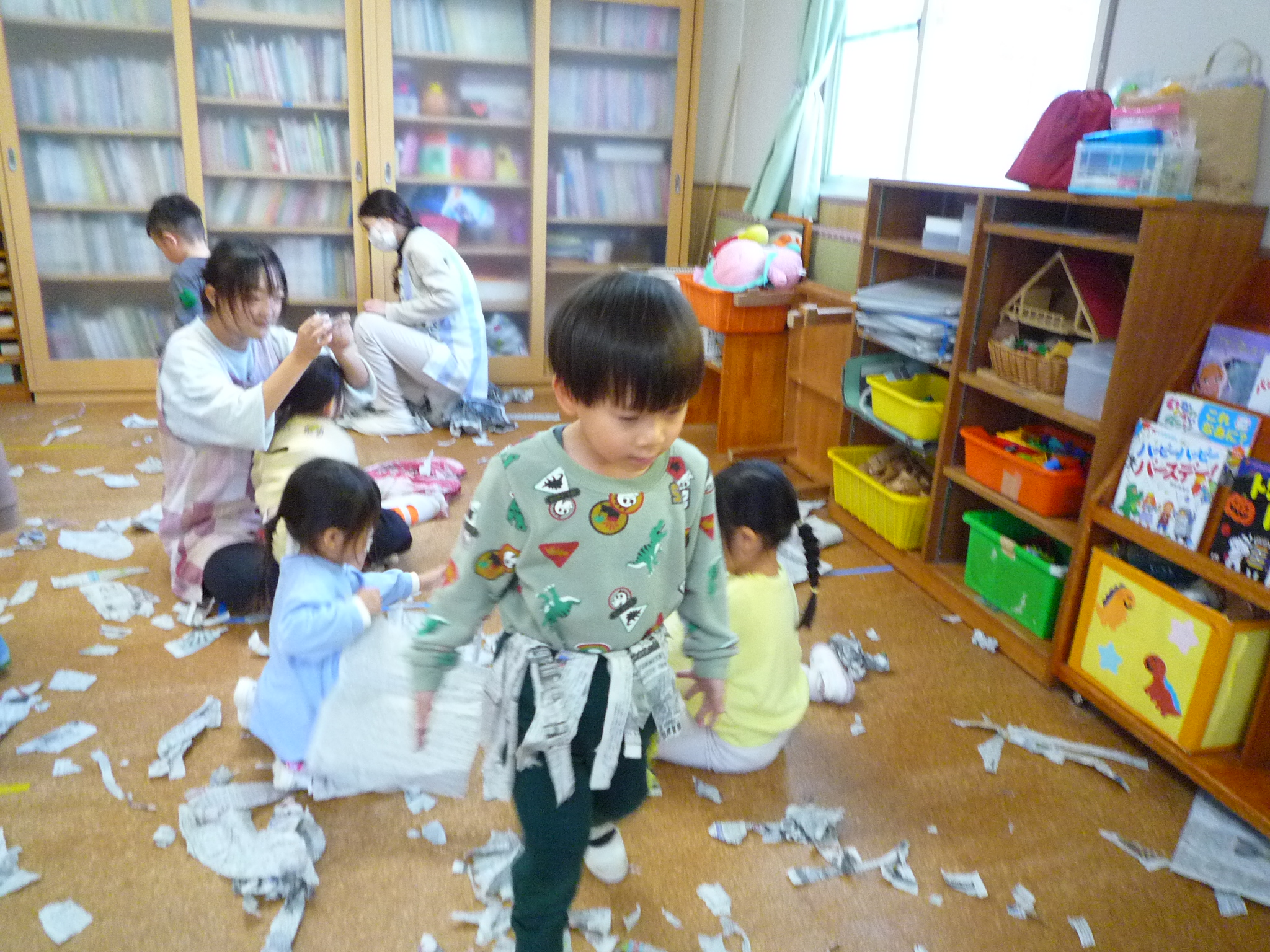 今日からまた新しい1週間が始まりましたね♬今日は新聞紙遊びをして遊びました(^^♪新聞紙のトンネルをくぐって遊んだり、新聞紙でお洋服を作ったり、細かくちぎったり、思い思いに遊ぶ子どもたちでした(^_^)/~