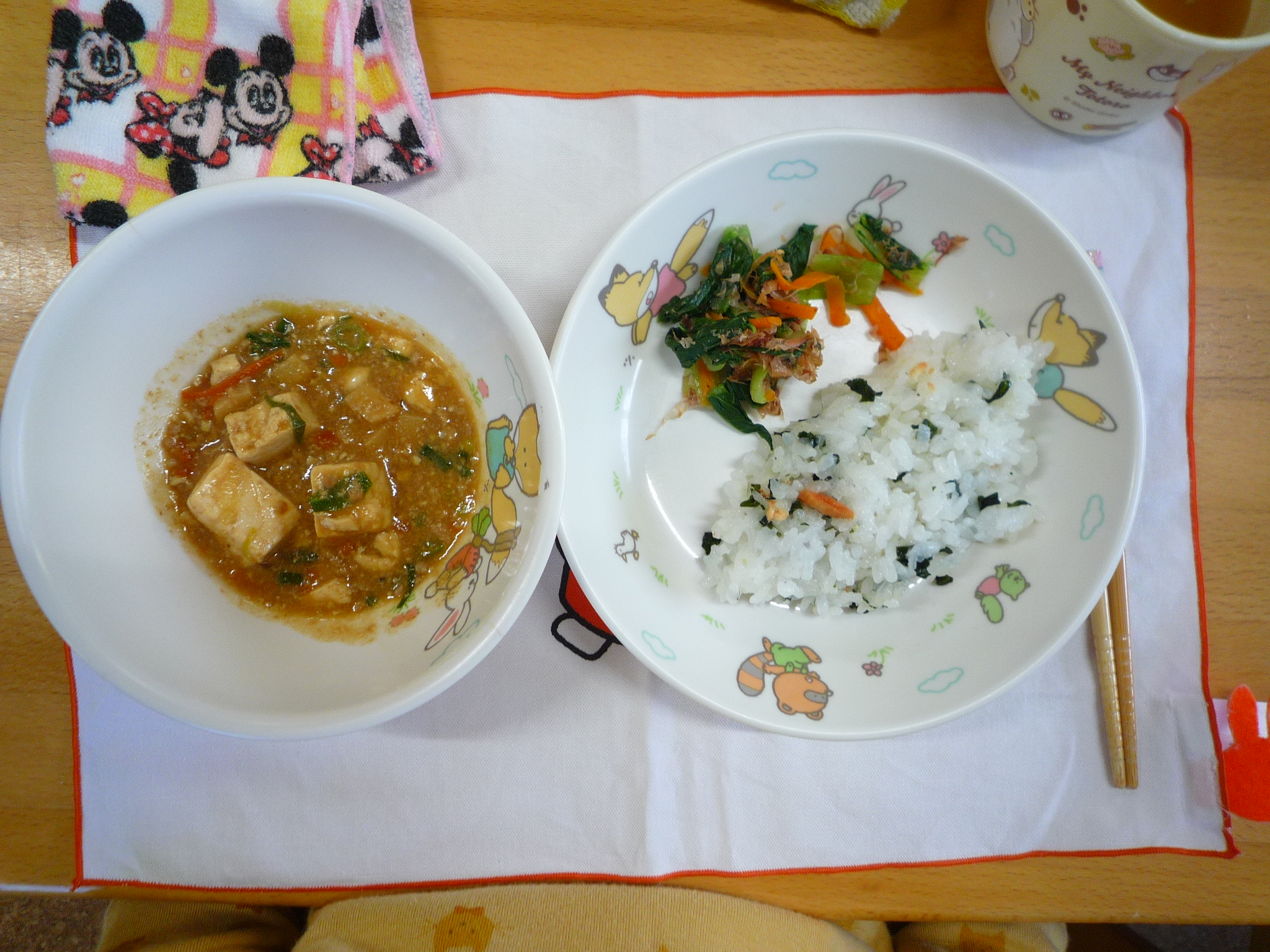 今日の給食は、麻婆豆腐、お浸しごはんでした!美味しかったね♡
