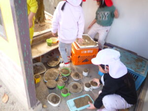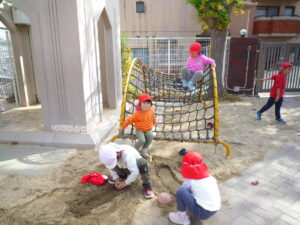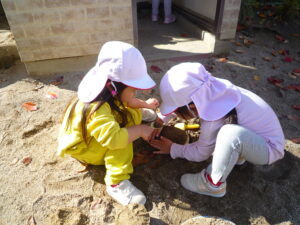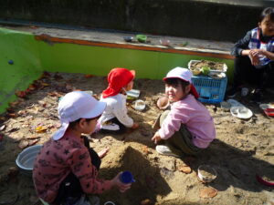 予行練習の後はお外で元気いっぱい遊びました♡お空に飛ぶ飛行機を見たり、お砂でお料理を作ったりお友だちと楽しく遊ぶ姿が見られました(^^♪