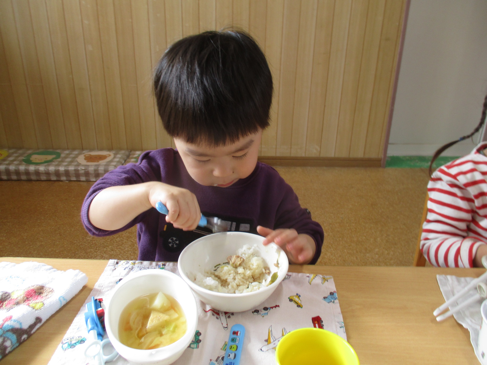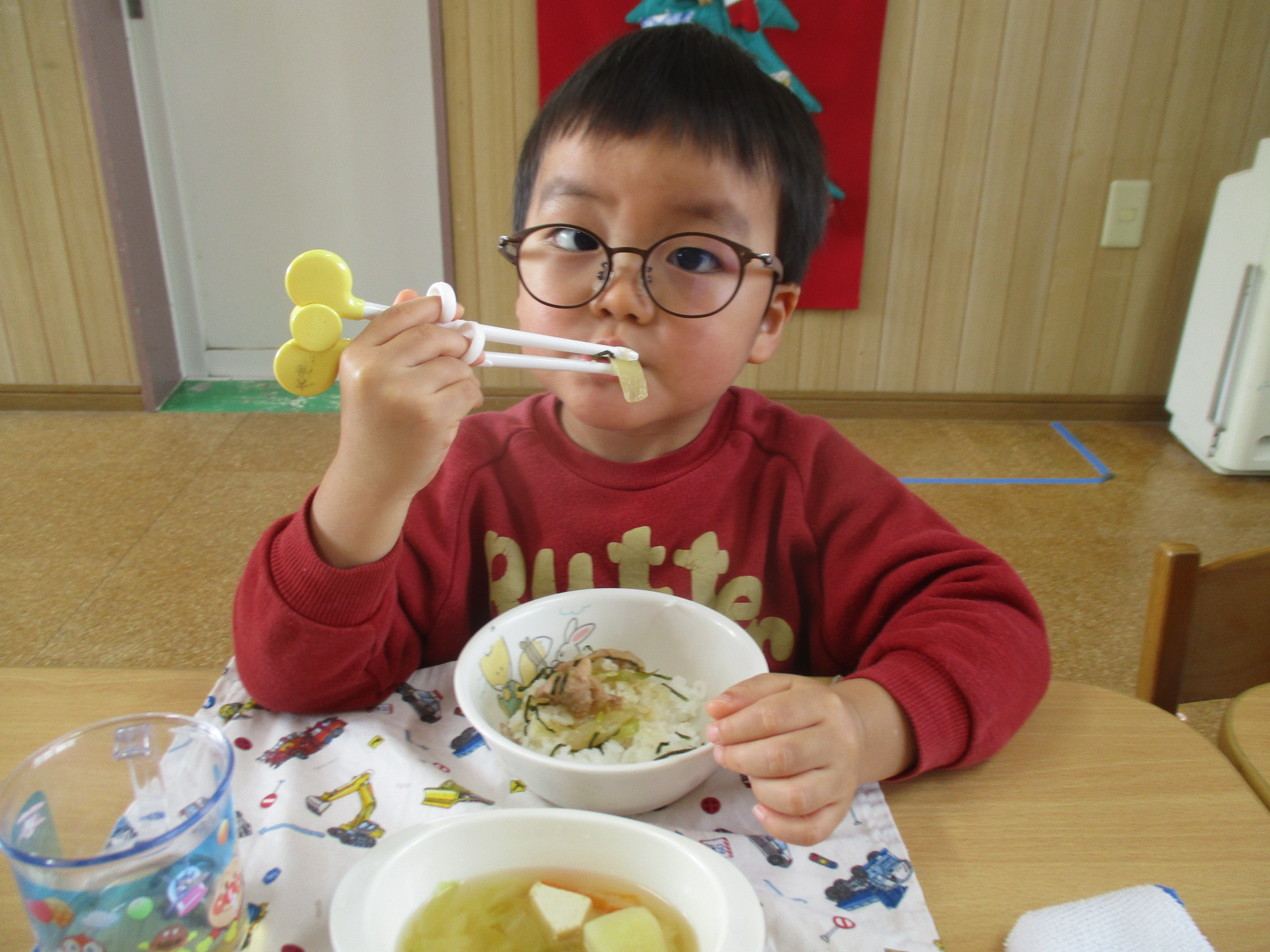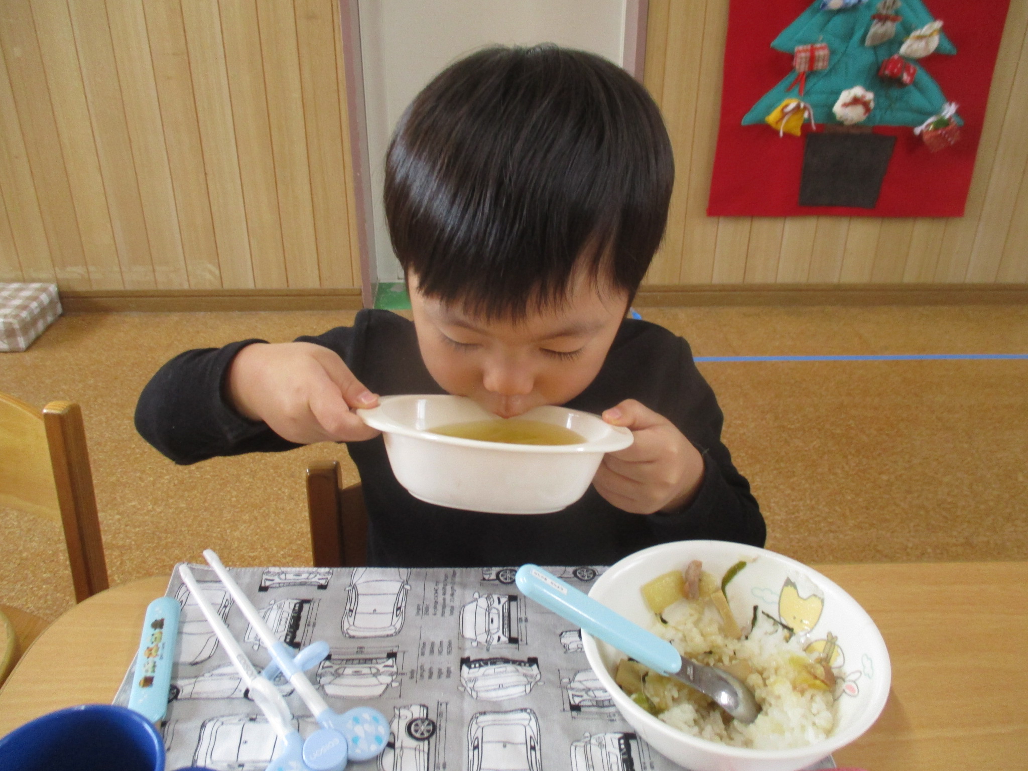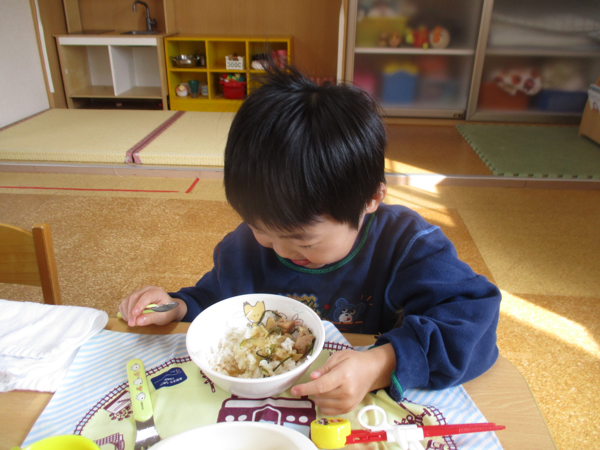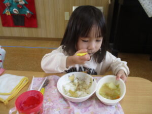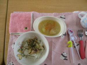 今日の給食は、焼きとり丼とみそ汁でした!みんなおかわりしていました🍚!