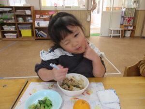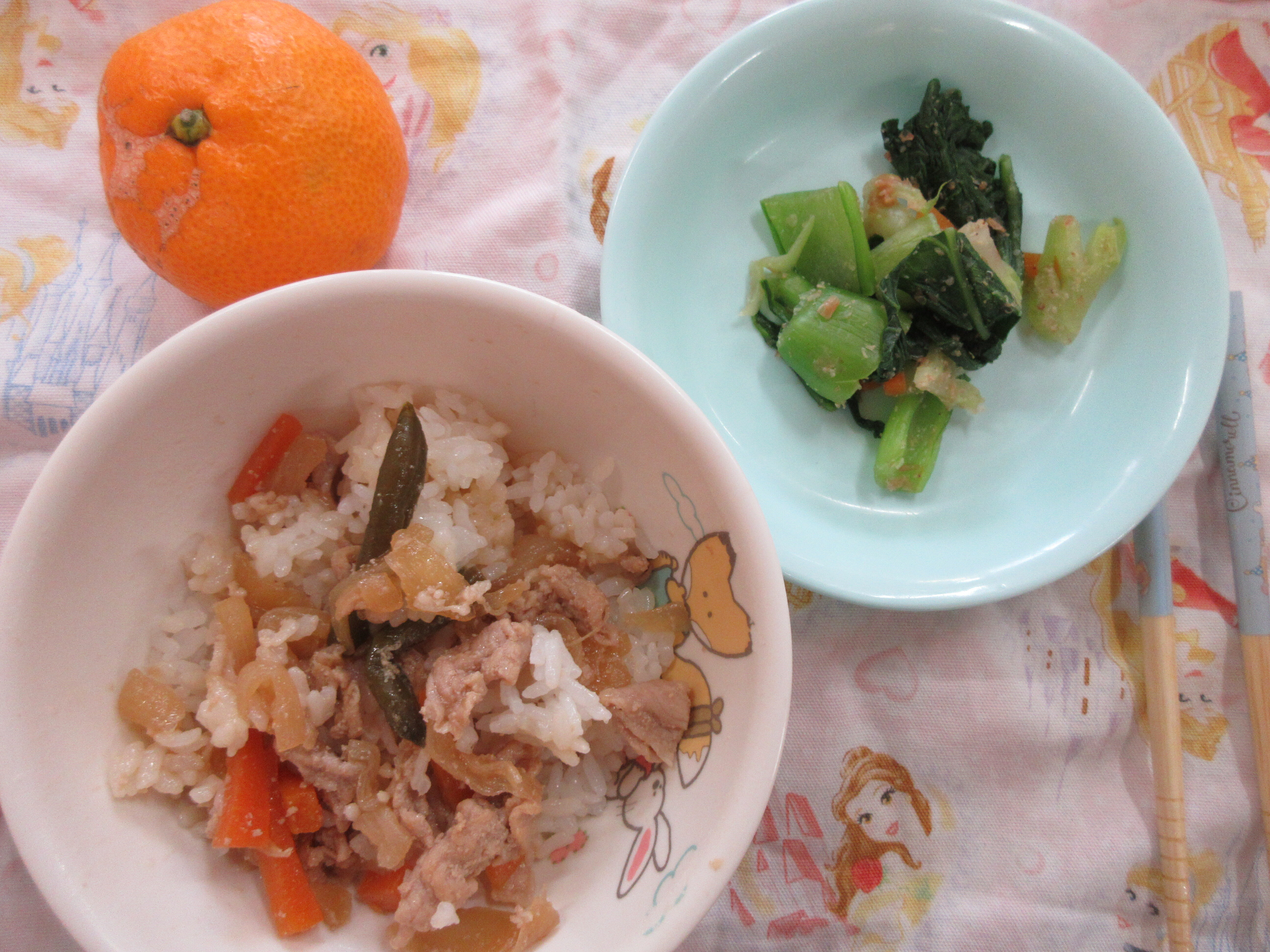 今日の給食は(2号)豚丼・お浸し・みかんでした。
