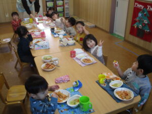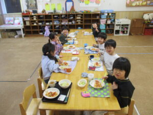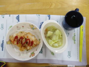 今日の給食は、チキンライスと野菜スープです😊お腹がすいていたのかみんな食べるのがとても速かったです✨