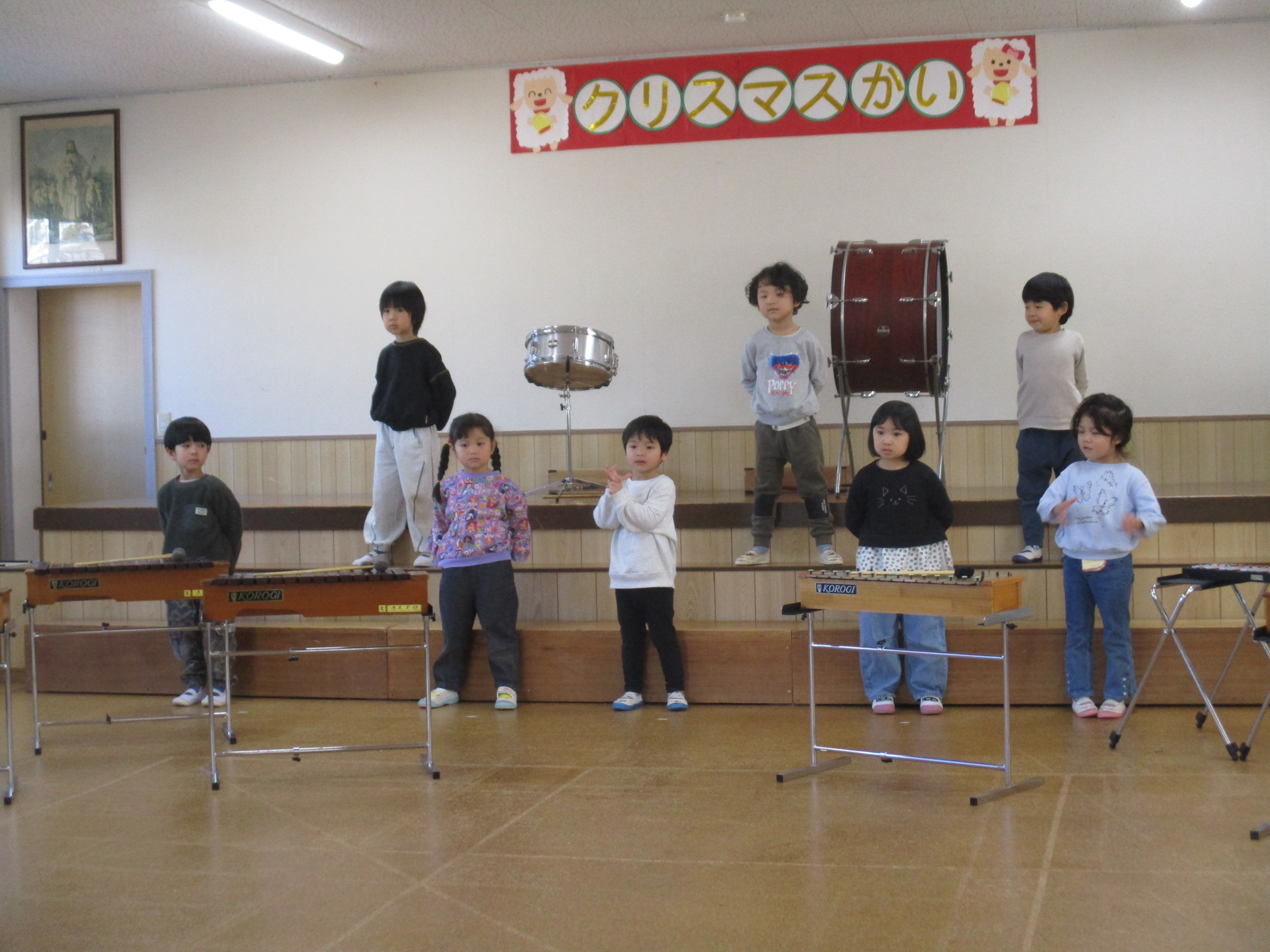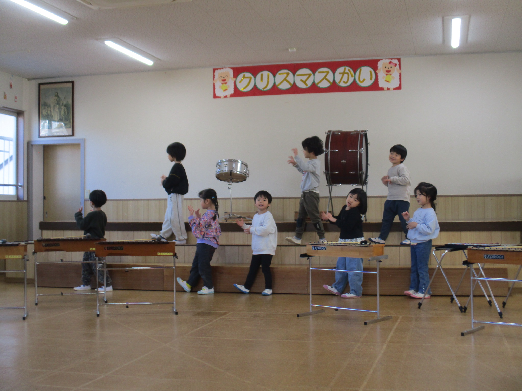 クリスマス会に向けて、沢山練習もしています✨たんぽぽ組とすみれ組の練習の様子です♪合奏と歌の練習をしています。大きな声で元気よく歌ったり、みんなとリズムを合わせて楽器を鳴らします。クリスマス会まで、あと一週間です、とても楽しみですね😊