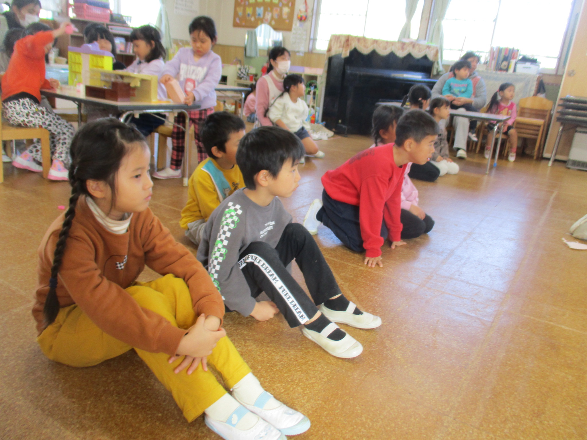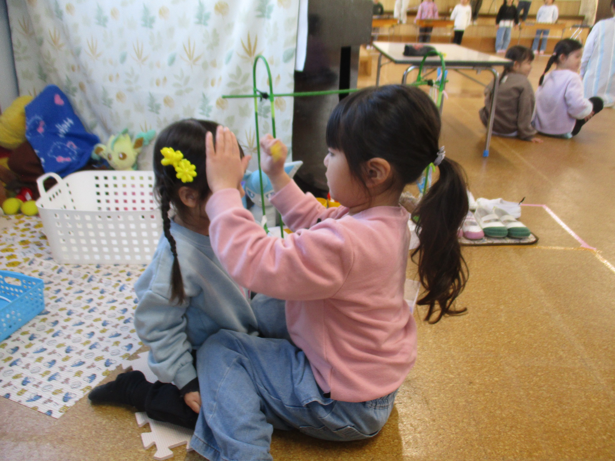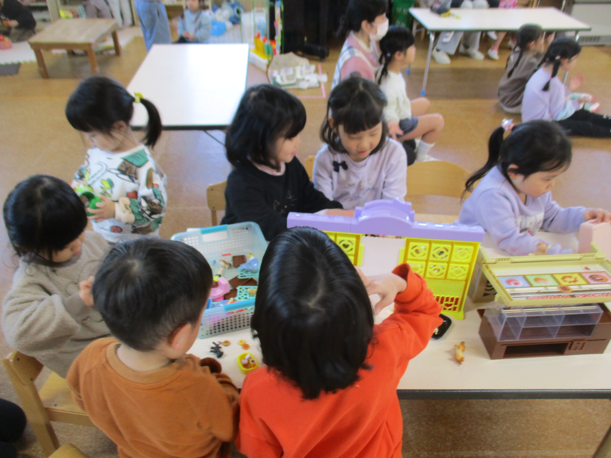 ゆり組のお部屋でも遊びました✨おままごとでおしゃれをしたり、ドーナツ屋さんの玩具で遊んだりしています。横でクリスマス会の練習をしているのを見守る子どももいました😊