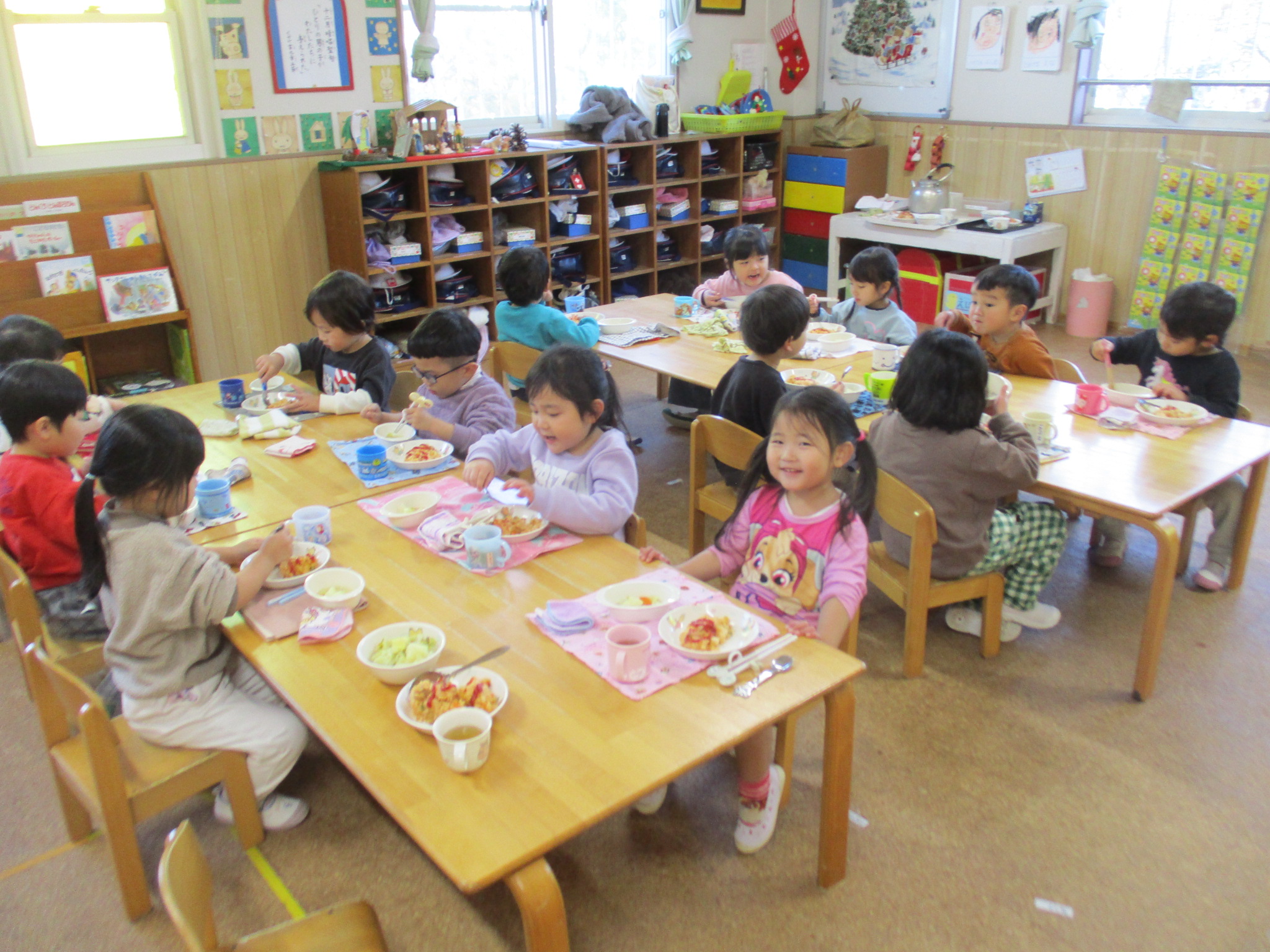 今日の給食は、チキンライスと野菜スープです😊お腹がすいていたのかみんな食べるのがとても速かったです✨