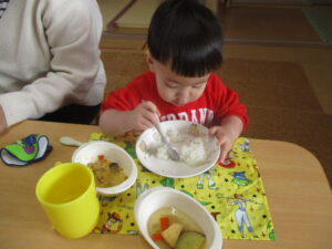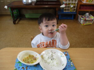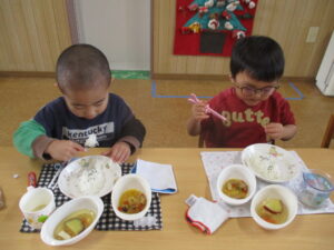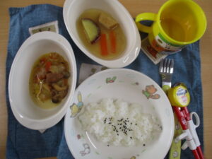 今日の給食は、ごはんととり野菜炒めとみそ汁でした!